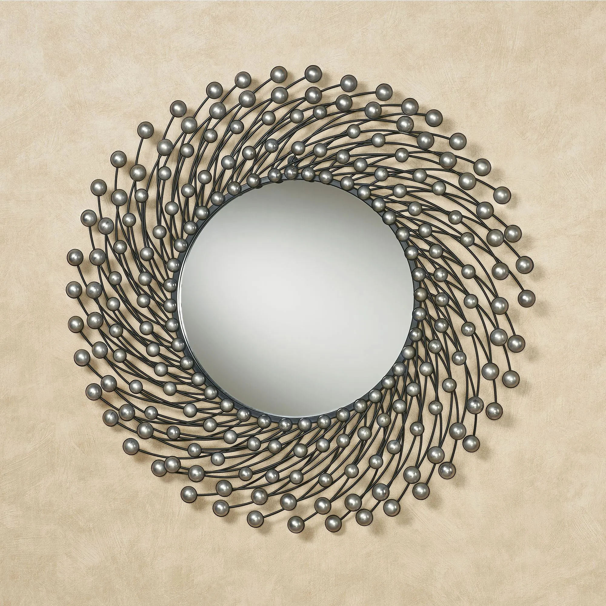 The Dreana Metal Wall Mirror presents a hypnotizing design that will reflect rich, bold sophistication in a dazzling fashion. Round metal wall mirror features a spiraling black frame around the 14" dia. mirror with silver disc accents throughout. Measures 28"dia.x1.5"D.