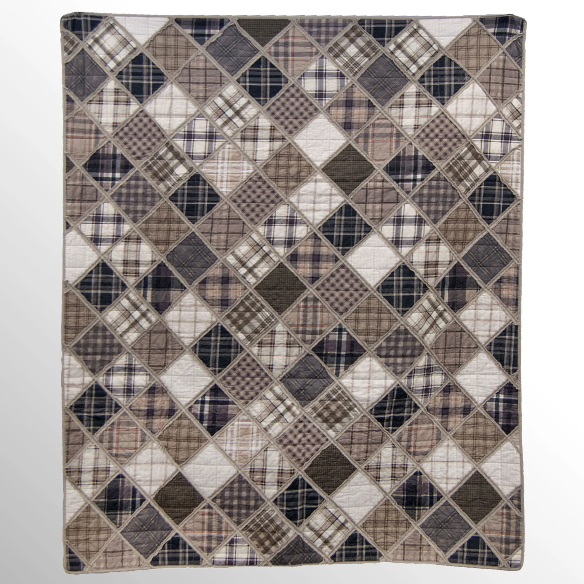 Enjoy the classic style of the Driftwood Patchwork Bedding from Your Lifestyle(R) by Donna Sharp(R). The Mini Quilt Set includes a quilt and sham(s). The pure cotton bedding features a patchwork design of plaid diamonds separated by trim. Colors include beige, tan, black, charcoal, cream, taupe, and ivory. Quilt has a beige cotton back. Fill is a cotton/polyester blend. Machine washable. Imported.