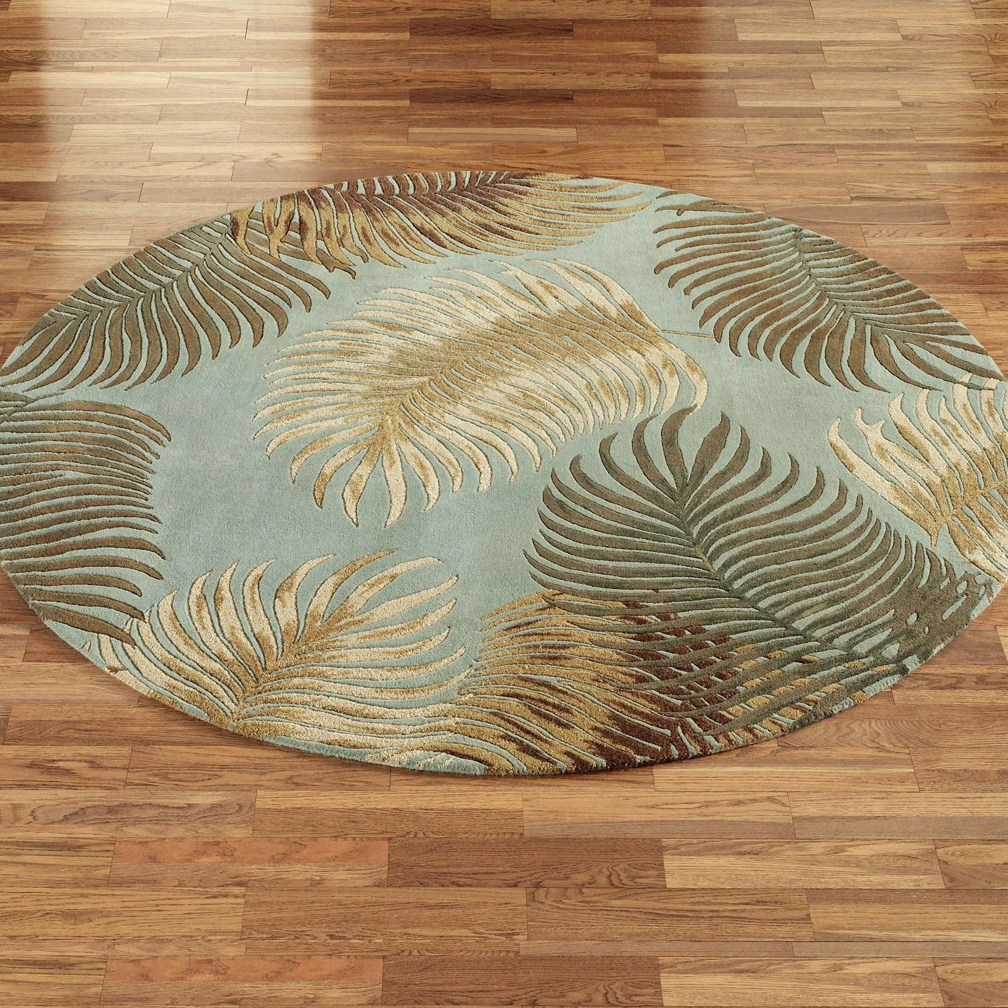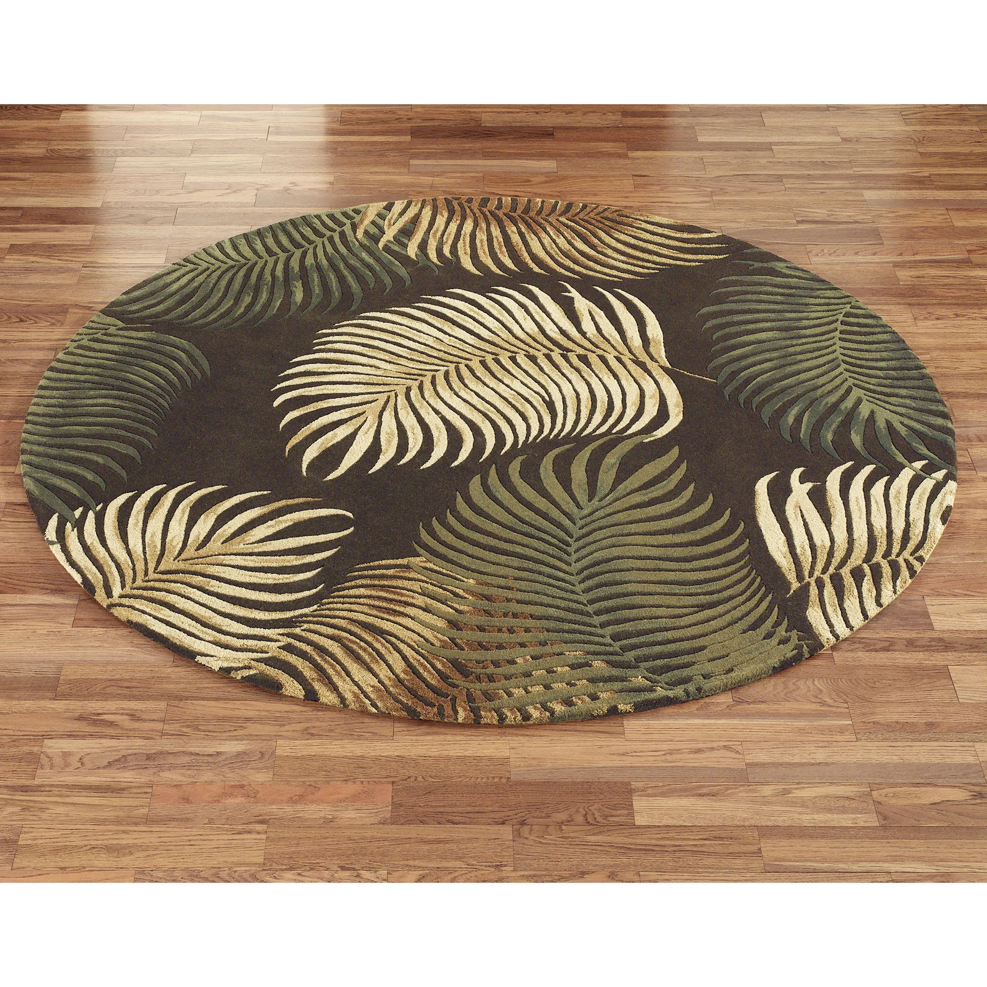 The tropical Fern View Round Rugs evoke the beauty of the forest's floor, allowing you to almost hear the rustle beneath your feet. Handcarved leaves have tones of beige, mocha, deep brown, green, and light beige. Design may vary by size.