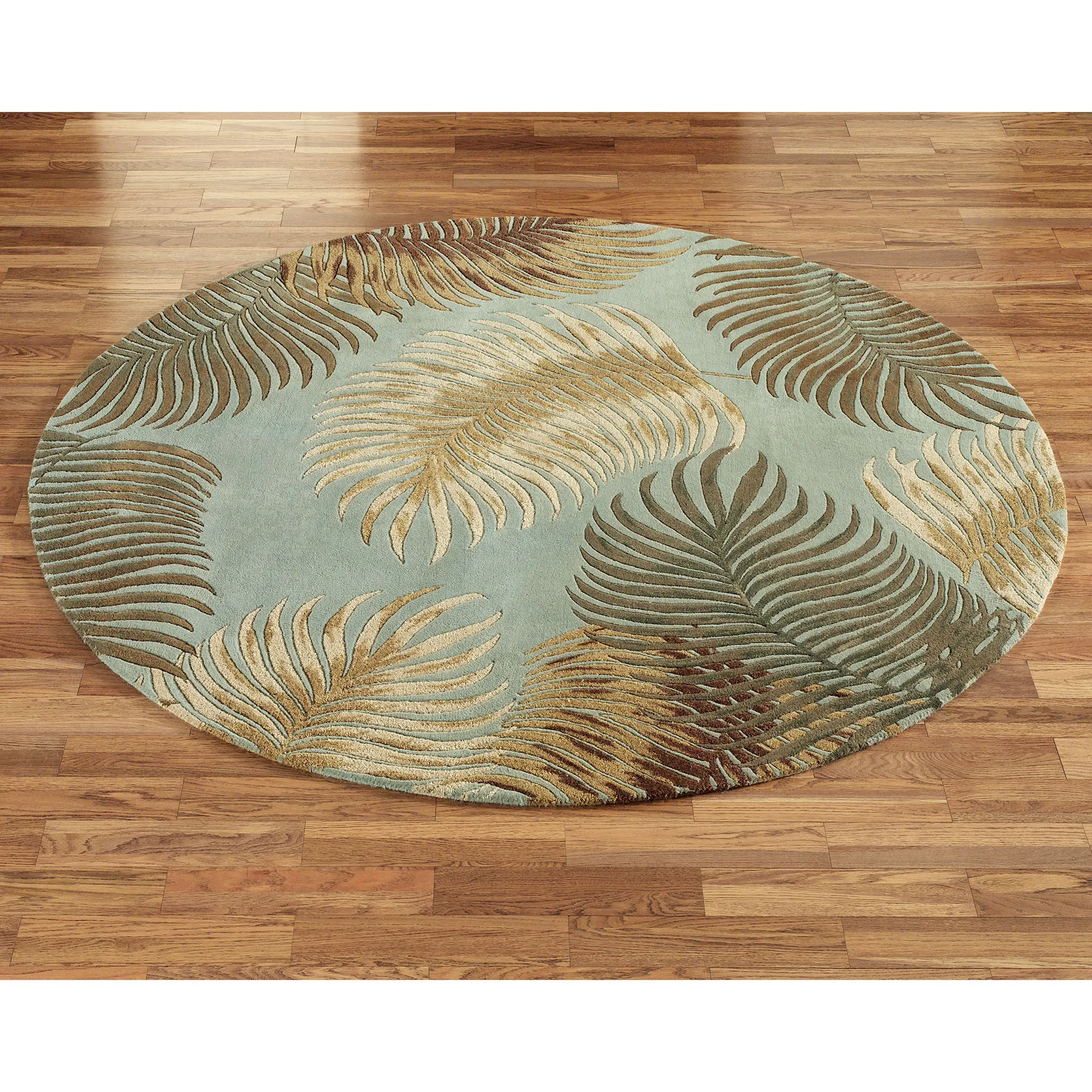 Fern View Round Rugs will remind you of the beauty of the forest floor. Tropical round rugs, .5" thick, are hand-tufted from multi-textured wool with hard-twist accents and display handcarved, oversized fern leaves on a solid color. We recommend professional cleaning by a rug cleaner. Made in India.