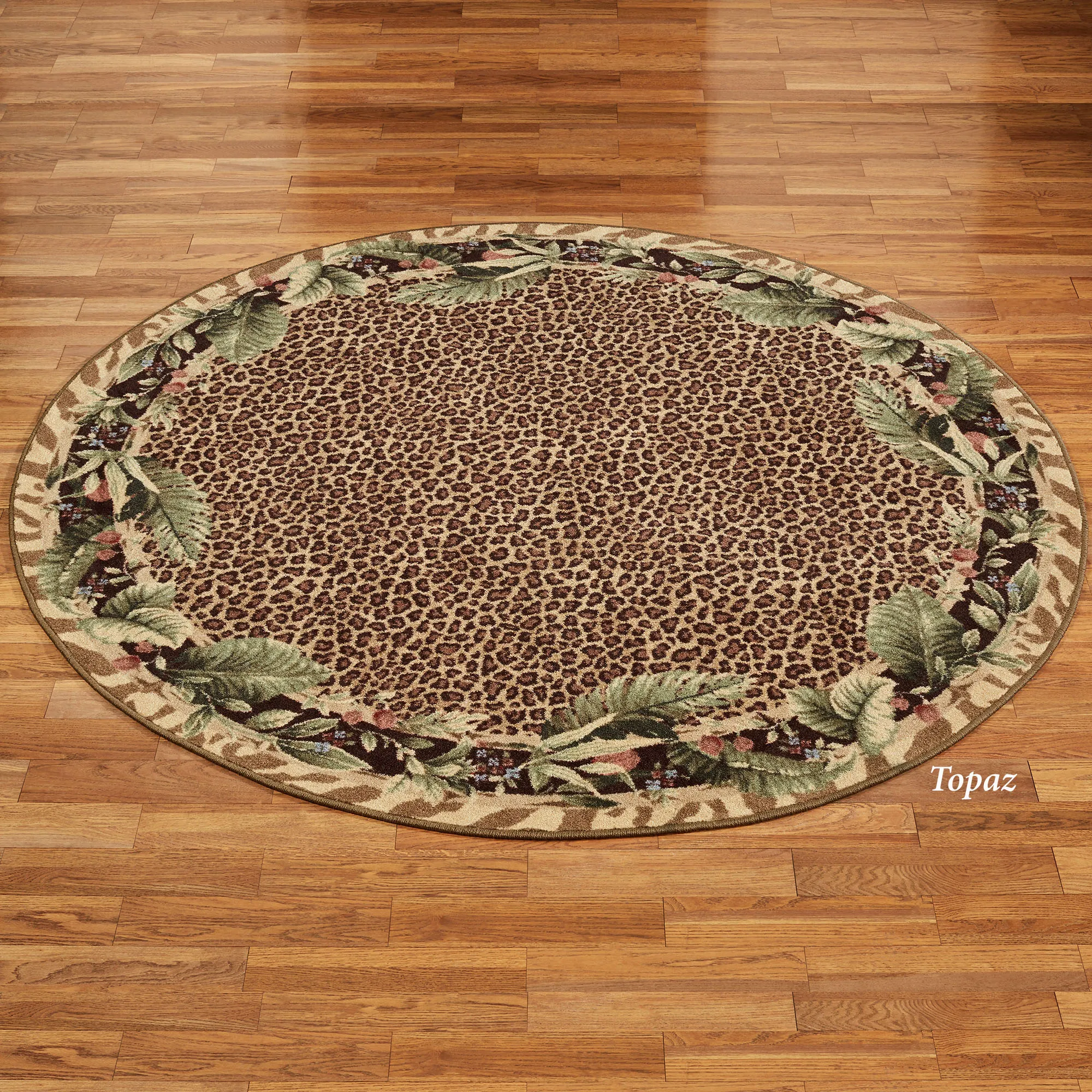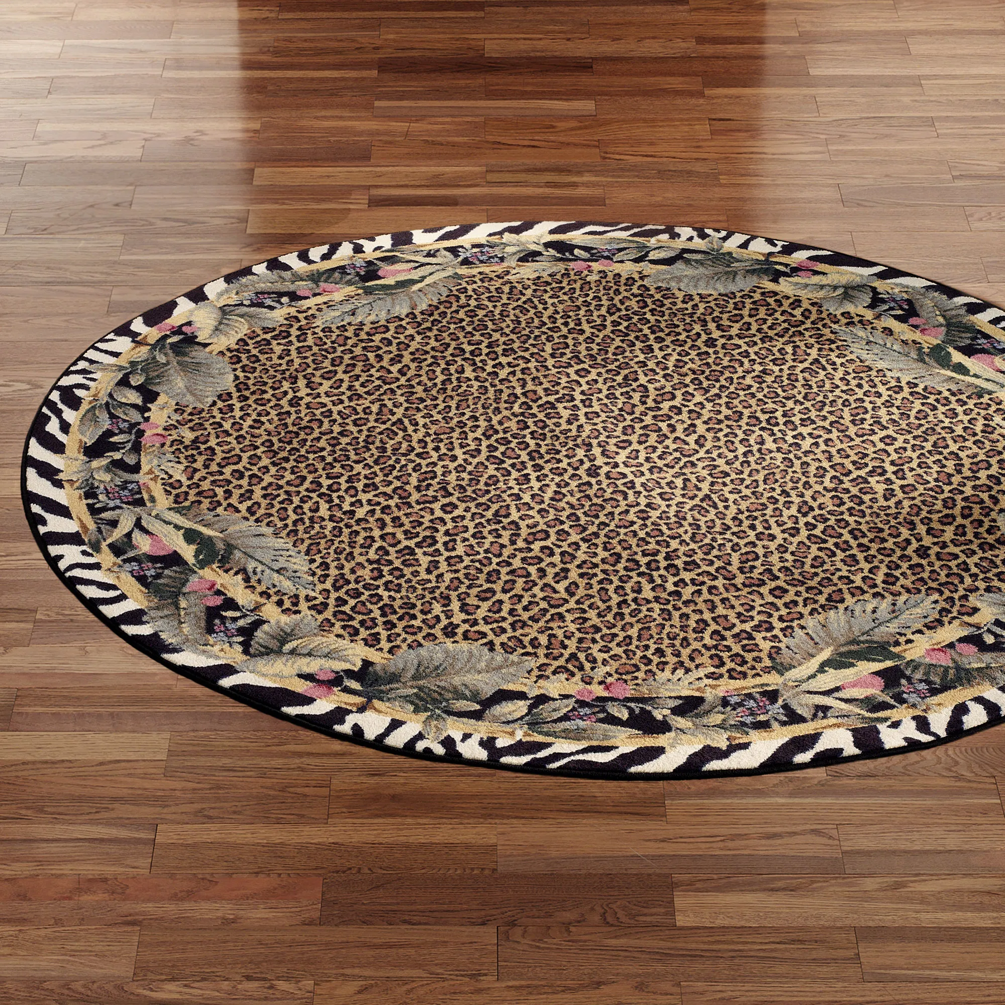 The Jungle Safari Animal Print Round Area Rugs from Milliken(R) will add a touch of the wild side to your home decor. Leopard print fields are encased by exotic palm and fern fronds. A zebra print design borders the .5" thick, nylon floorcoverings. These fabulous animal print rugs are machine-made and -tufted. We recommend professional cleaning by a rug cleaner.