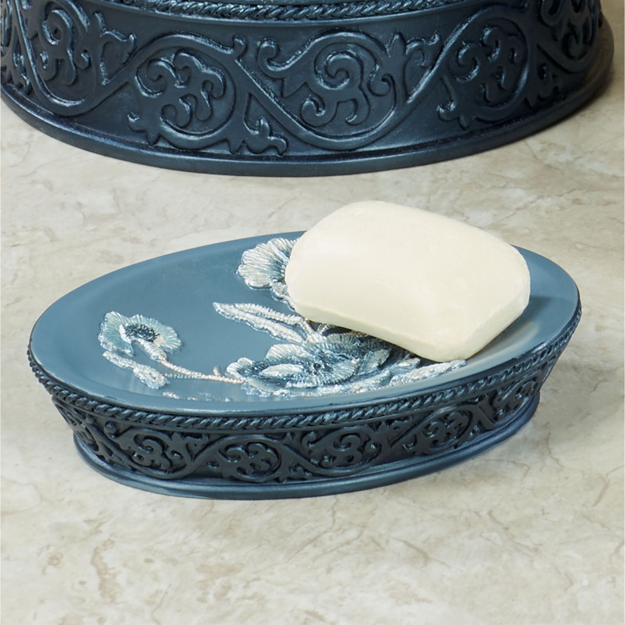 The blossoms on the Dublin Rose Floral Bath Accessories bloom with sweetness. Made of resin, these bath accessories have a raised floral design in handpainted shades of blue, off-white, and light gold on a blue background. Bottom trim is dark blue with raised scroll designs. Brush Holder can be used to hold toothbrushes or makeup brushes. Specify Wastebasket, Tissue Cover, Lotion/Soap Dispenser, Brush Holder, or Soap Dish.