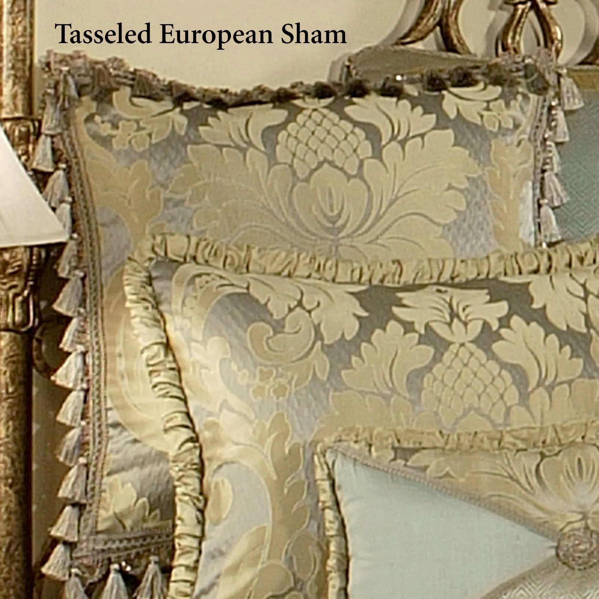 Tasseled European Sham mimics the comforter face with a gimp trim frame accented with tassels and beaded loops; reverses to solid gold; zipper closure.
