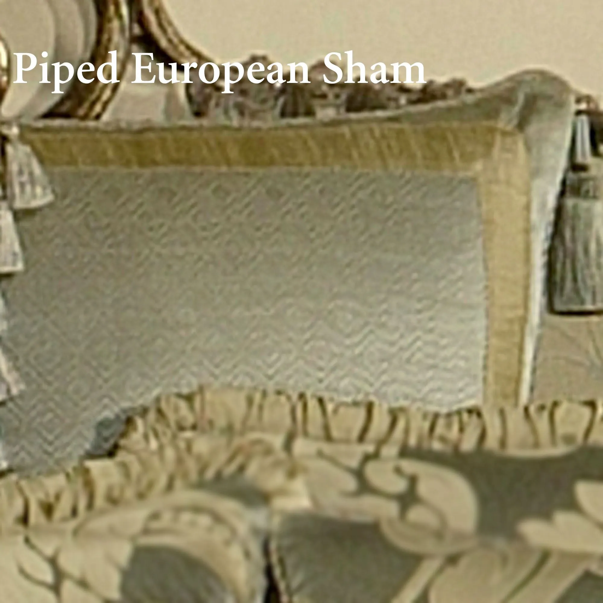 Piped European Sham has a seafoam woven diamond pattern on a bronze ground with a solid gold border, piped edges, and tassels on the top two corners; reverses to solid gold; zipper closure.