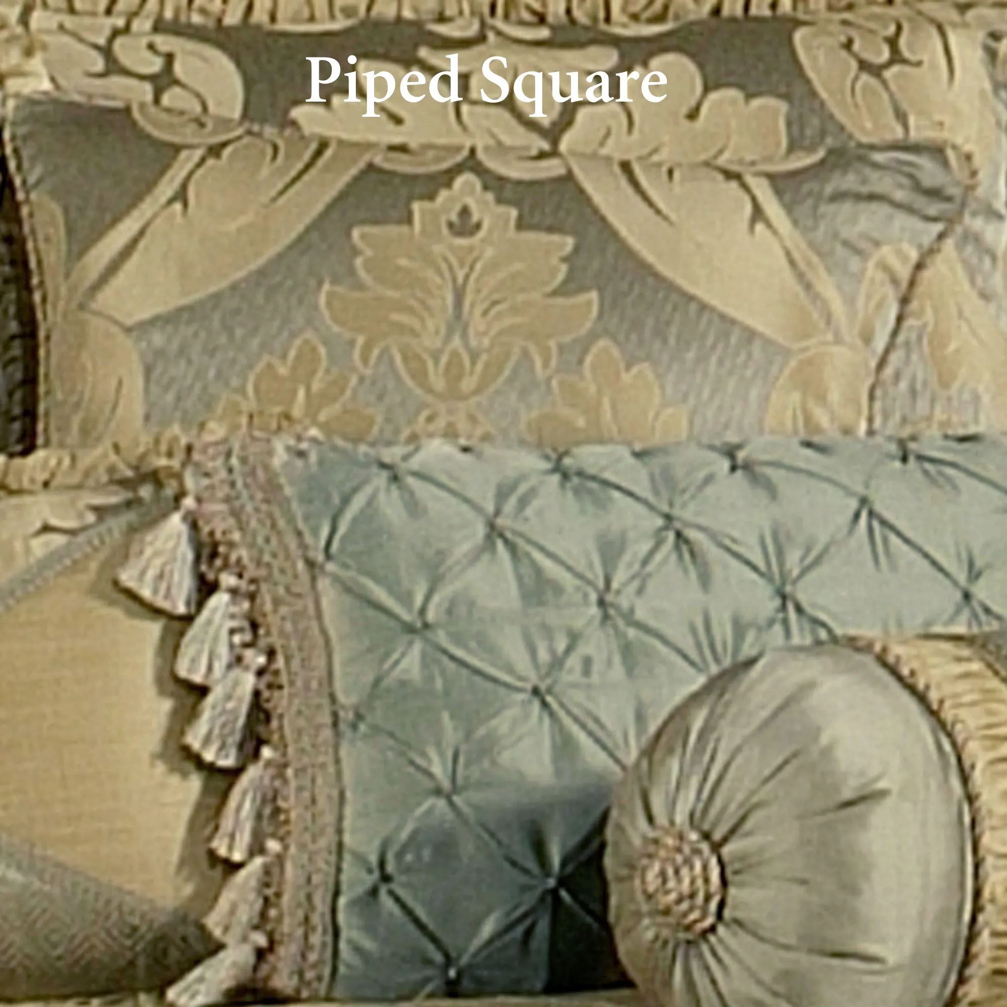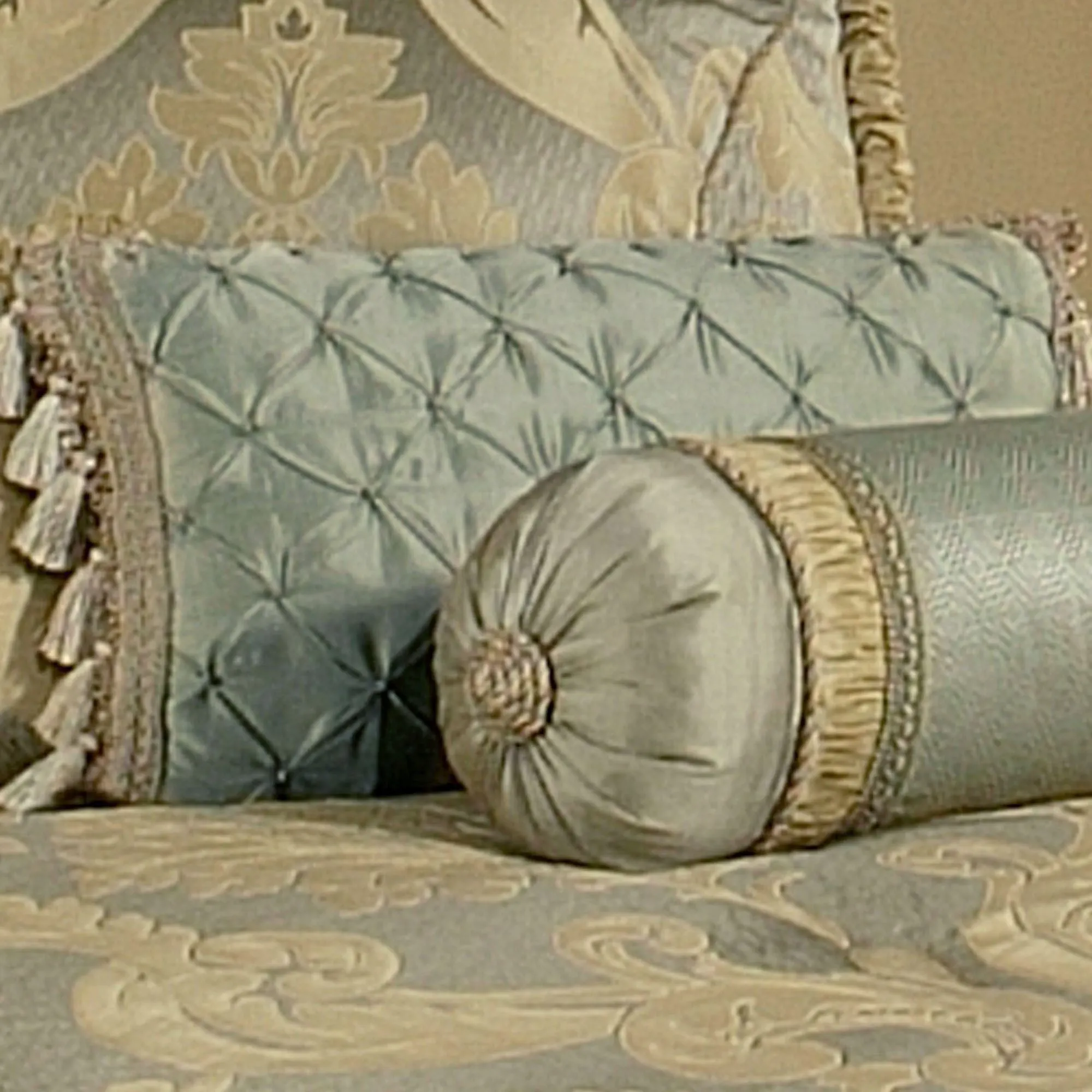 Pillows are polyester with polyester fill. Spot clean. The pieced Corded Rectangle contains triangle designs of coordinating damask, solid gold, solid seafoam, and the woven diamond pattern separated by gimp trim and accented with a twist-corded button tuft center and jumbo ruched cording edges. Square mimics the comforter face with piped edges. Neckroll has a center of the coordinating woven diamond pattern bordered by gimp trim, ruched solid gold, twist cording, and solid seafoam ends with twist cording button tuft centers. Pintuck Tasseled Rectangle has the seafoam pintuck diamond design with gimp trim and tassel sides.