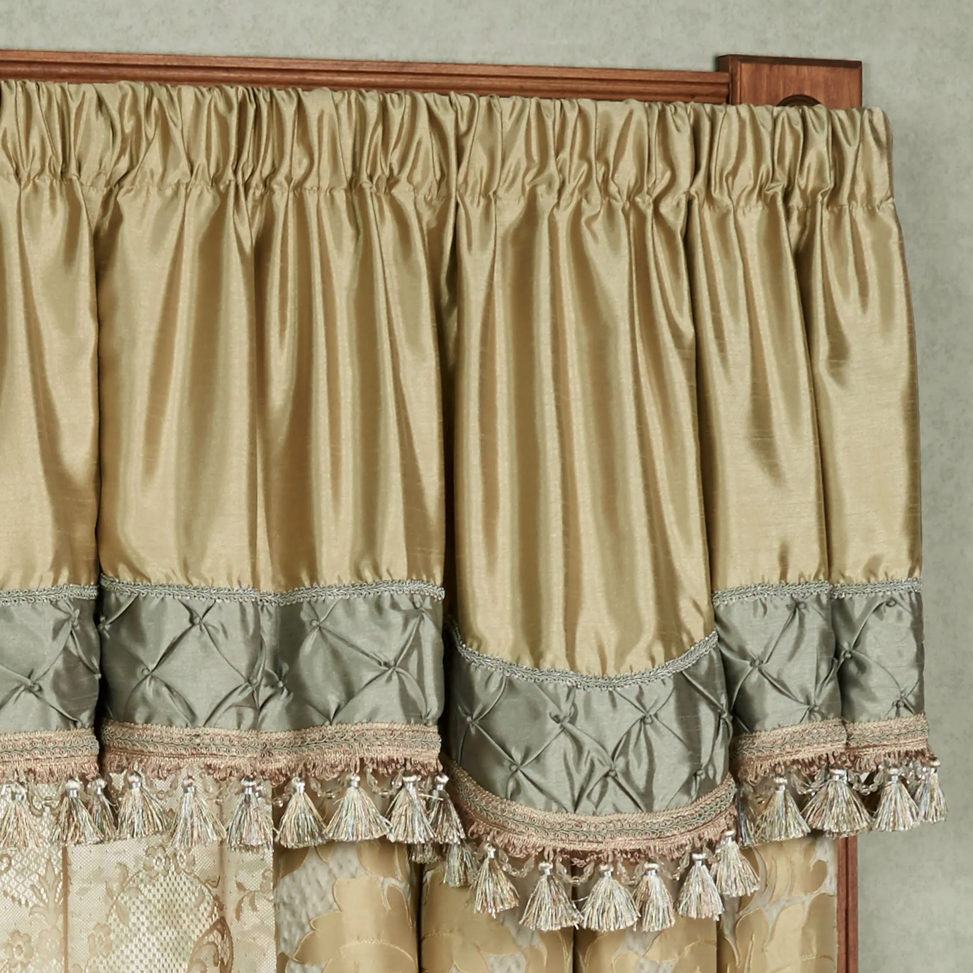 Lined Window Treatments have 3" rod pockets. Wide Curtains mimic the comforter face with tailored edges. Scalloped Valance is solid gold with a bottom border of seafoam pintucked diamonds with a gimp trim and tassel bottom edge.