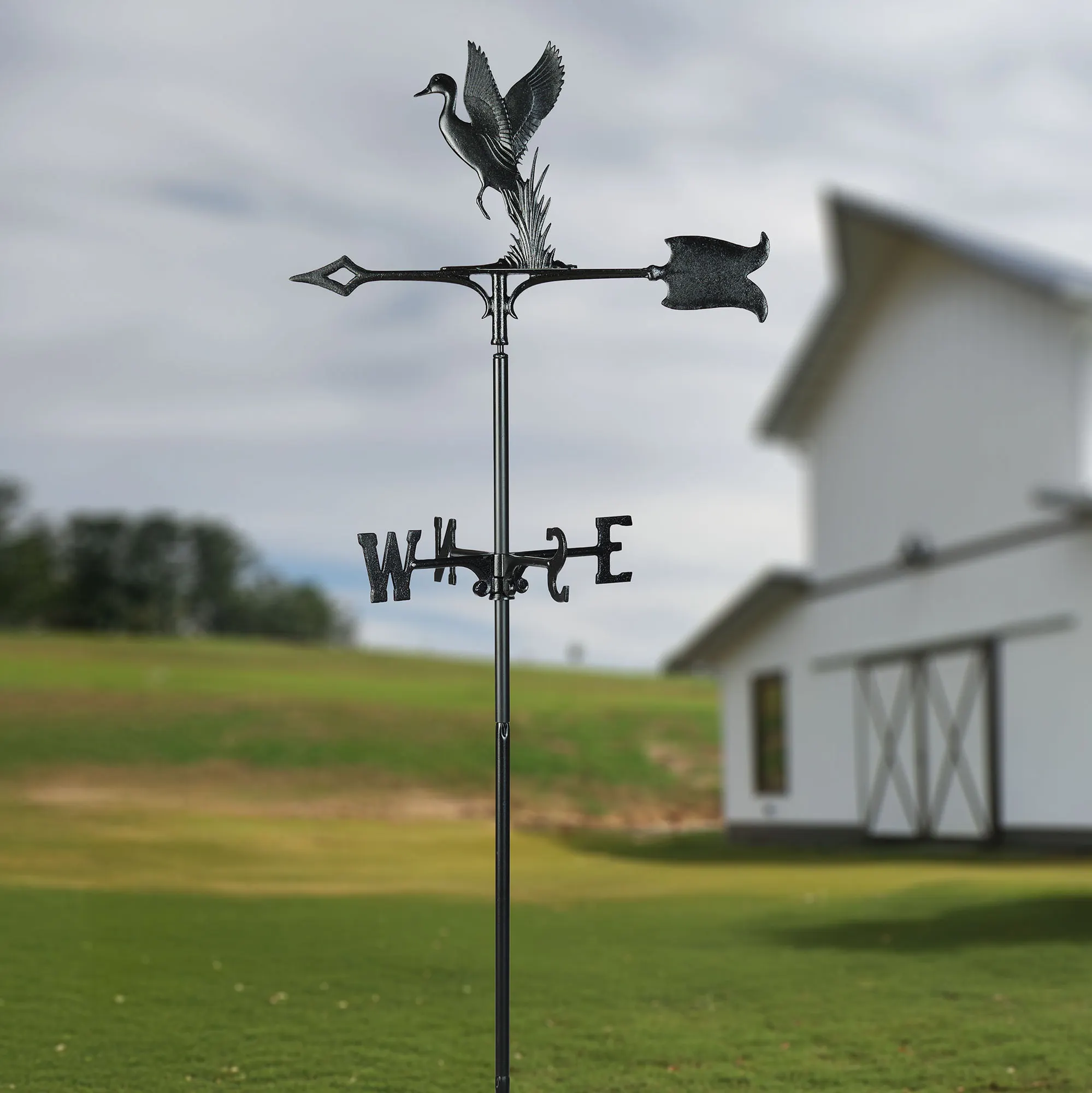 The Duck Garden Weathervane Stake keeps an eye on the wind while adding a touch of charm. Finished in classic black, the aluminum design features bold "N," "E," "S," and "W" indicators below the spinning arrow and detailed, stamped decorative design. Overall, the arrow itself measures 23.5"Wx4.5"H. A flying duck tops the vane. The duck accent measures 8"Wx11"H; the weathervane measures 69"H overall. The staked weathervane can be driven into the ground to your desired height and is perfect outdoors year round. USA/Imported.