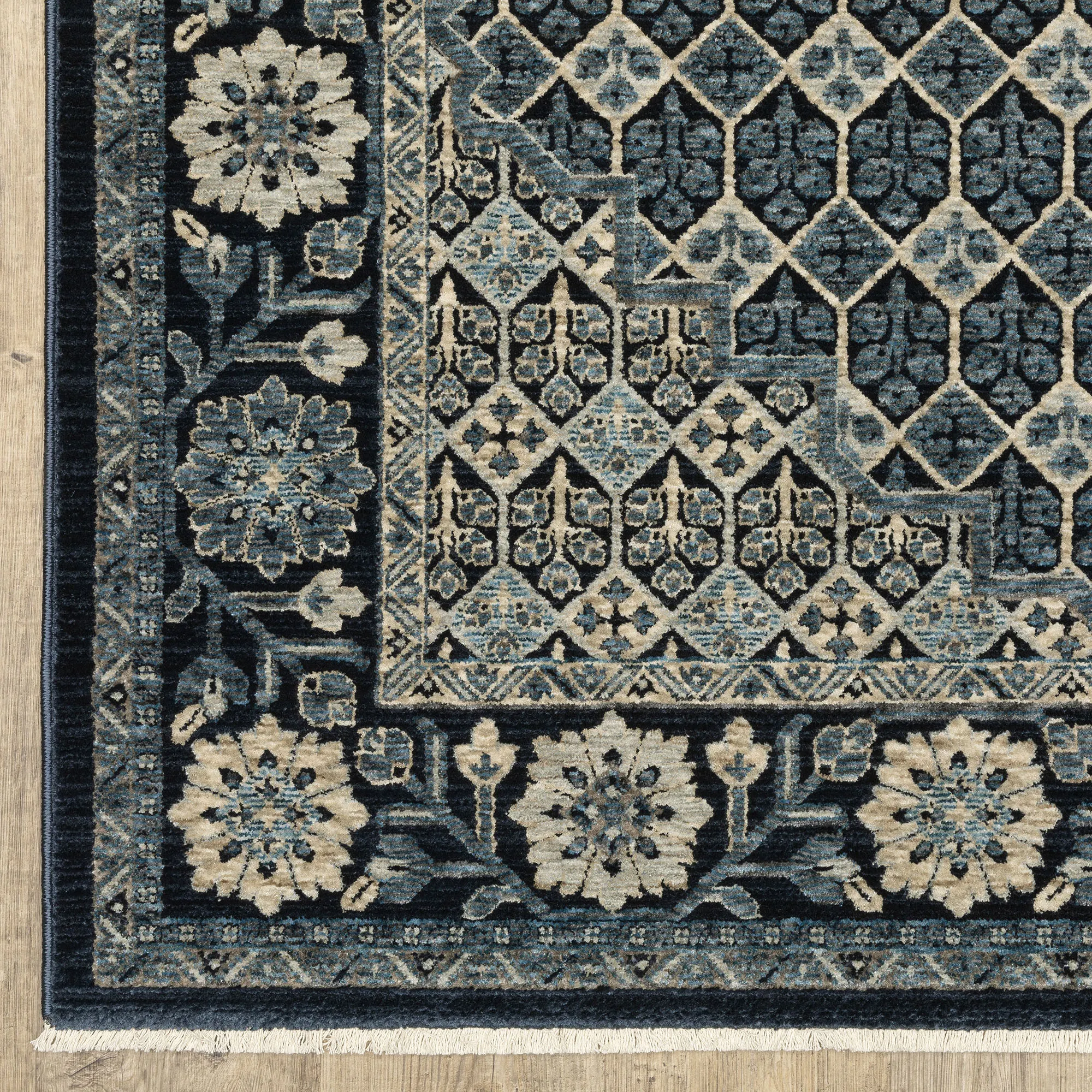 Complement a variety of decor styles with the effortless charm of the Duke Rug. Power-loomed from high-density polyester, the .32" thick rug features a geometric center framed in various floral motifs in a grand, detailed design. Bold space-dyed midnight blue, ivory, light cream, and hues of blue color the rug, while ivory .5"L fringed ends add a bohemian charm. Backing is woven polyester. We recommend professional cleaning by a rug cleaner. Imported.