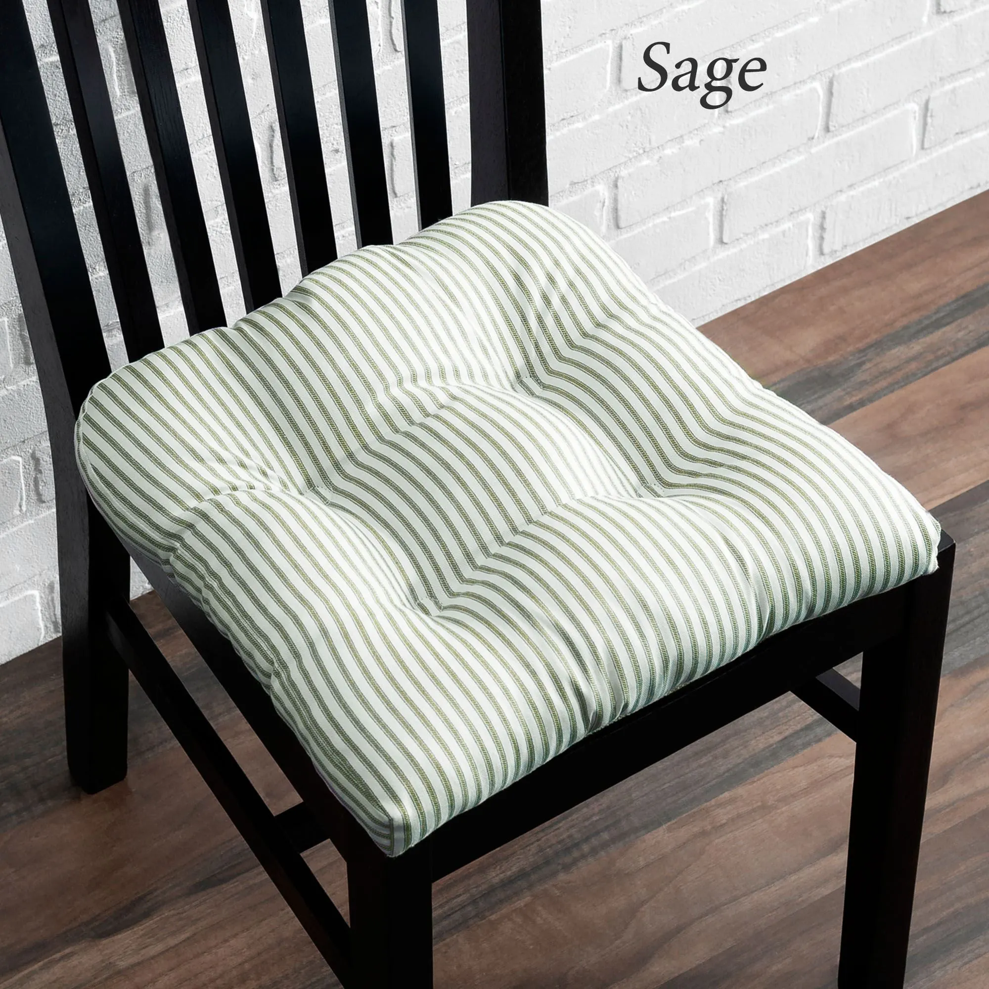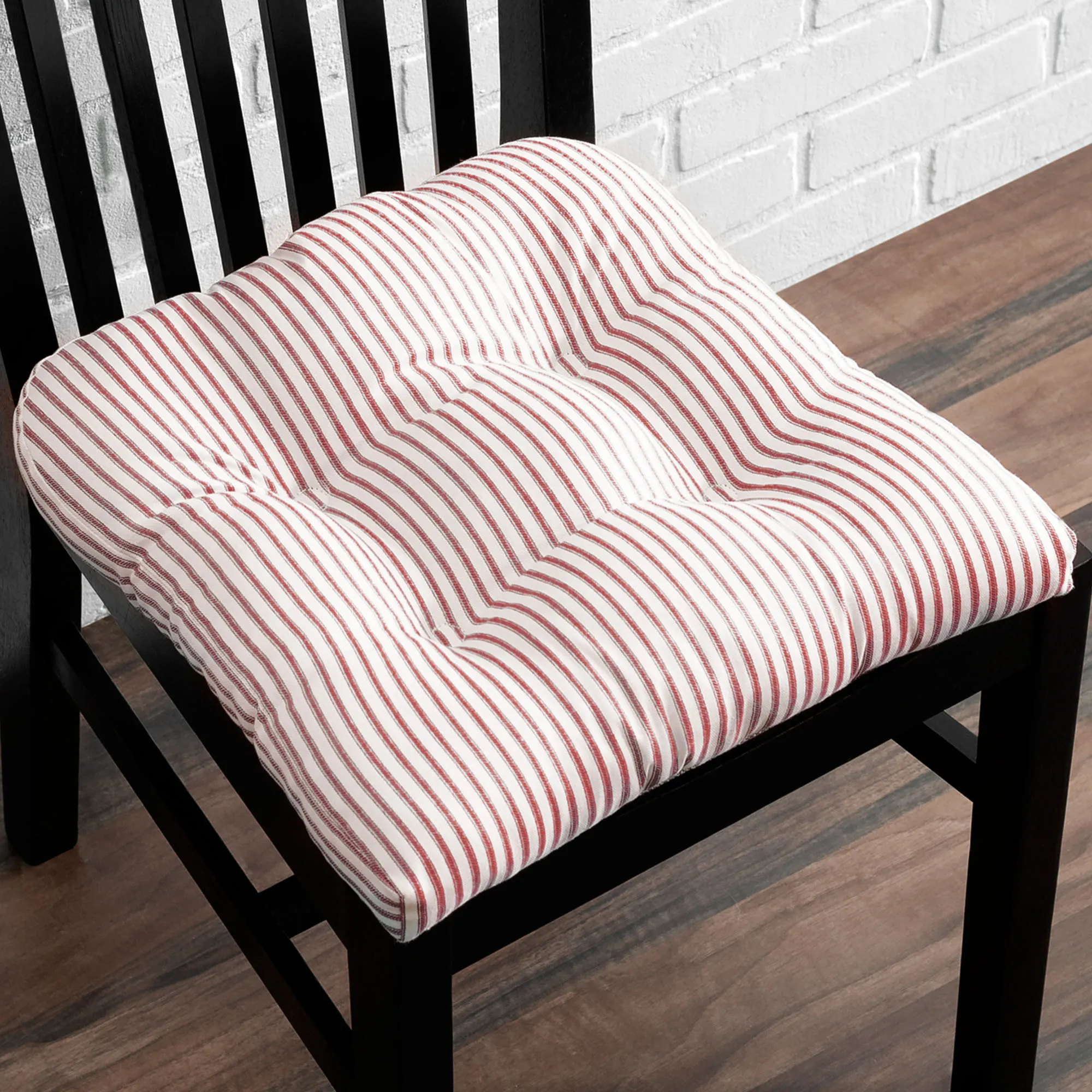 The classic stripes on the Dupont Chair Pad will look perfect in a farmhouse or traditional style. This cotton/polyester accent has an off-white background and a nonskid bottom. Sold individually, each chair pad is 18" sq. Spot clean. Made in Pakistan.