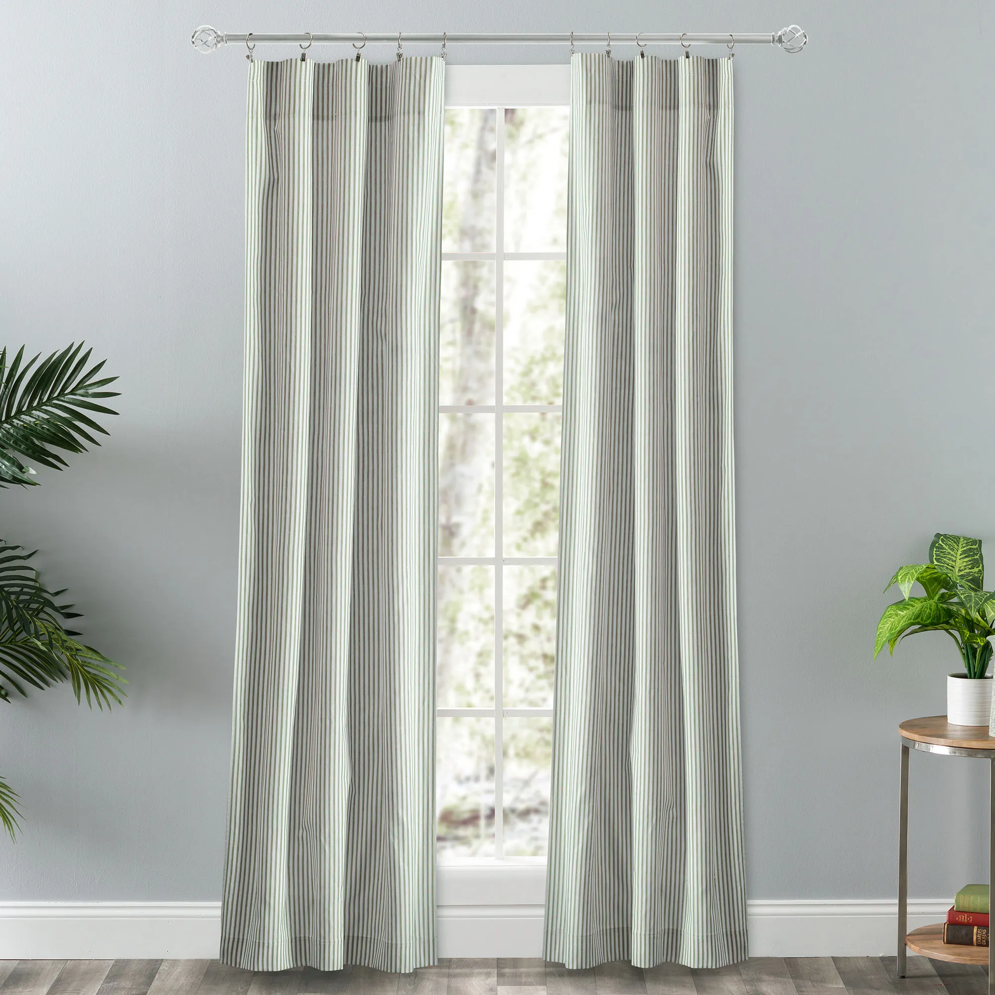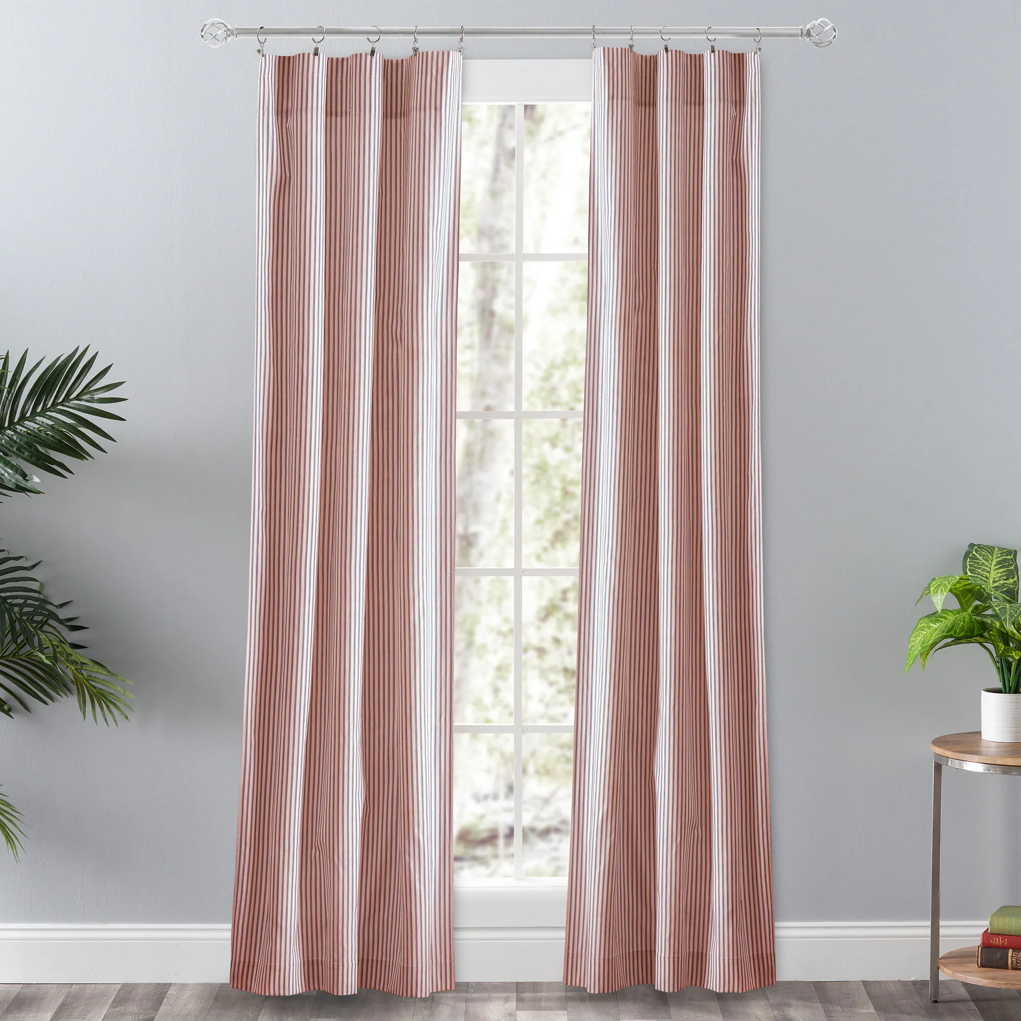 The classic stripes on the Dupont Window Treatment will look perfect in a farmhouse or traditional style. These cotton/polyester accents have an off-white background. Specify Curtain Pair, Swag Valance Pair, Tailored Valance, or Bradford Valance. The Curtains and Bradford Valance have a 3" rod pocket. The Swag Valance Pair and Tailored Valance have a 1.5" rod pocket. Curtains include tiebacks. The scalloped, lined Bradford Valance has a layered bottom edge. Machine washable. Made in Pakistan. The curtain pair width is the total width of two panels together.