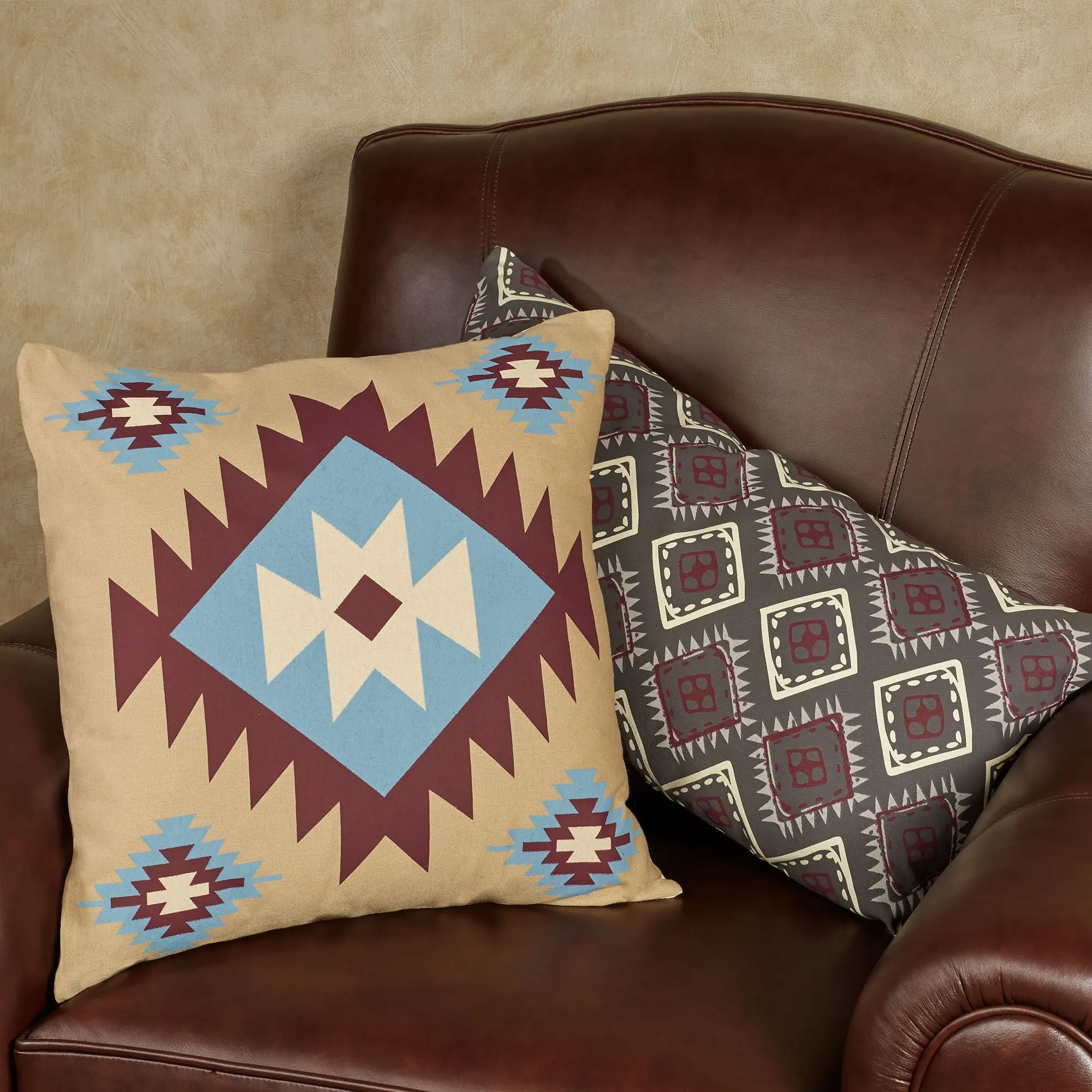 The Durango Decorative Pillow Set has plenty of Southwest flair. Made of cotton, these two pillows have printed Southwest geometrics, tailored edges, zipper closures, and polyester inserts. Square pillow, 18", has a large diamond motif in burgundy, blue, and cream on tan. Rectangle pillow, 12"x24", has small diamonds in light taupe, burgundy, and cream on dark taupe. Spot clean. Imported.