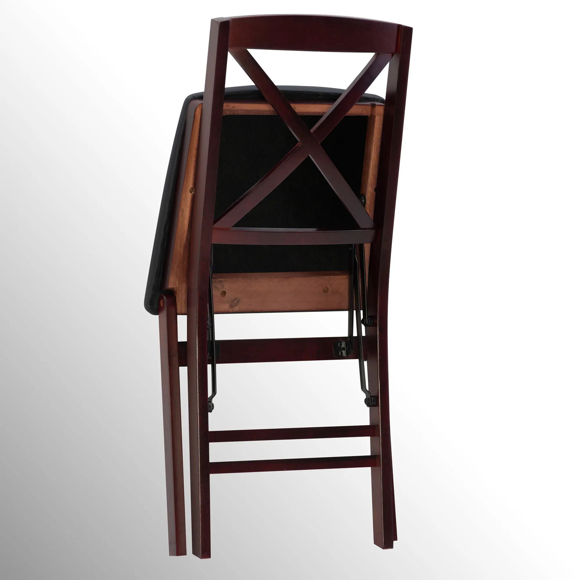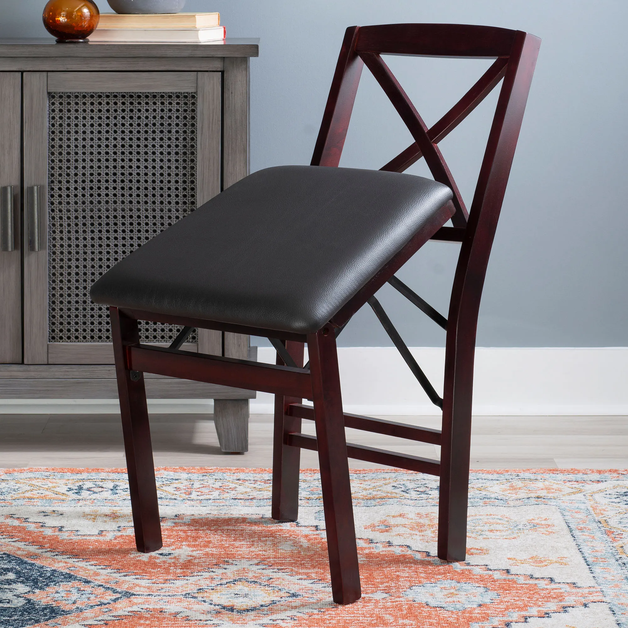 The Dylan Folding Chair Set proves that extra seating can also be beautiful and stylish. Finished in espresso, the wood chairs feature sleek lines, classic crossing backs, and rich brown faux leather upholstered foam-padded seats. The front and rear steel supports provide extra stability to the folding chair design. Seat height is 18". Each folding dining chair measures 17"Wx20"Dx35.5"H. Set weighs 28 lbs. Spot clean the fabric seat.