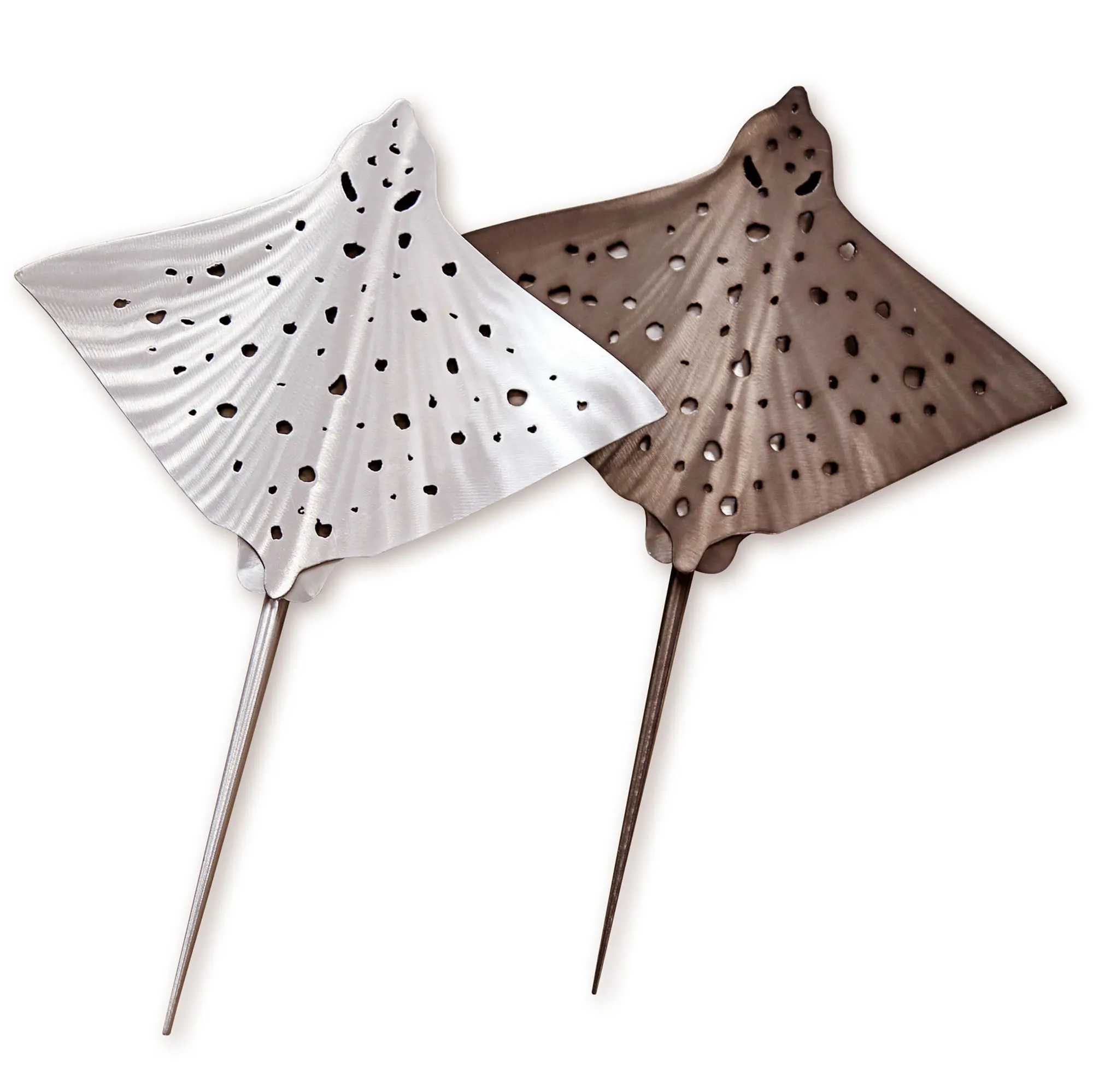 The Eagle Rays Gliding Pair moves smoothly through the currents. Handcrafted of stainless steel, this hand-finished wall sculpture, by M. Malizia, features a top view of one silver and one bronze eagle ray with openwork spots on their backs. Indoor or covered outdoor use. Eagle ray wall art measures 30"Wx4"Dx30"H.