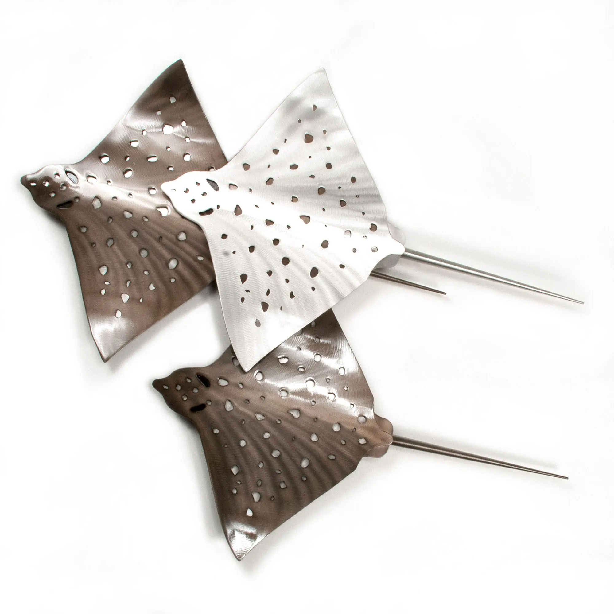 The Eagle Rays Gliding Trio Wall Sculpture is aluminum.