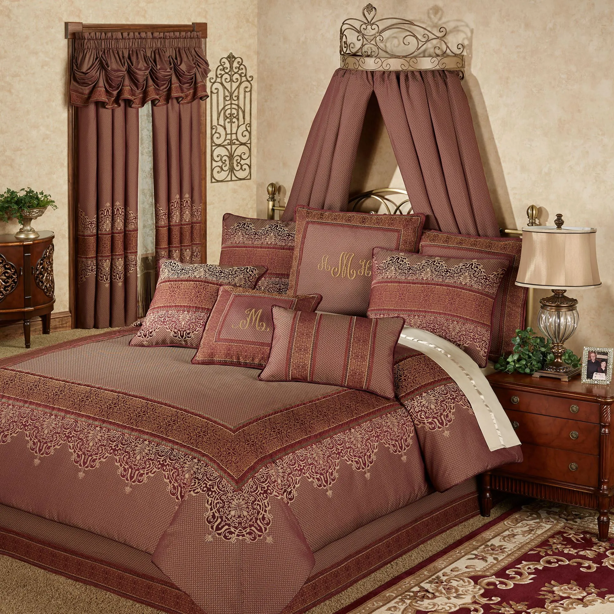 The distinguished Eastleigh Bedding provides a grand escape fit for those with regal tastes. An exclusive Touch of Class(R) design by J. Queen New York, the jacquard-woven polyester ensemble features golden diamonds, light gold scrolling filigree, and harvest gold scroll medallions with russet and sage chenille trim, all across a rich ruby hue.