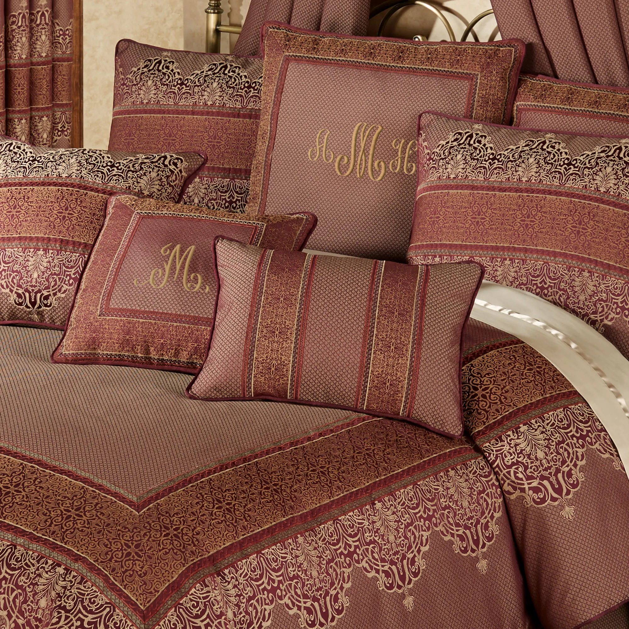 Piped Pillows reverse to all-over diamonds. Spot clean. Rectangle contains pieced bands of diamonds and medallion trim. The 20" Square contains pieced bands of diamonds, filigree, and medallion trim. The 18" Square has a diamond center with a mitred trim medallion frame. The center of the 18" square pillow can be monogrammed for an additional charge. Monogramming is shown in the Gold thread color.
