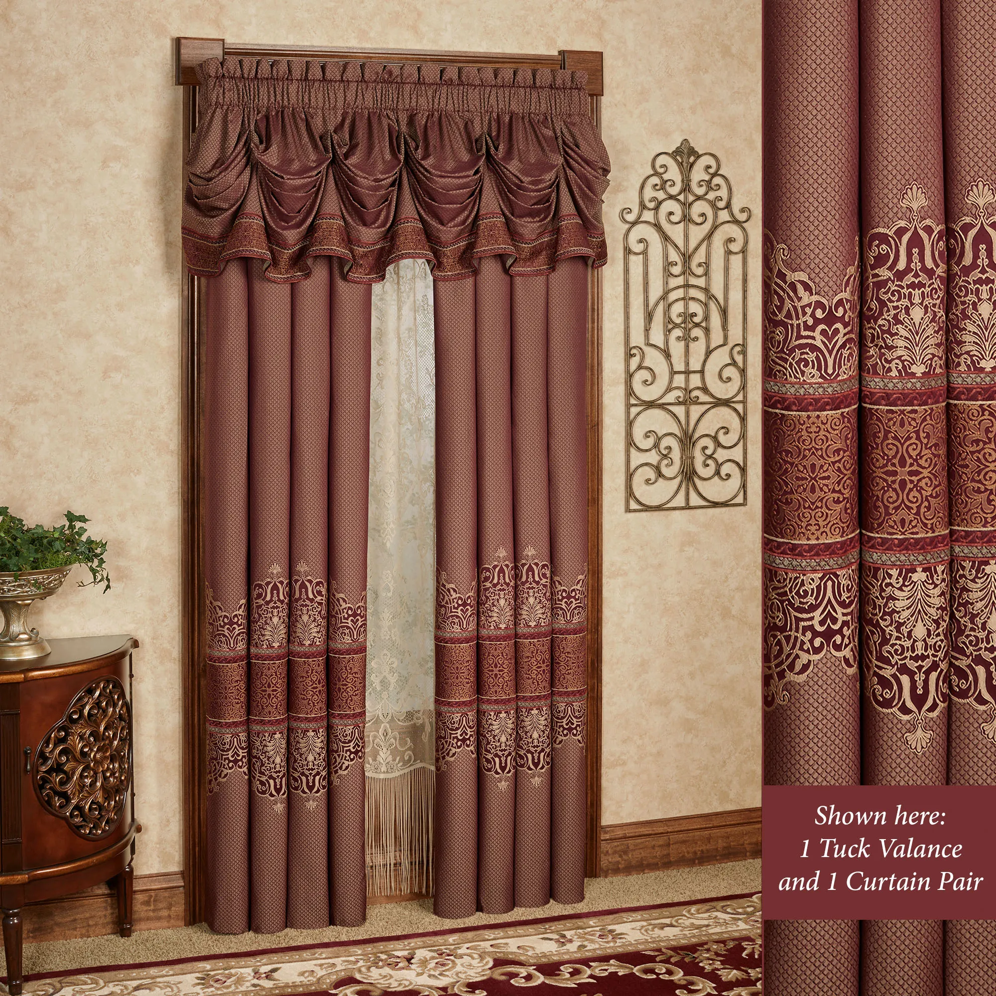 Window Treatments: The lined Wide Curtains have diamonds, filigree, medallion trim, tailored edges, and 3" rod pockets. Tiebacks are included. Curtains are available in two lengths. Each lined Ascot Valance has diamonds, vertical filigree scrolls and medallion trim, a tassel accent, and a 3.25" rod pocket. Tuck Valance has diamonds, medallion trim, and a 3.25" rod pocket.