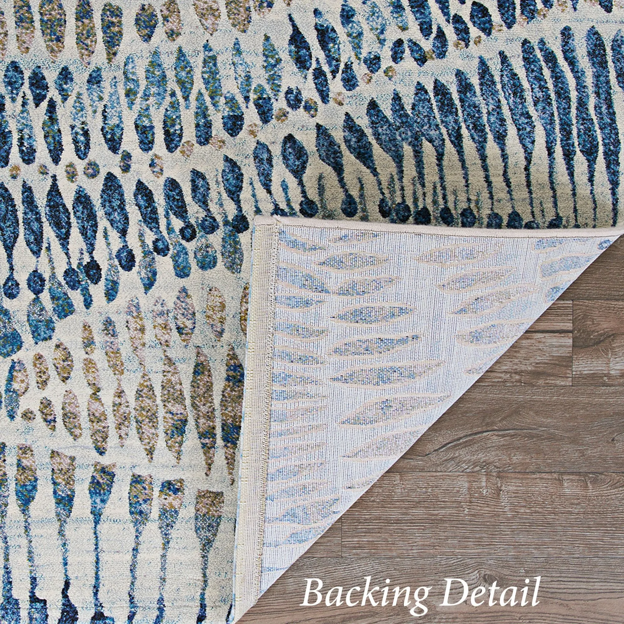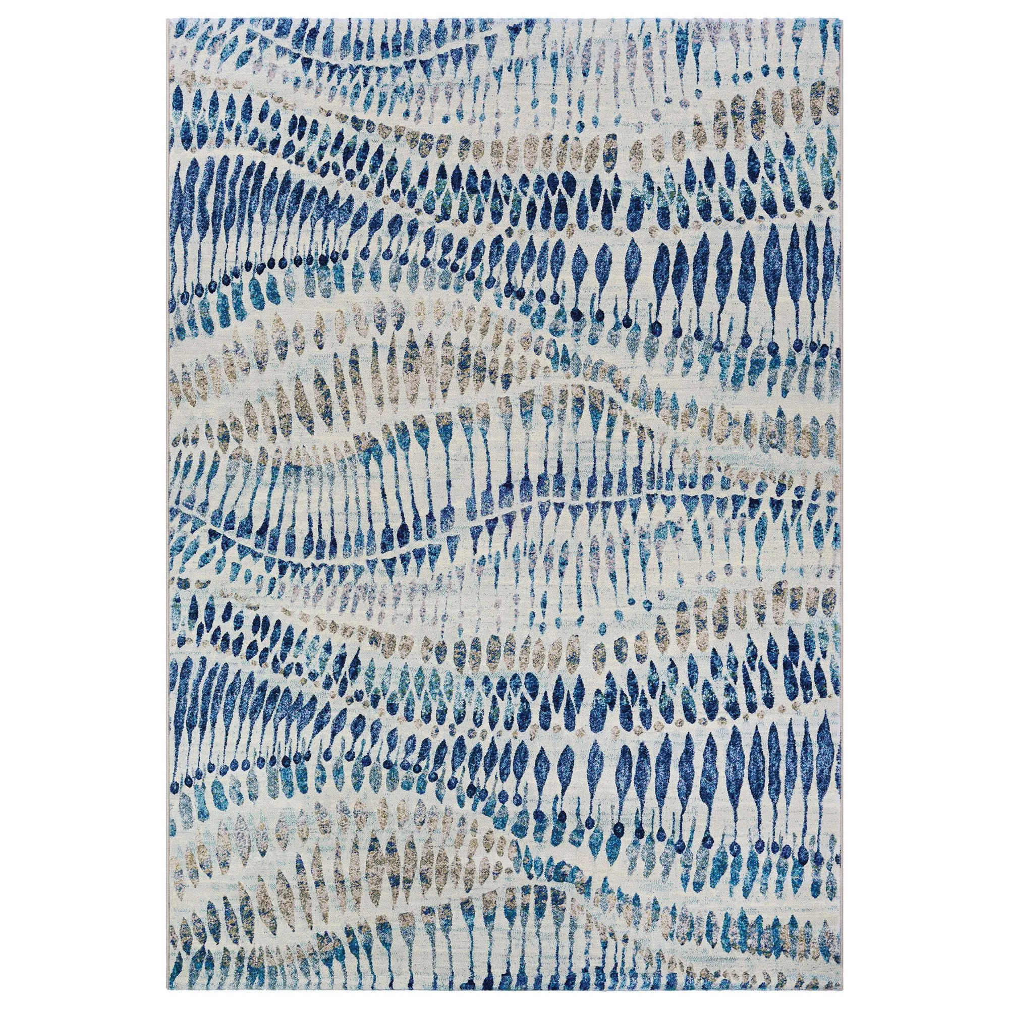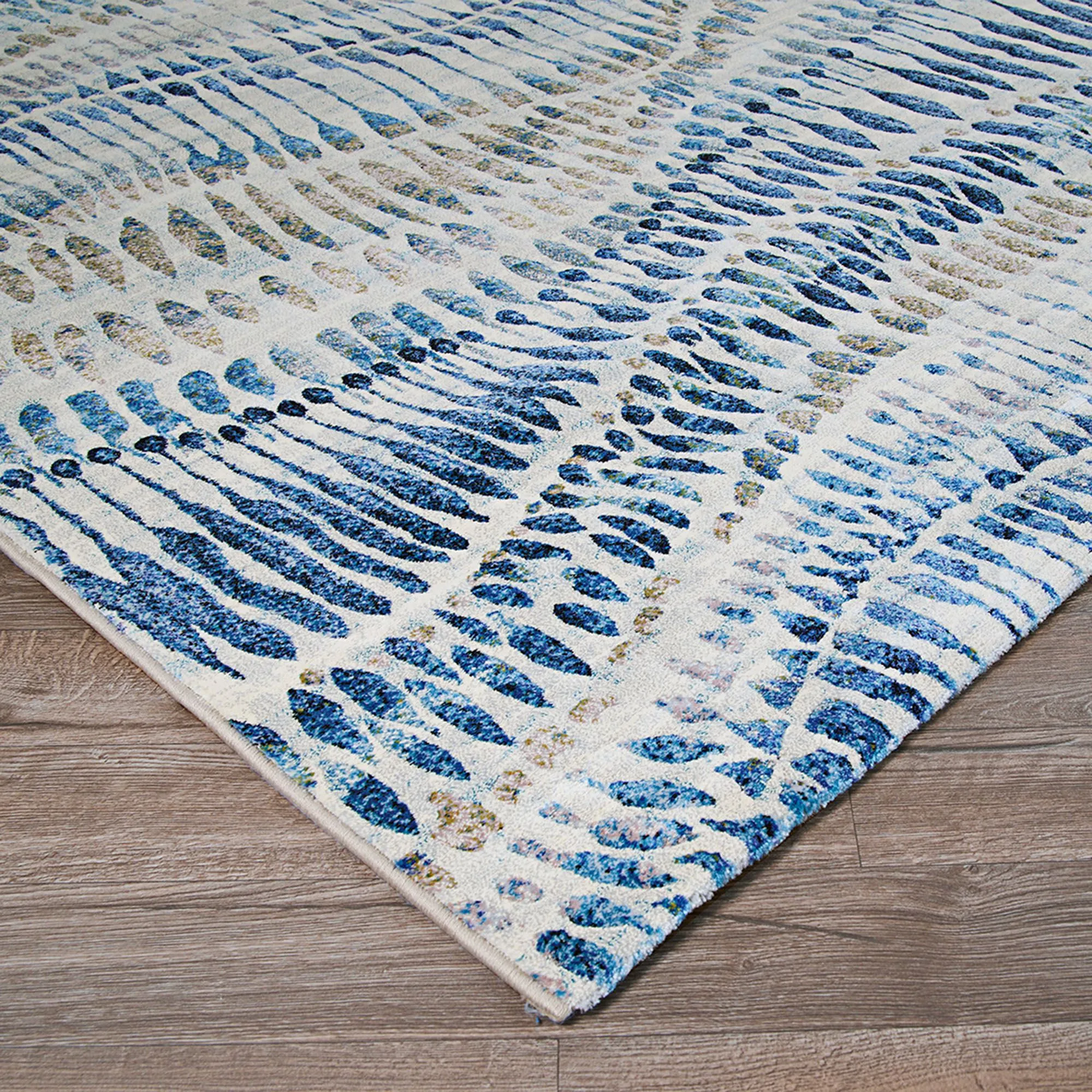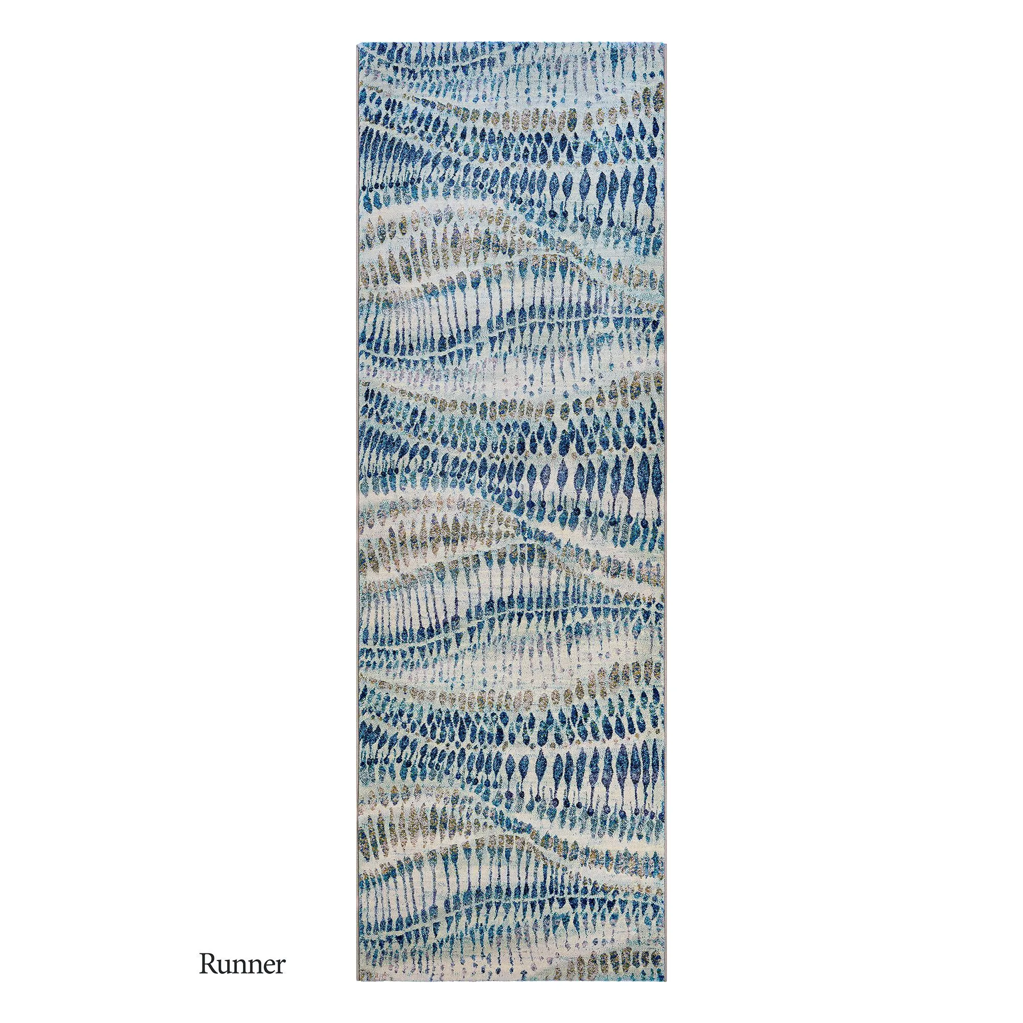 The Easton Charles Area Rug patterns your floor with undulating abstract stripes. Power-loomed from heat-set Courtron(TM) polypropylene, the .35" thick rug features antique cream, aqua, denim blue, and light tan hues. The unique design features a loom-carved face-to-face wilton-woven pile with a soft, luxurious finish. We recommend professional cleaning by a rug cleaner. Imported.