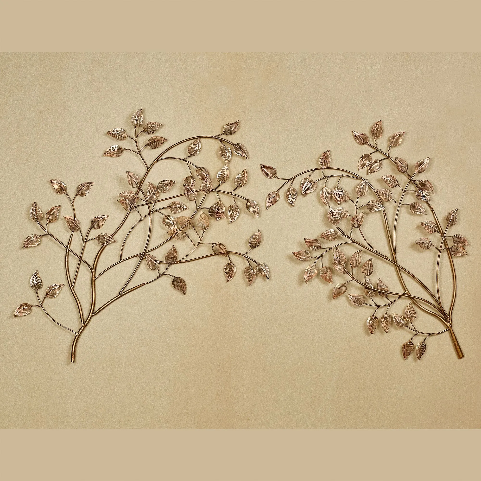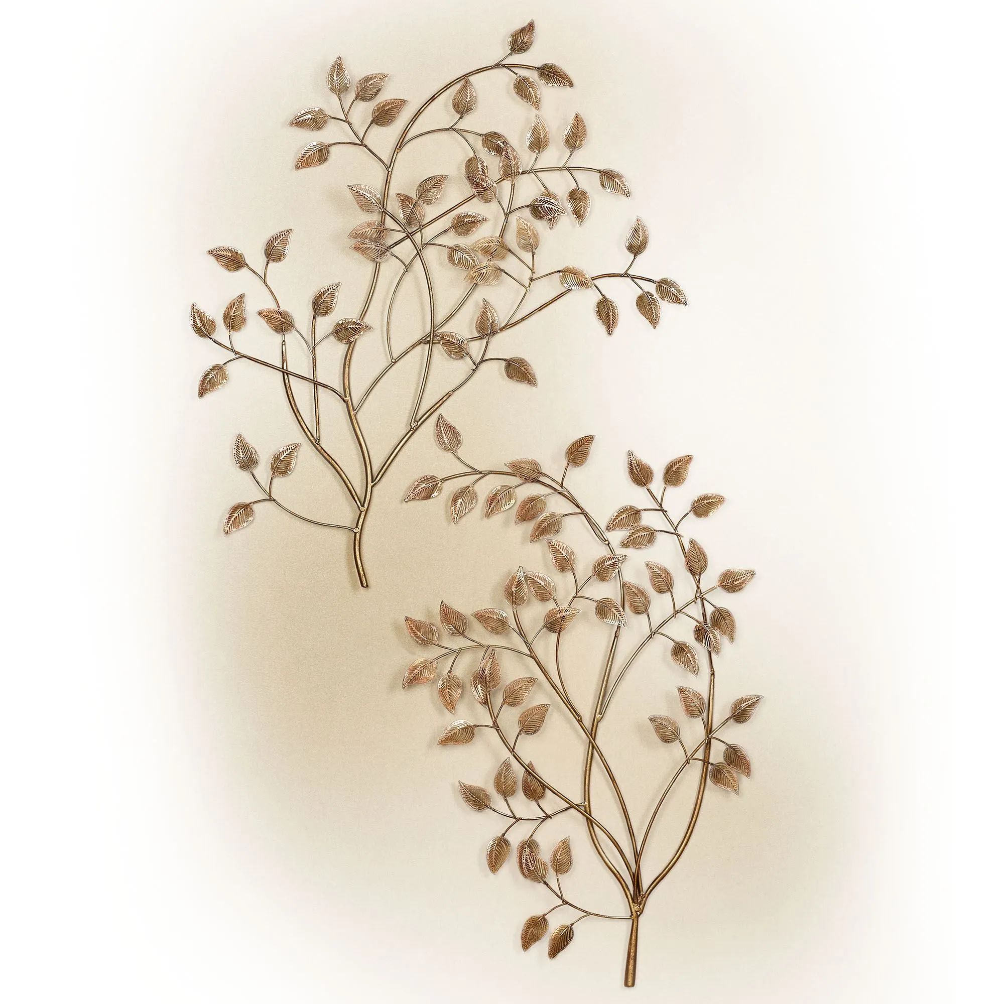 Allow the leaves of Eden to grace your home with the beautiful charm of nature. This metal wall sculpture set resembles two curving branches that grow openwork, finely crafted leaves with a multi-step, powder-coated, champagne bronze finish. Wall art will hang vertically or horizontally. Each measures approx. 19"Wx1.5"Dx28"H.