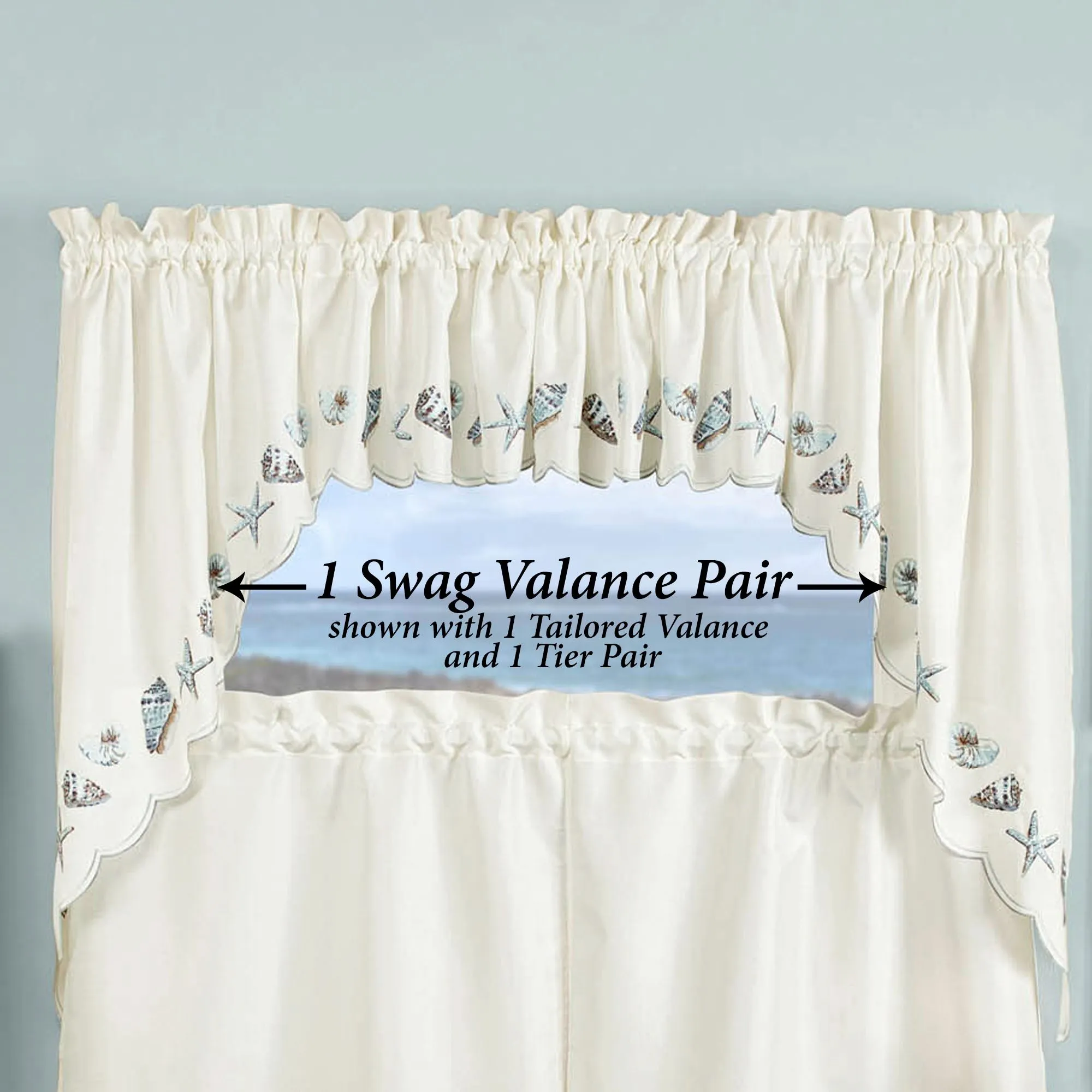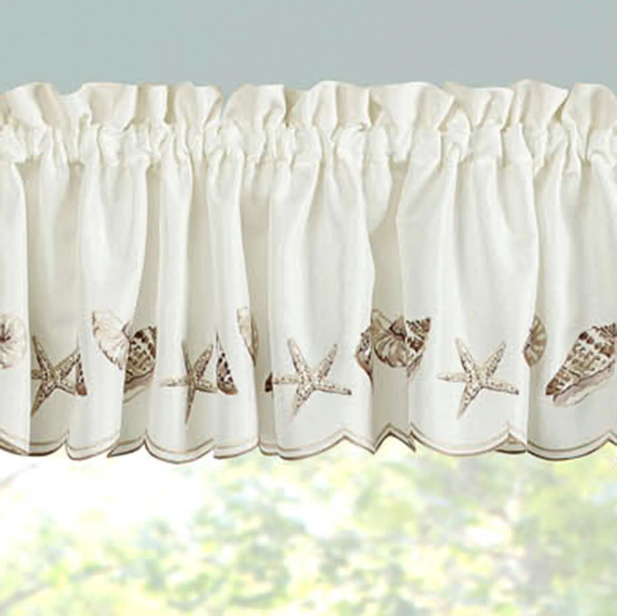 Caught in the ceaseless tide and lapping waves, Edgewater shells tumble along the shore. Those beautiful coastal accents can also trim your view with this tier window treatment. Each slubbed, light cream polyester window accent features embroidered starfish, conch, and nautilus shells along the scalloped edges with coordinating double merrow stitching. Aqua Mist also has slate blue and light taupe hues. Natural contains beige and light taupe shades. Rod pockets measure 2". Specify Tier Pair, 56"W; Swag Valance Pair, 56"Wx38"L; or Scalloped Valance, 58"Wx12"L. Machine washable. Imported.