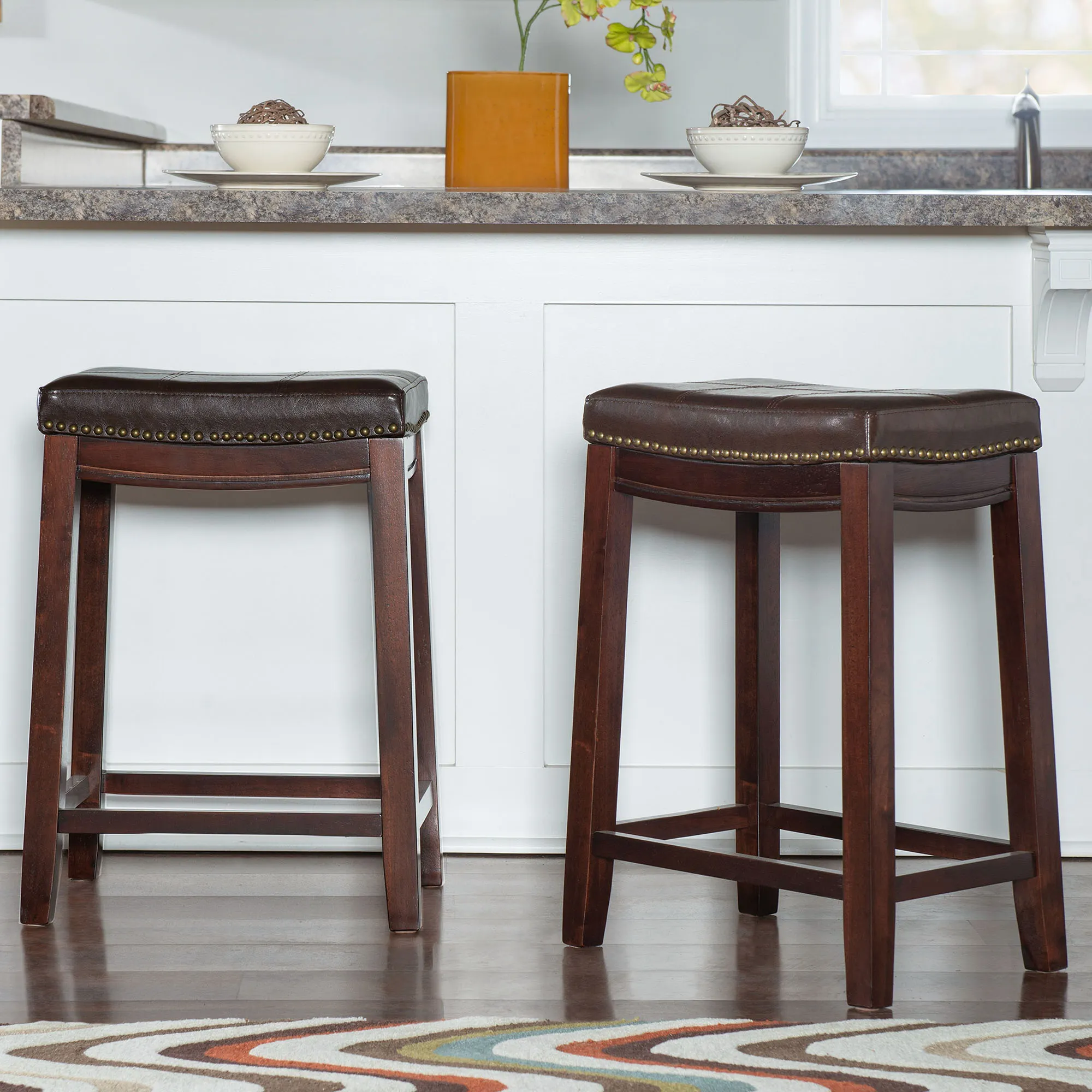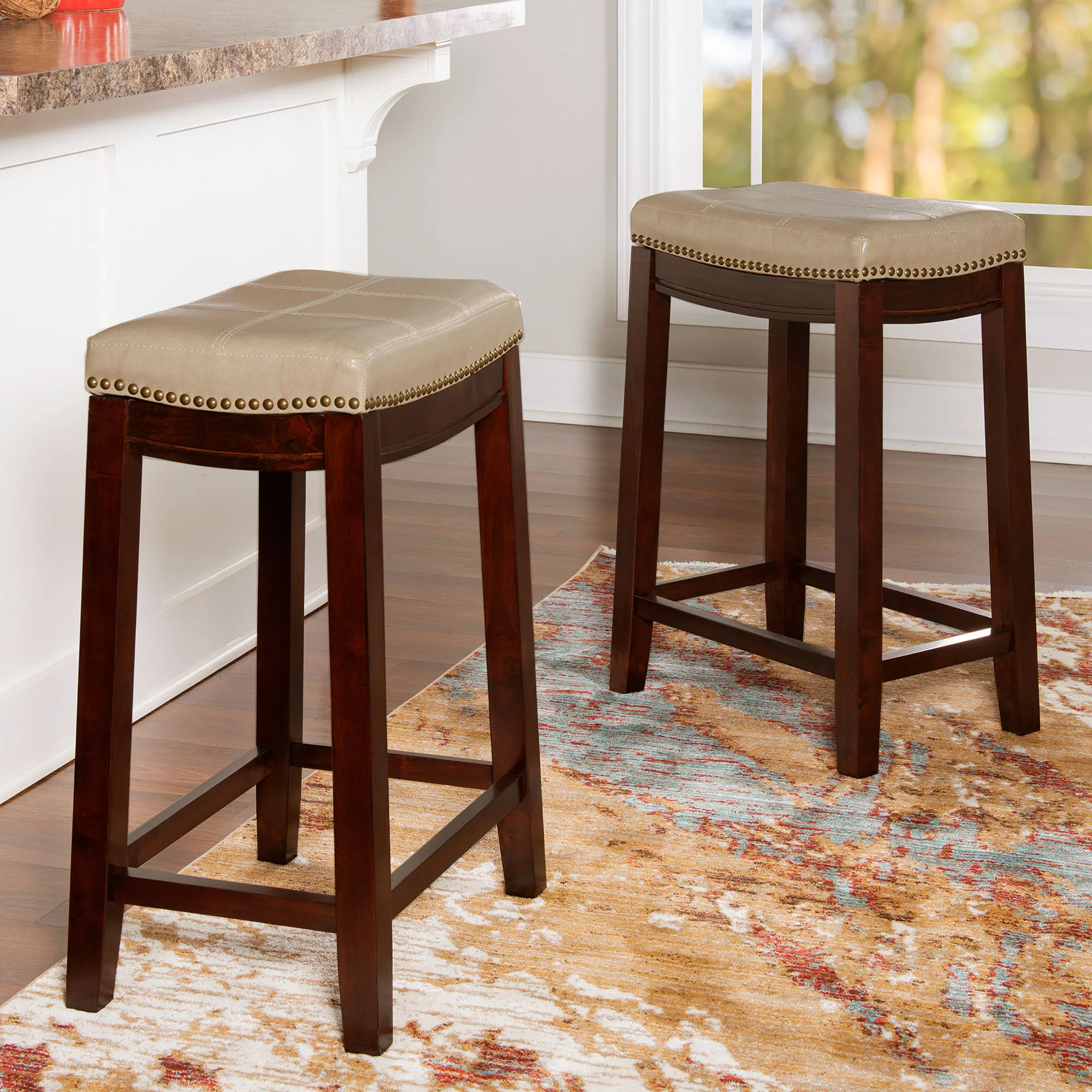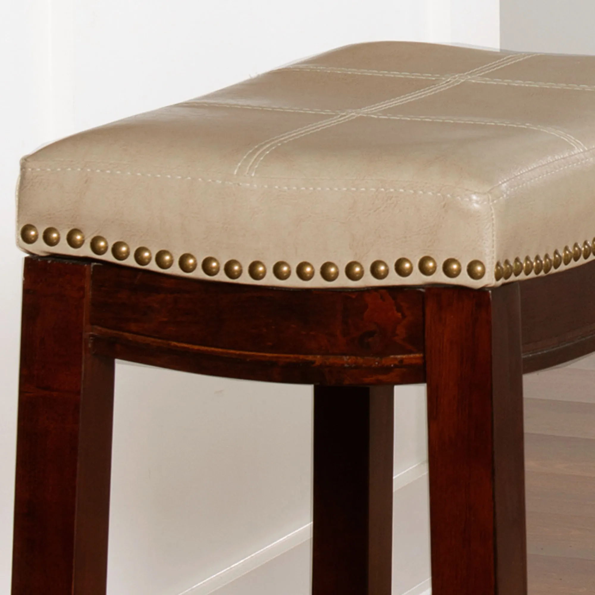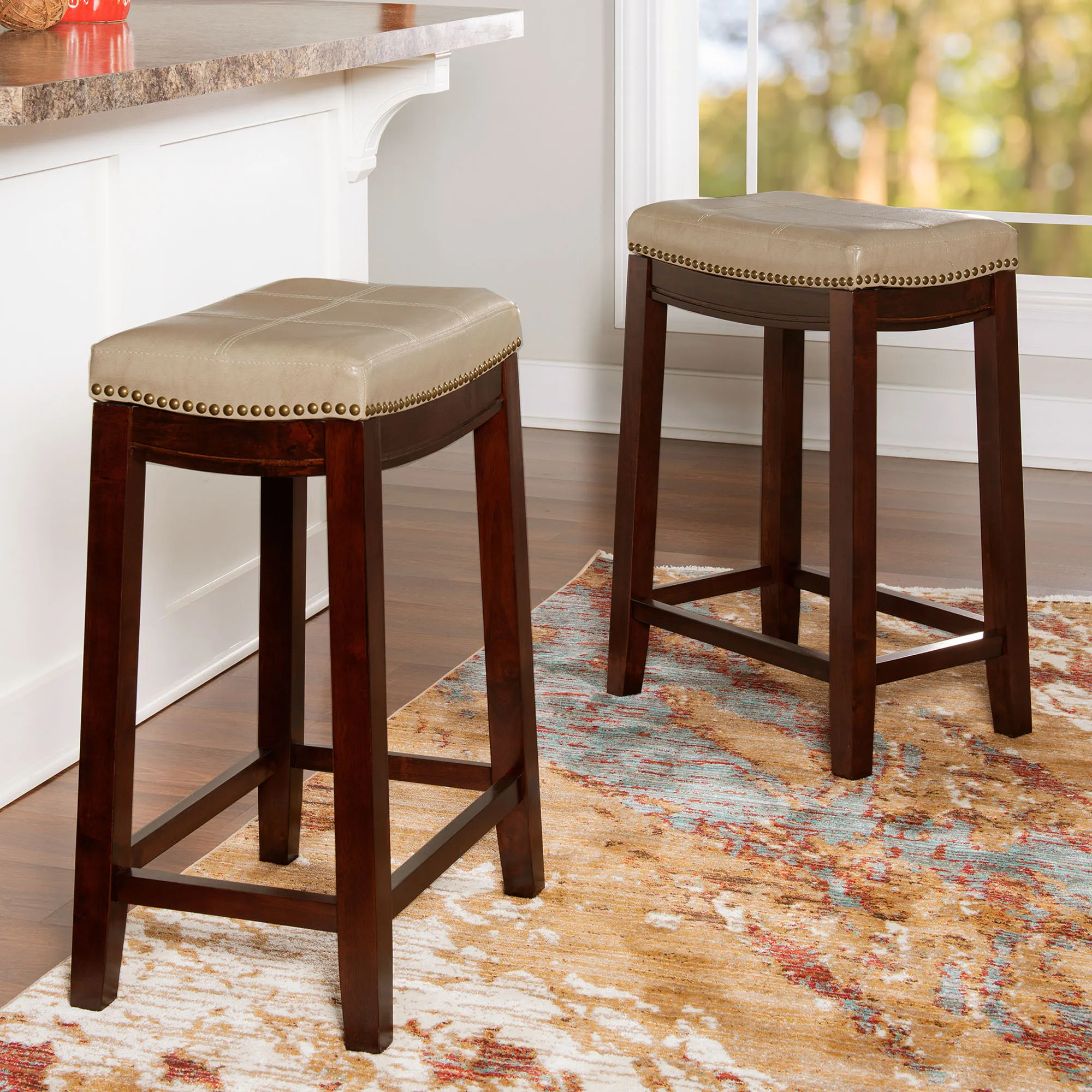 The Edison Kitchen Counter Stool Set completes a modern aesthetic. The wood stools are perfect for any high tabletop or counter space. Each backless stool has an autumn cherry finish, an upholstered, mottled faux leather seat, double stitching, foam fill, and antique brass metal nailhead trim. The maximum recommended weight for the stool is 275 lbs. The counter stool is perfect for counter or table heights of 35"-39". Each counter stool is 18"Wx12.5"Dx26.5"H and weighs approx. 26 lbs. Wipe the fabric clean.