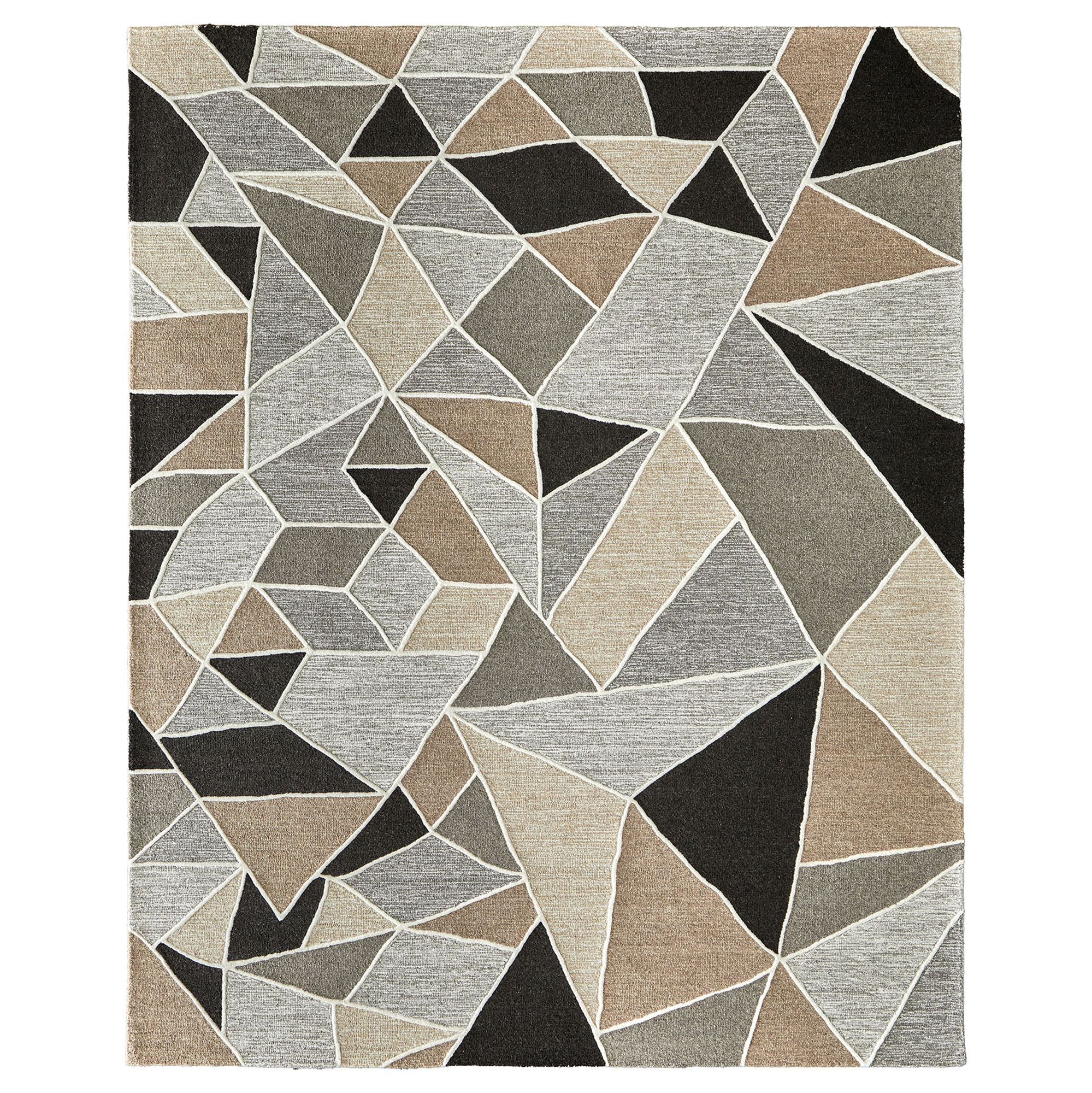 The neutral tones, crisp lines, and handcrafted charm make the Eero Rug the perfect complement to a variety of decor styles. Hand-hooked from wool, the .67" thick rug features a unique hi-low textured pile with dimensional ivory borders surrounding various geometric shapes. Heathered hues of black, beige, gray, charcoal, tan, and ivory fill the designs with an inviting neutral color palette. Backing is cotton. We recommend professional cleaning by a rug cleaner. Imported.