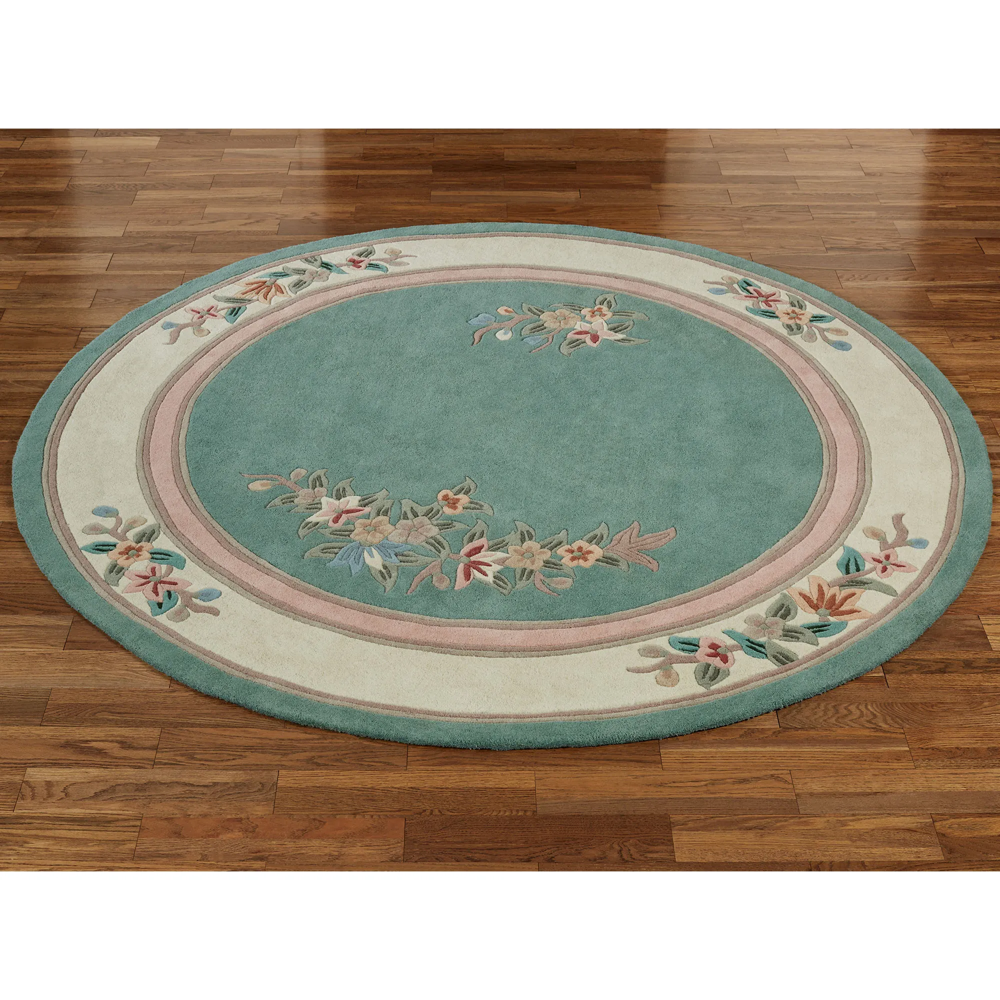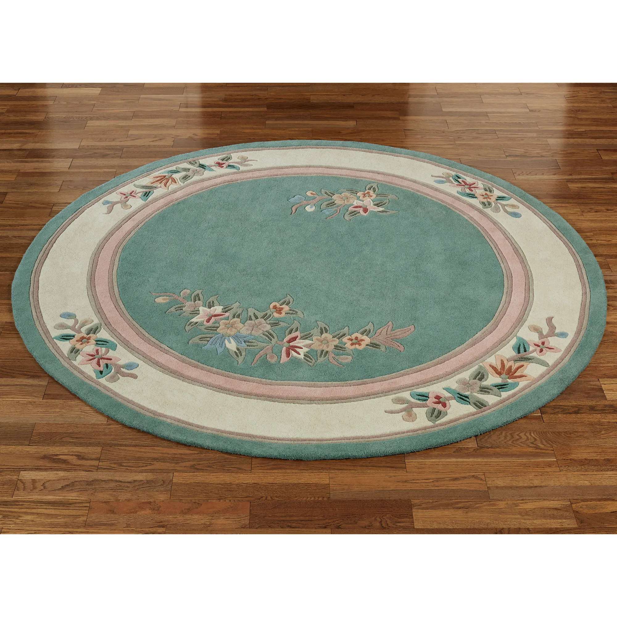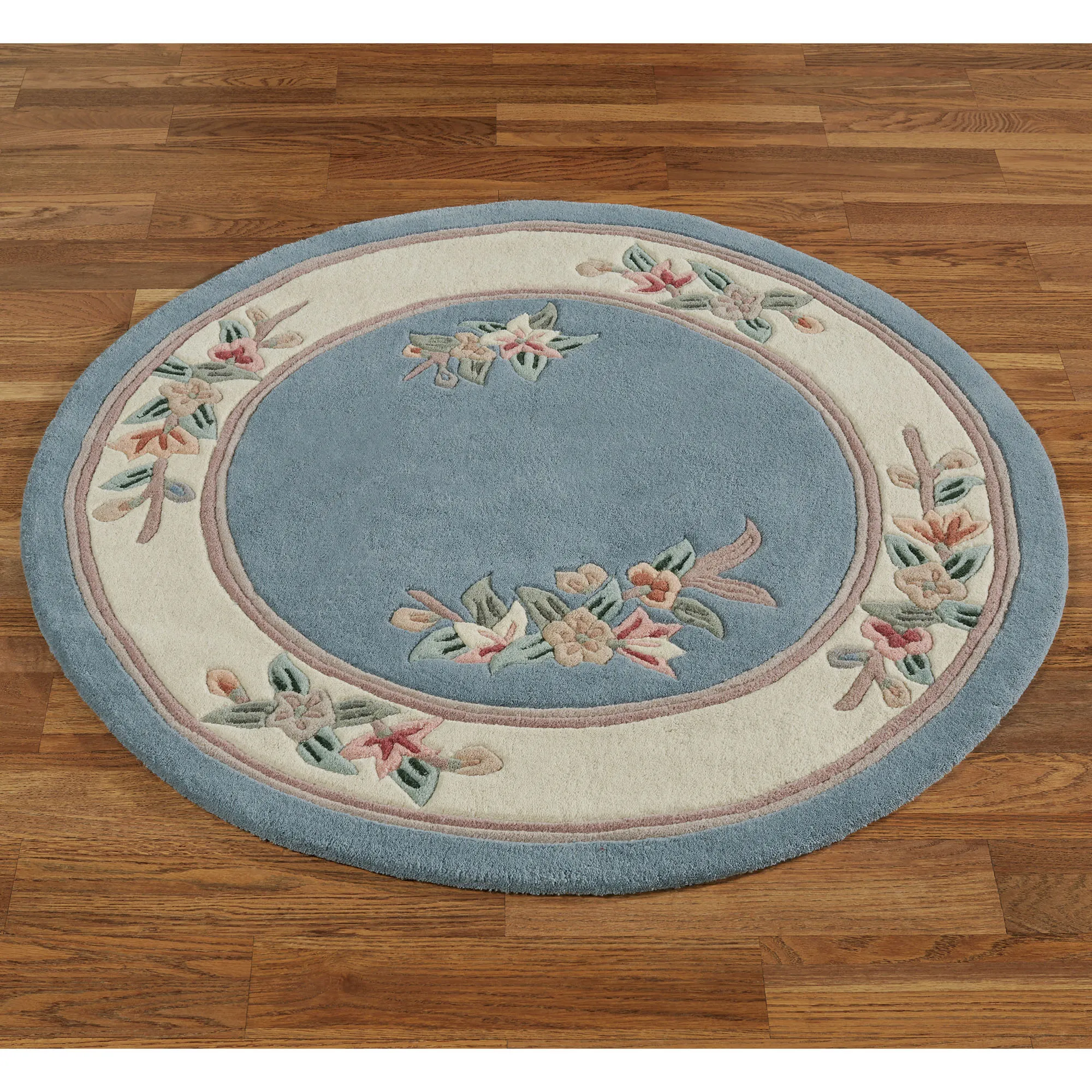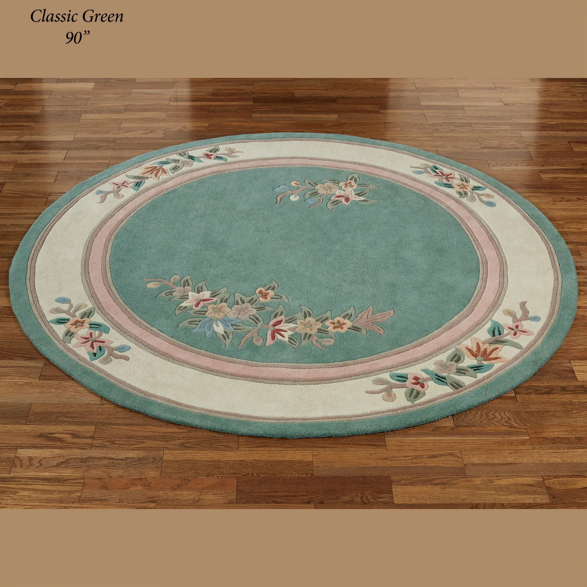 The Elegant Floral II Round Rug showcases blossoming beauty. Hand-tufted in India, the .5" thick, luster-washed wool rug features handcarved floral sprays across an ivory and soothing solid color field and border design. Backing is cotton-covered latex. We recommend professional cleaning by a rug cleaner.