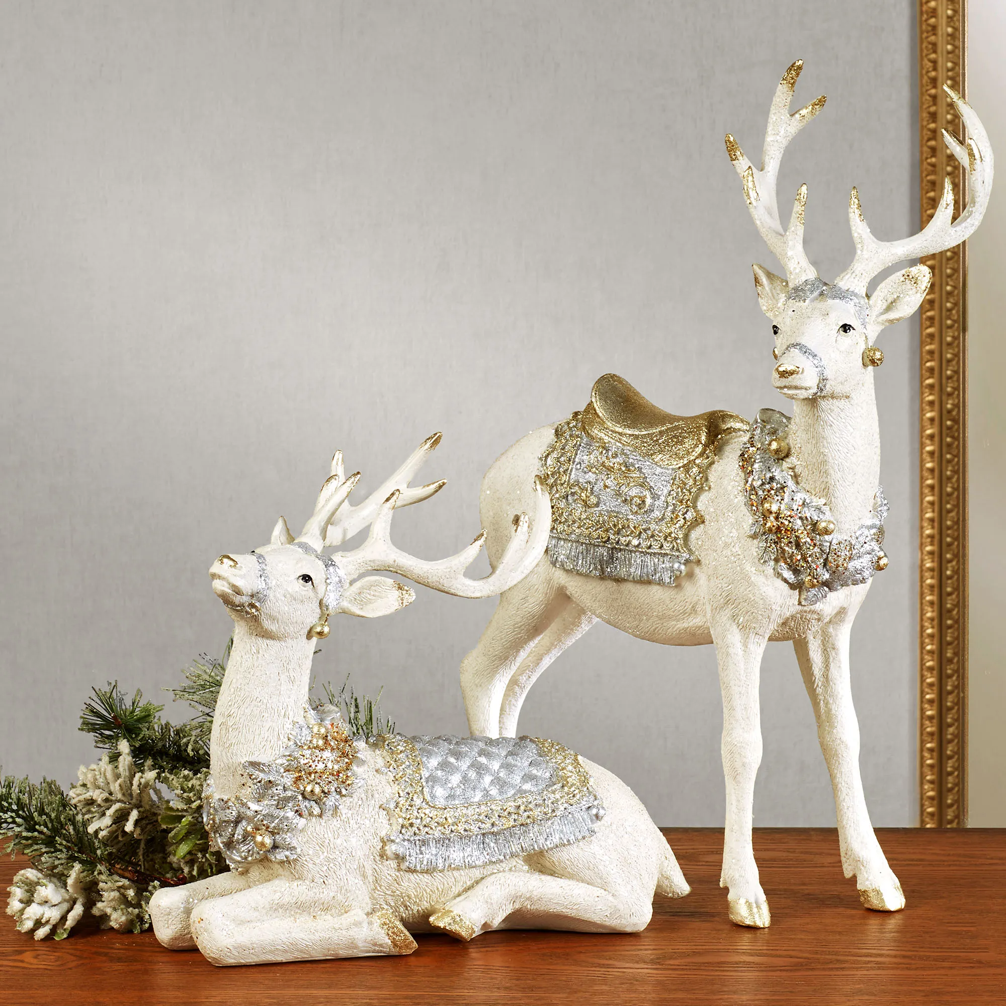 • Off-white deer wear silver and gold adornments