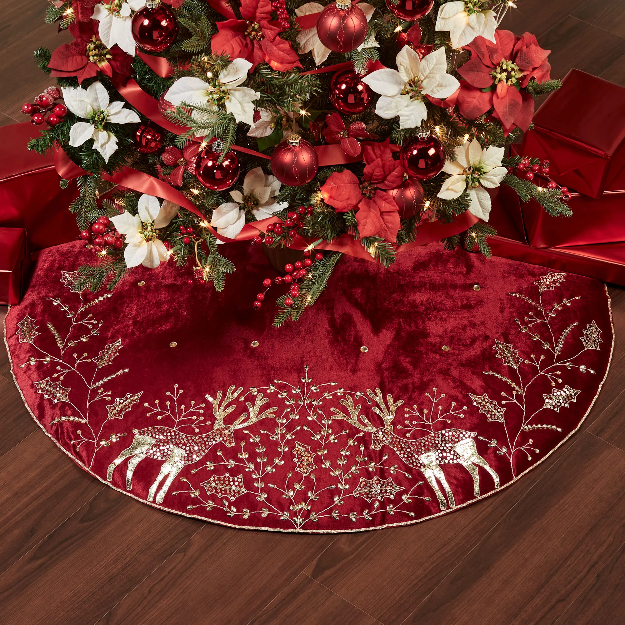 • Deep red Christmas tree skirt