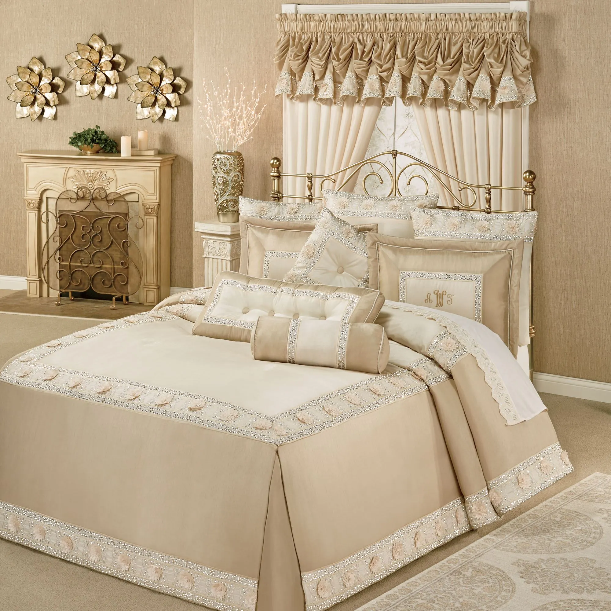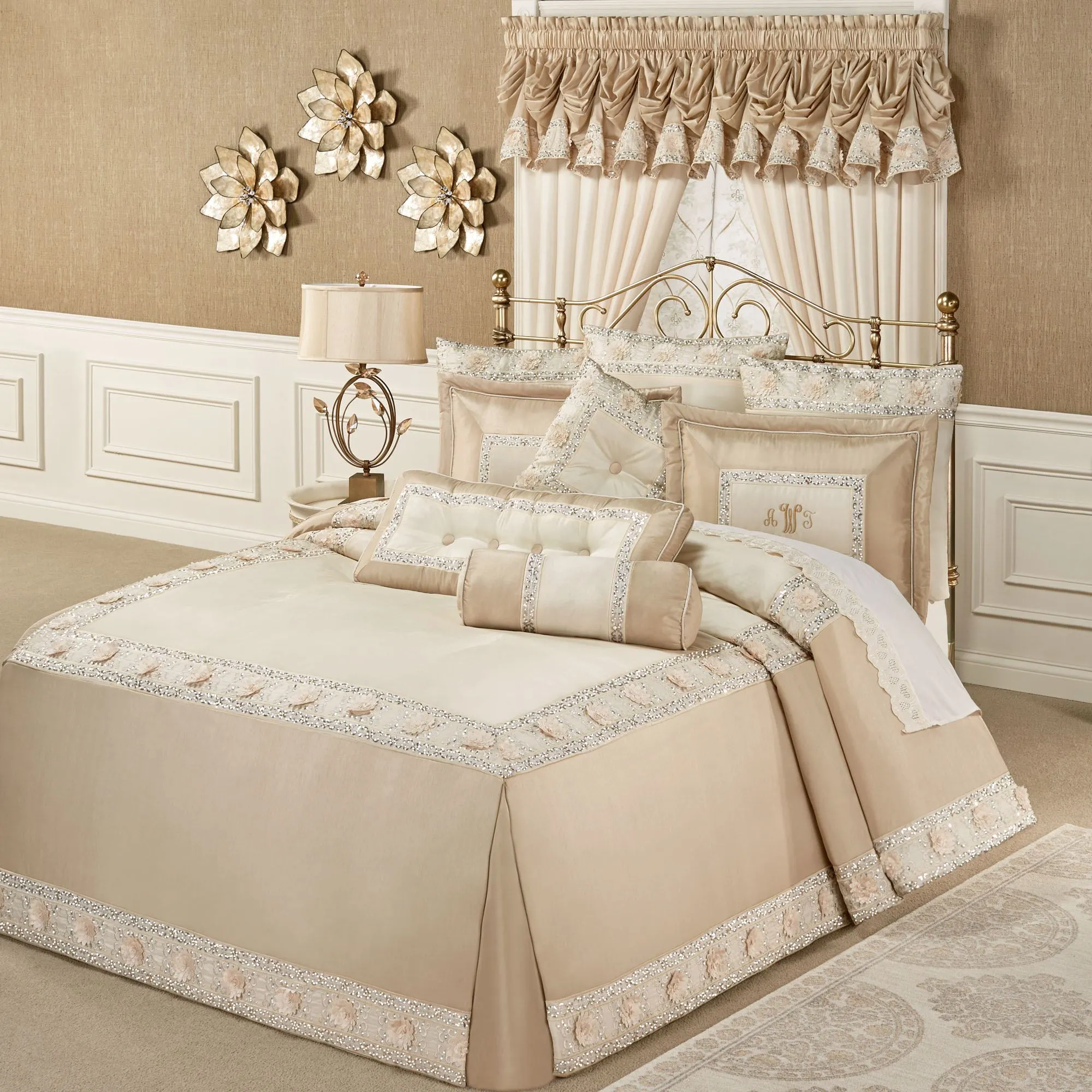 Treat yourself to blissful relaxation and pamper yourself with the Elegante Bedding. Polyester ensemble has faux silk in light cream and light gold, accented by metallic gold and ivory embroidery, sequins, silver detailing, and fabric florals.