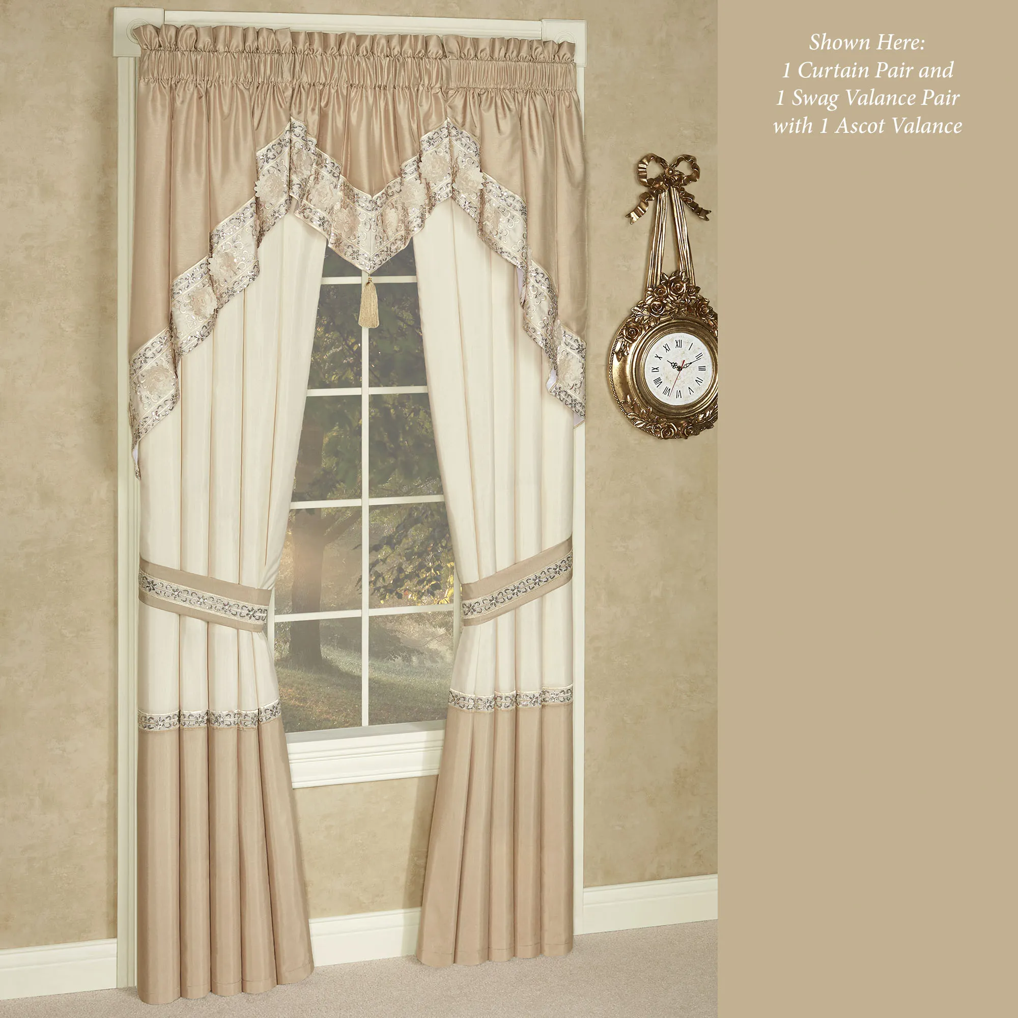 Window Treatment: Most have 3" rod pockets. Lined, tailored Curtains are light cream with light gold bottoms, separated by a sequin and metallic trim border; tiebacks are included. Available in two lengths. Valances are light gold with fabric florals and metallic/sequin trim at the bottom edge. Tuck Valance is lined. Toga Swag Valance forms its own 3" rod pocket. We recommend one for each 12"-15" of window. Ascot Valance is lined. Swag Valance Pair is lined.