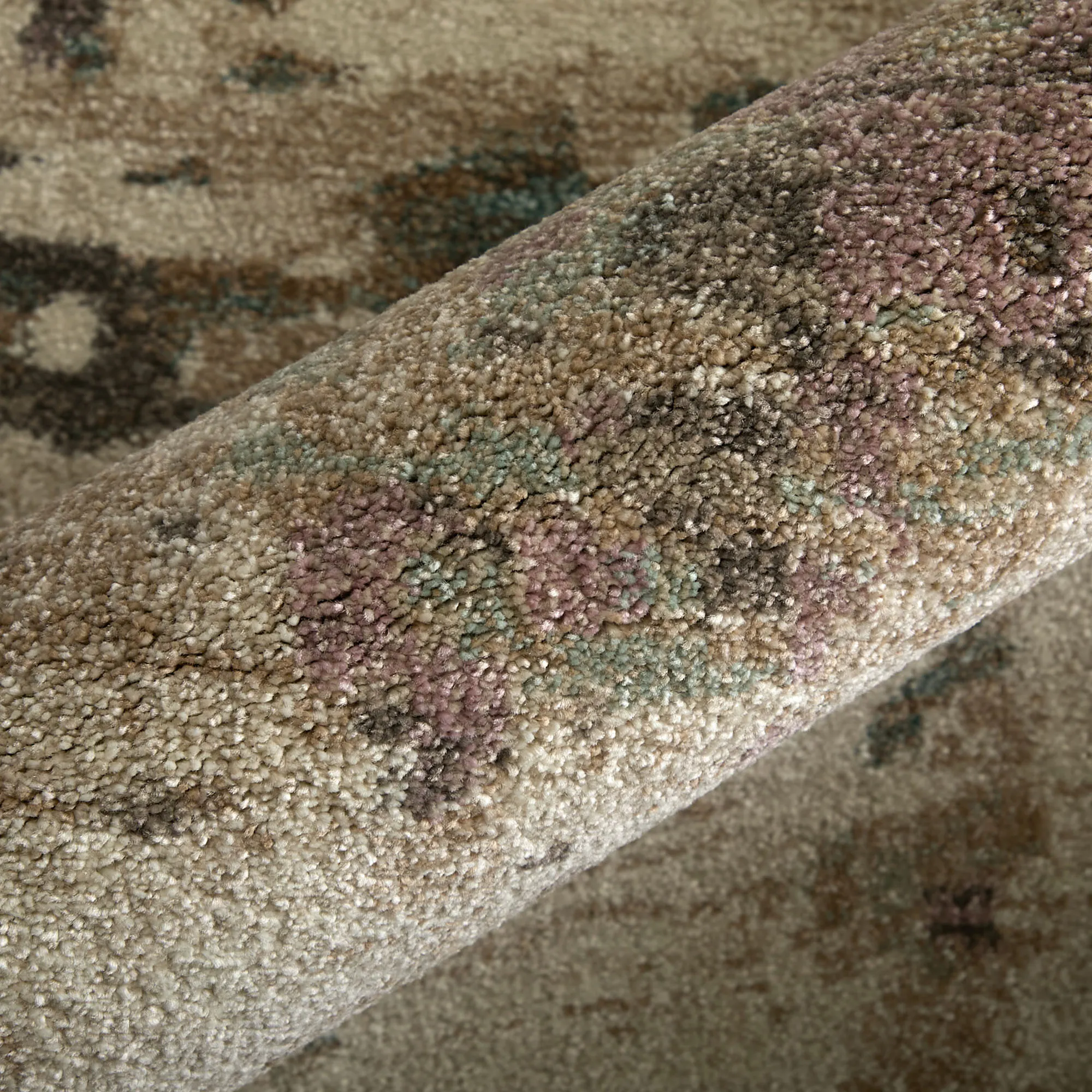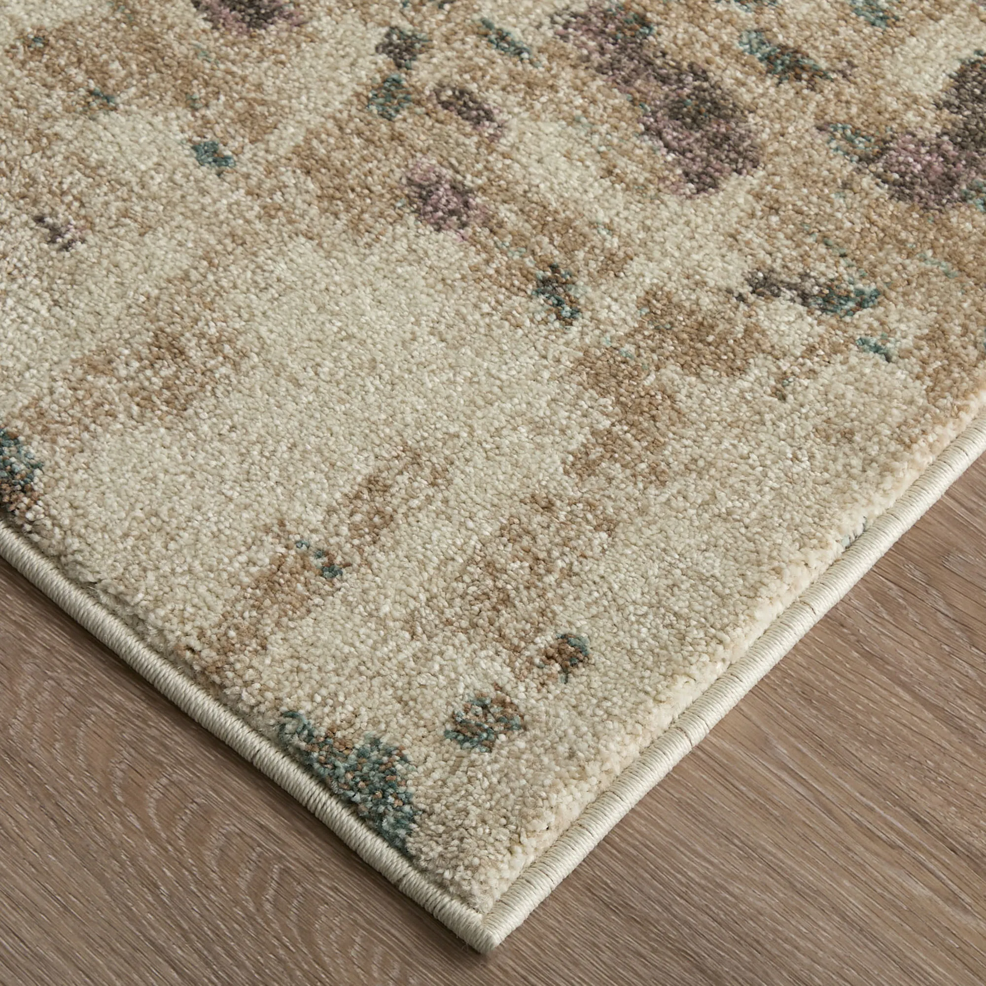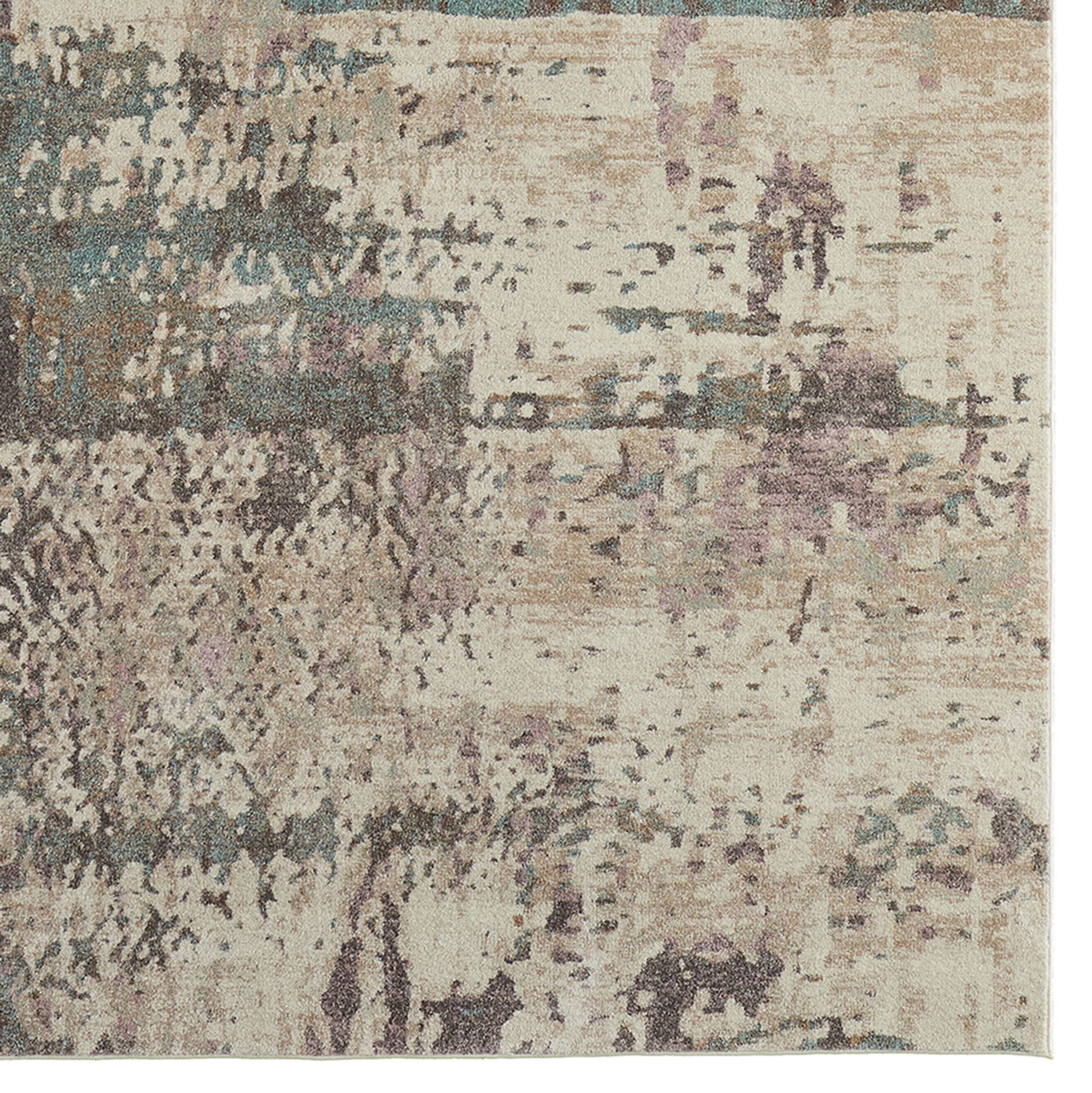 Distressed abstract patterns are scattered all over the Elena Rug. This power-loomed polypropylene area rug, .47" thick, has serged edges and includes shades of ivory, teal, beige, brown, taupe, plum, and lavender. We recommend professional cleaning by a rug cleaner. Imported.
