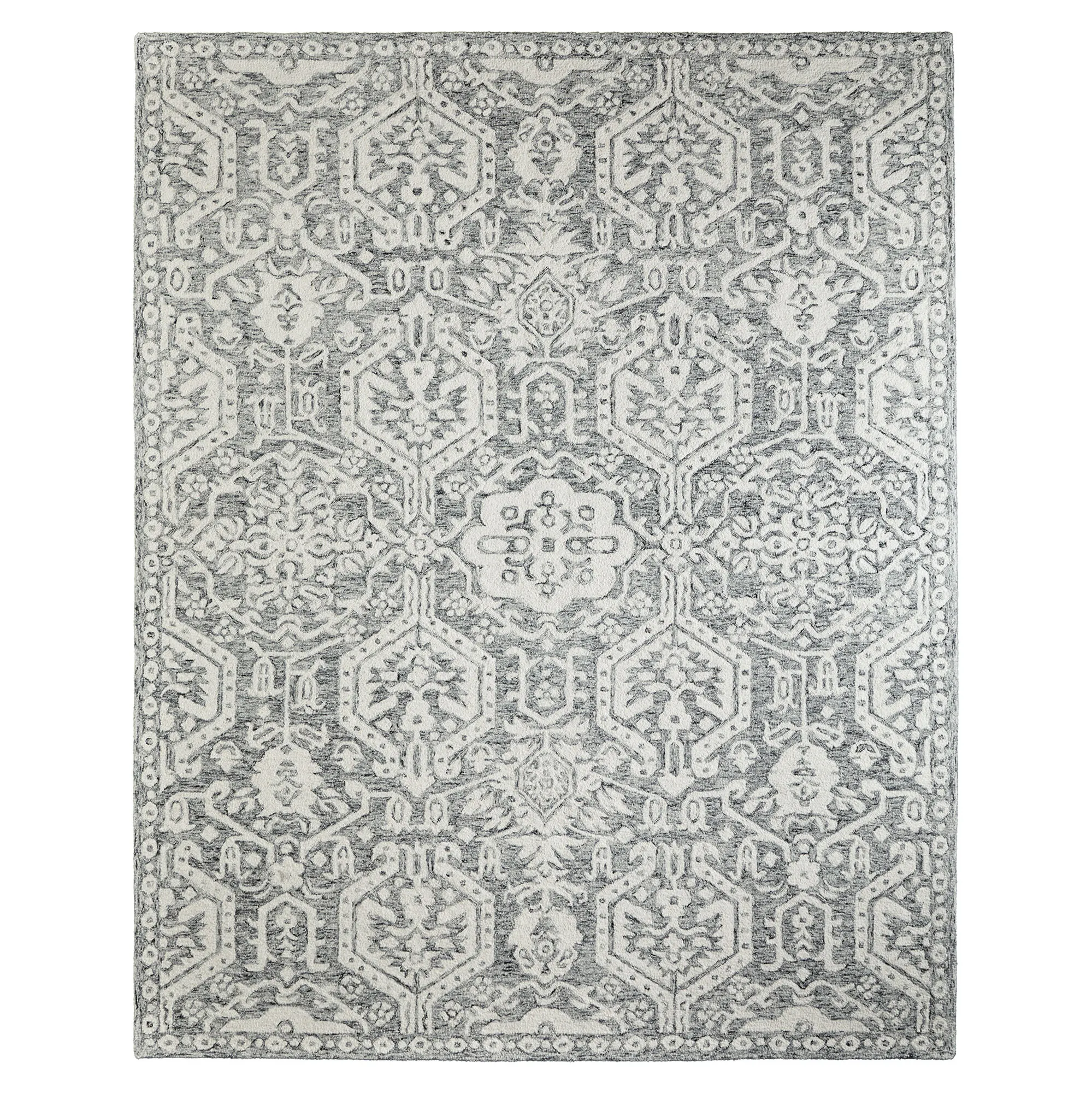 The intricate medallion motifs on the Eleni Rug offer a refined look for any modern interior. This hand-hooked wool area rug, .5" thick, has ornate designs. Colors include shades of gray, light blue, ivory, and hints of charcoal. The natural lanolin in this rug allows it to be fade-, water-, and stain-resistant. Backing is cotton. We recommend professional cleaning by a rug cleaner. Imported.