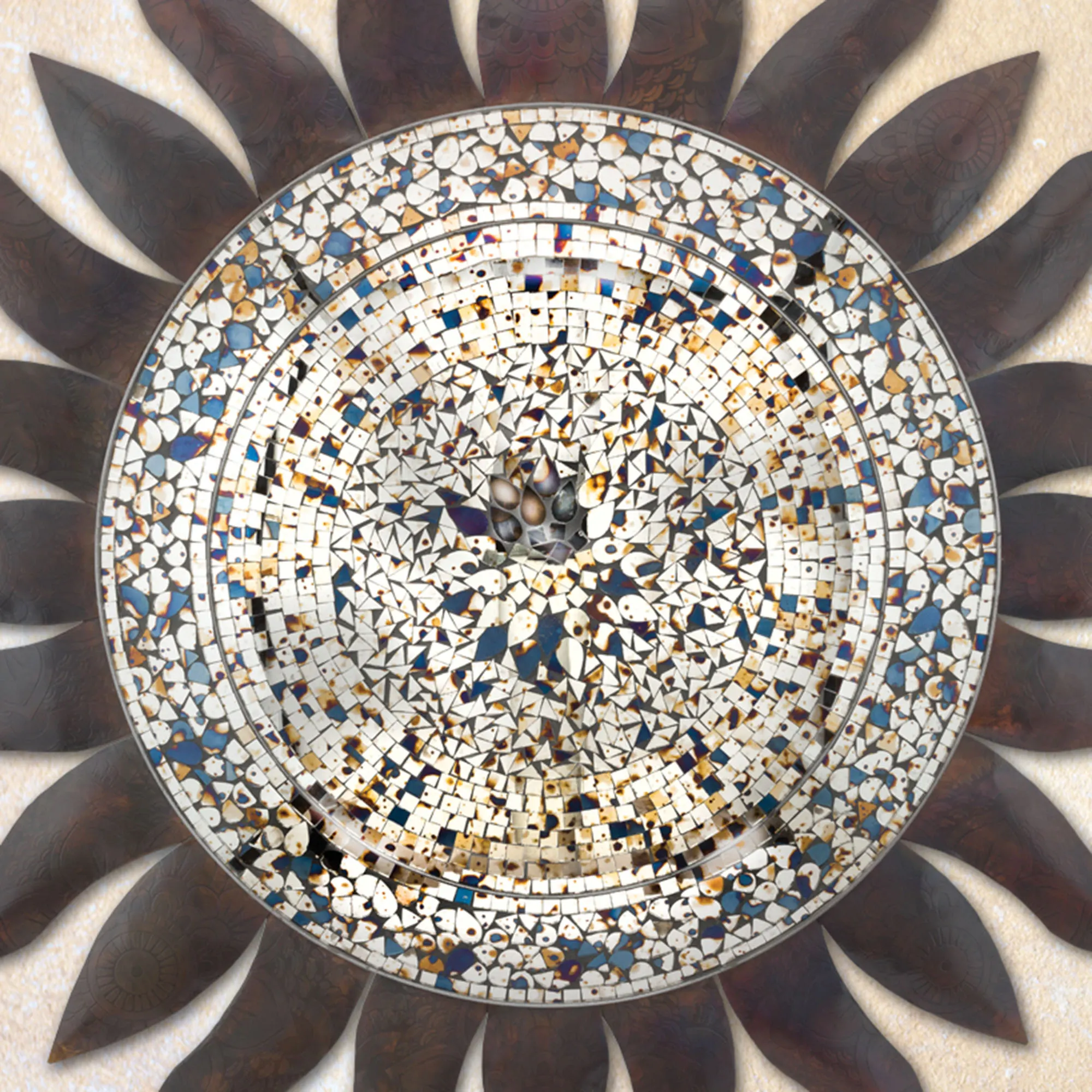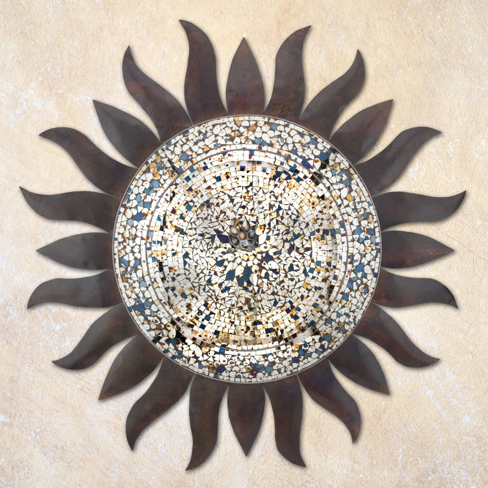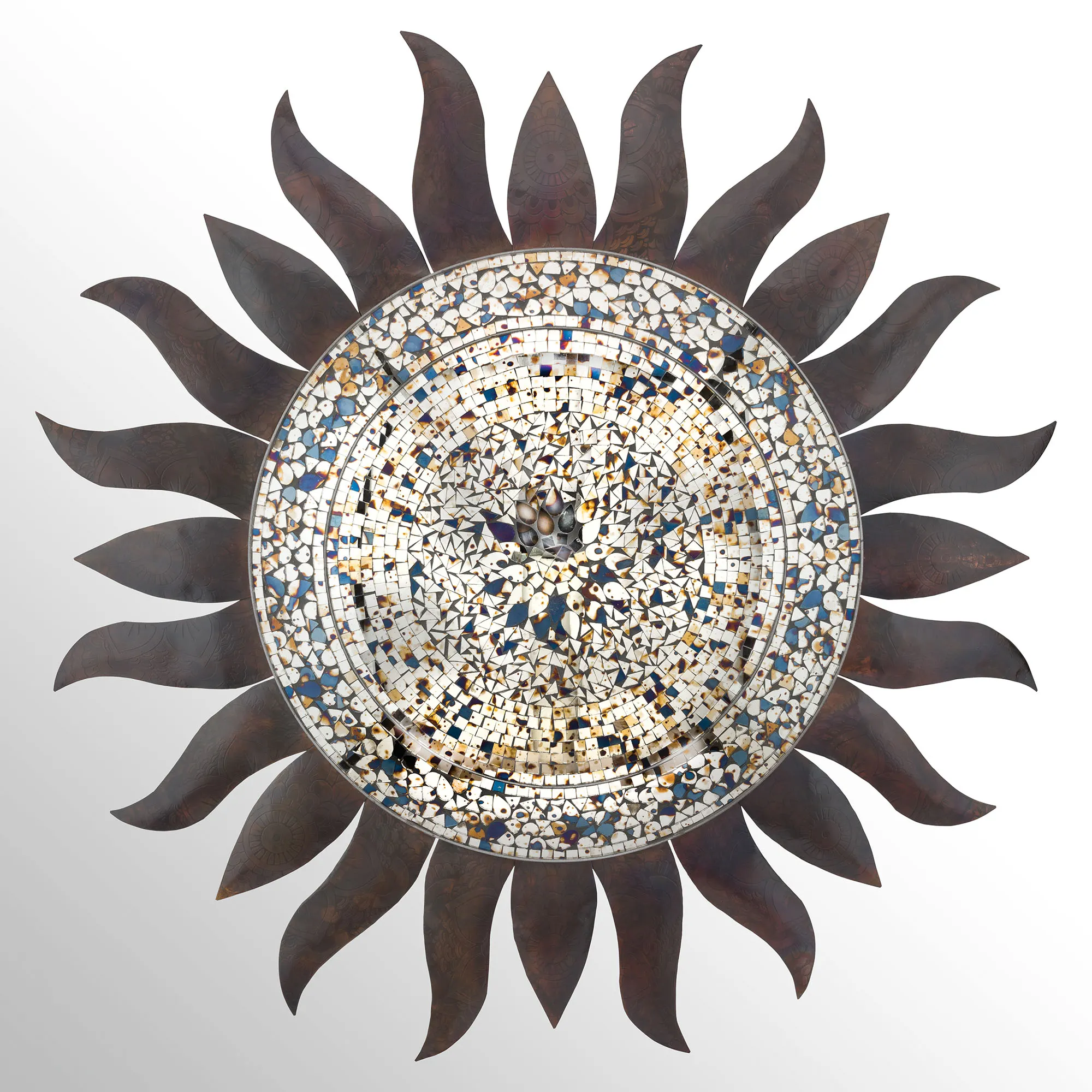 Bask in the beauty of the Eliana Sun Wall Sculpture indoors or outdoors year round. Hand-placed with care, the mirrored glass mosaic tiles fill the sun's center with undertones of blue and tan. Wavy metal rays surround the center with a bronze and copper flame finish. Overall, the sun wall sculpture measures 36"dia.x2"D.