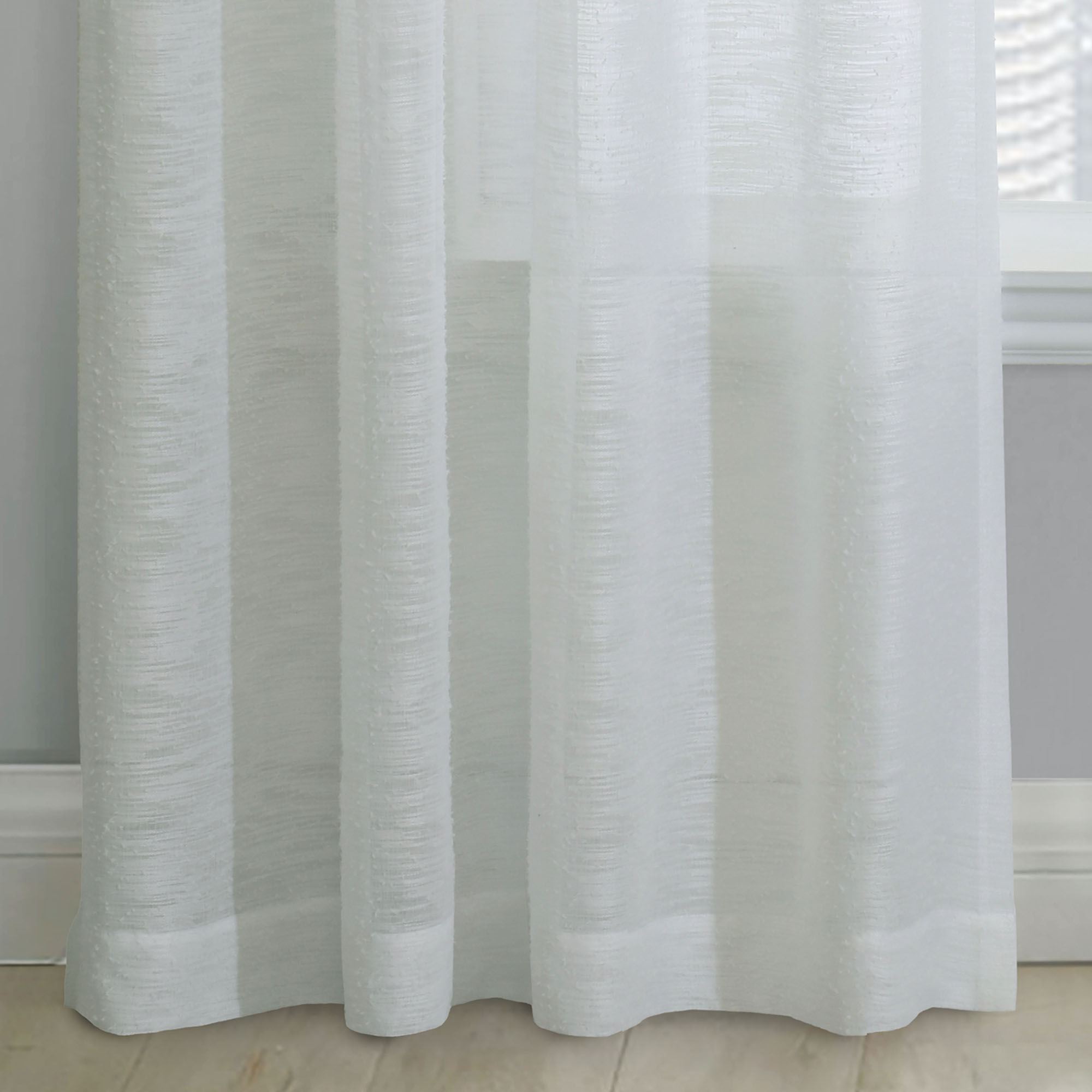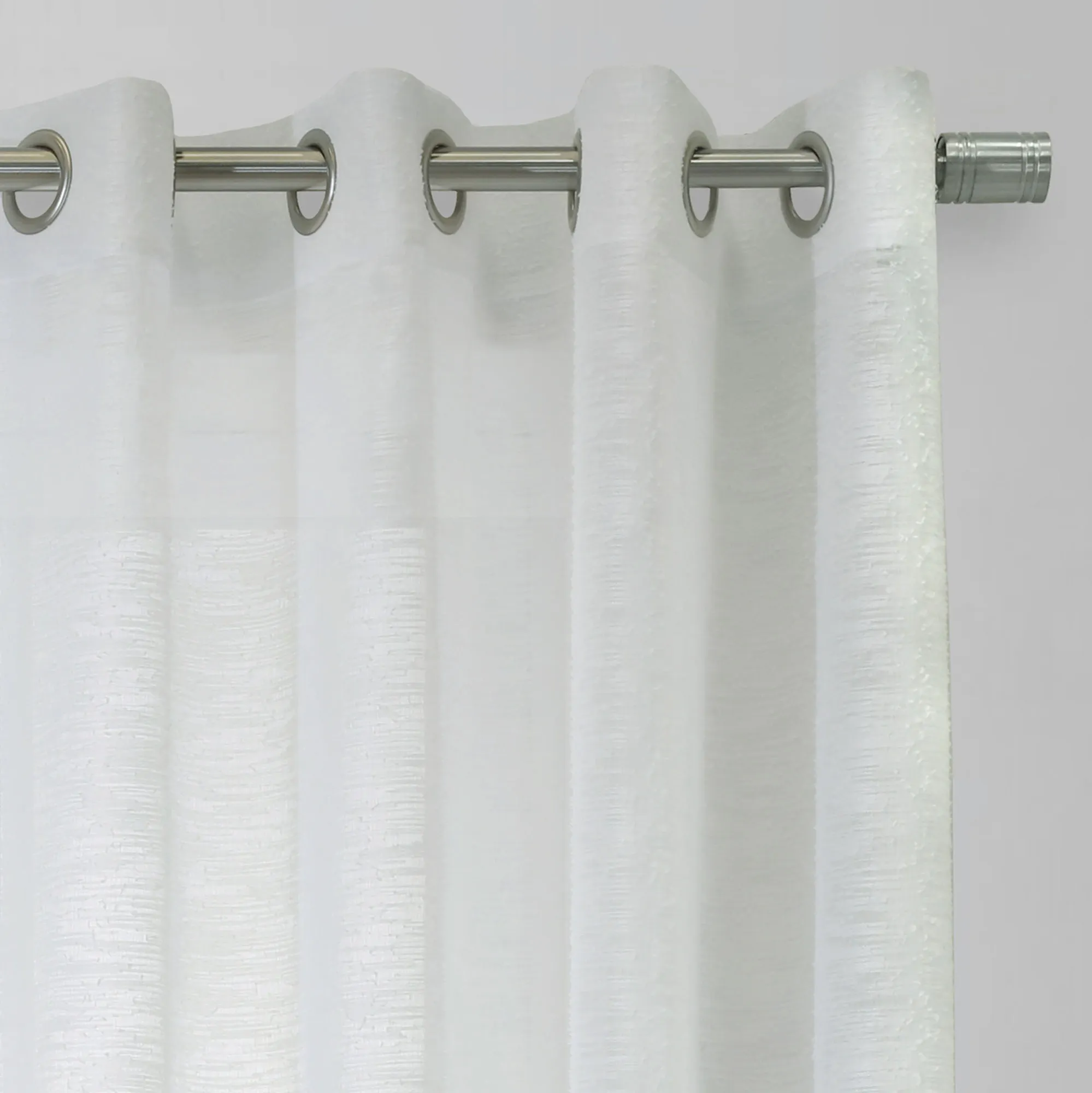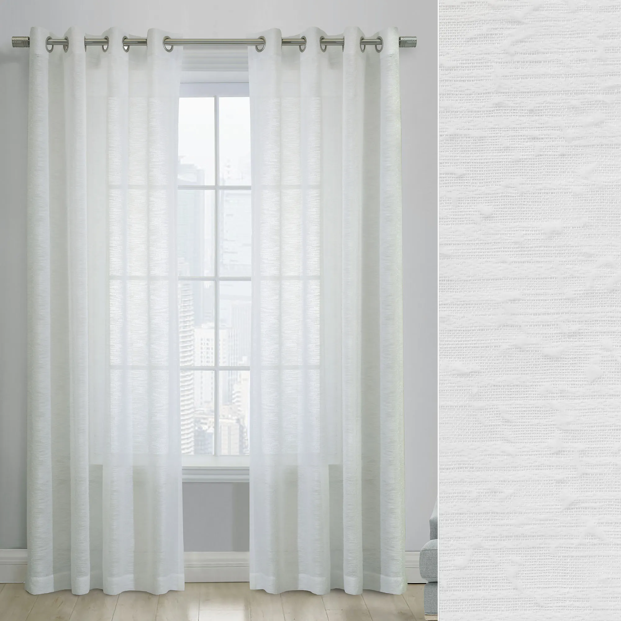 Accent a space with the dreamy appeal of the Elina Curtain Panel. In a solid color, the sheer window panel features a slubbed, boucle-like polyester with an inviting drape that invites natural light into your home. Sold individually, each 52"W panel hangs via 1.5" dia. matte silver metal grommets. Machine washable. Imported.