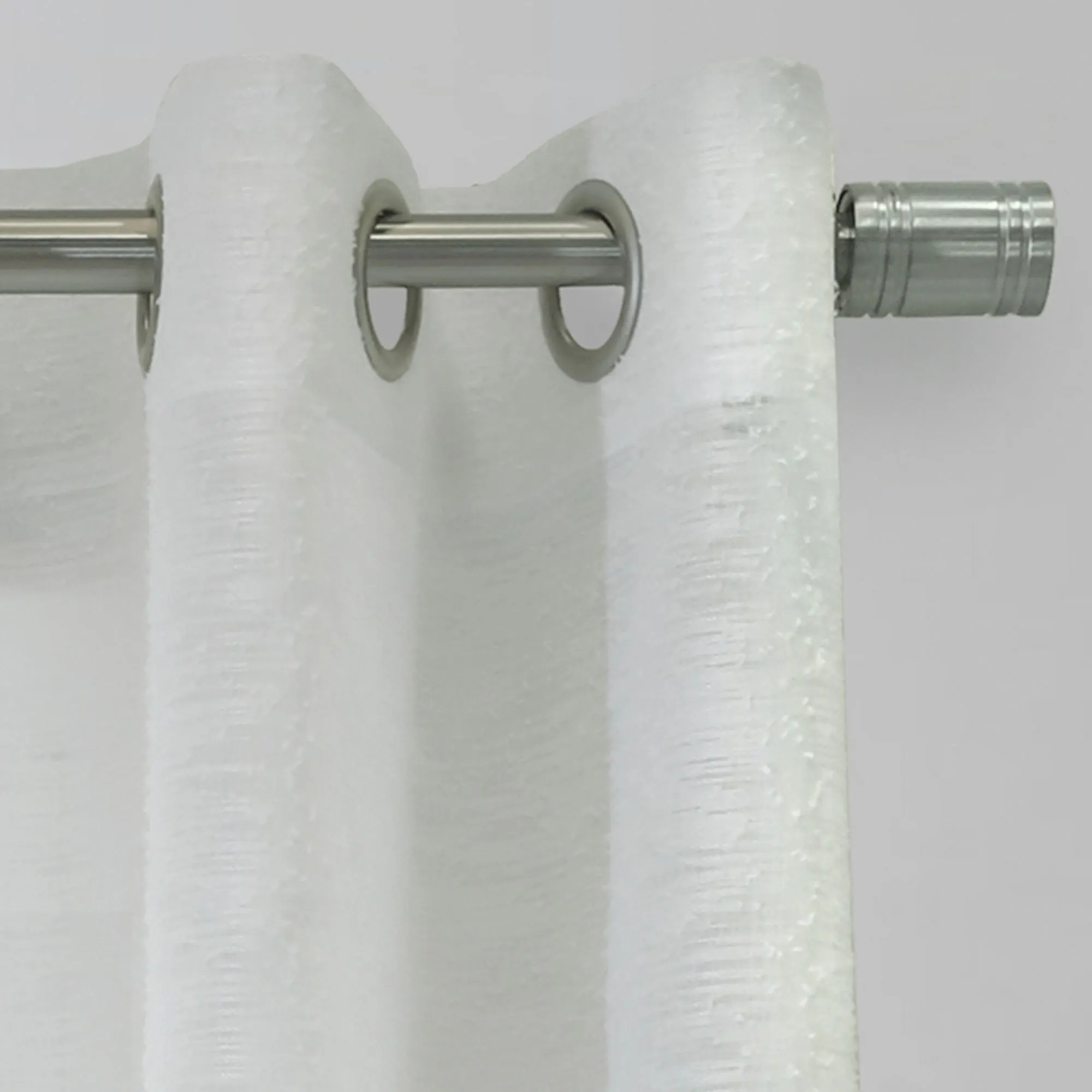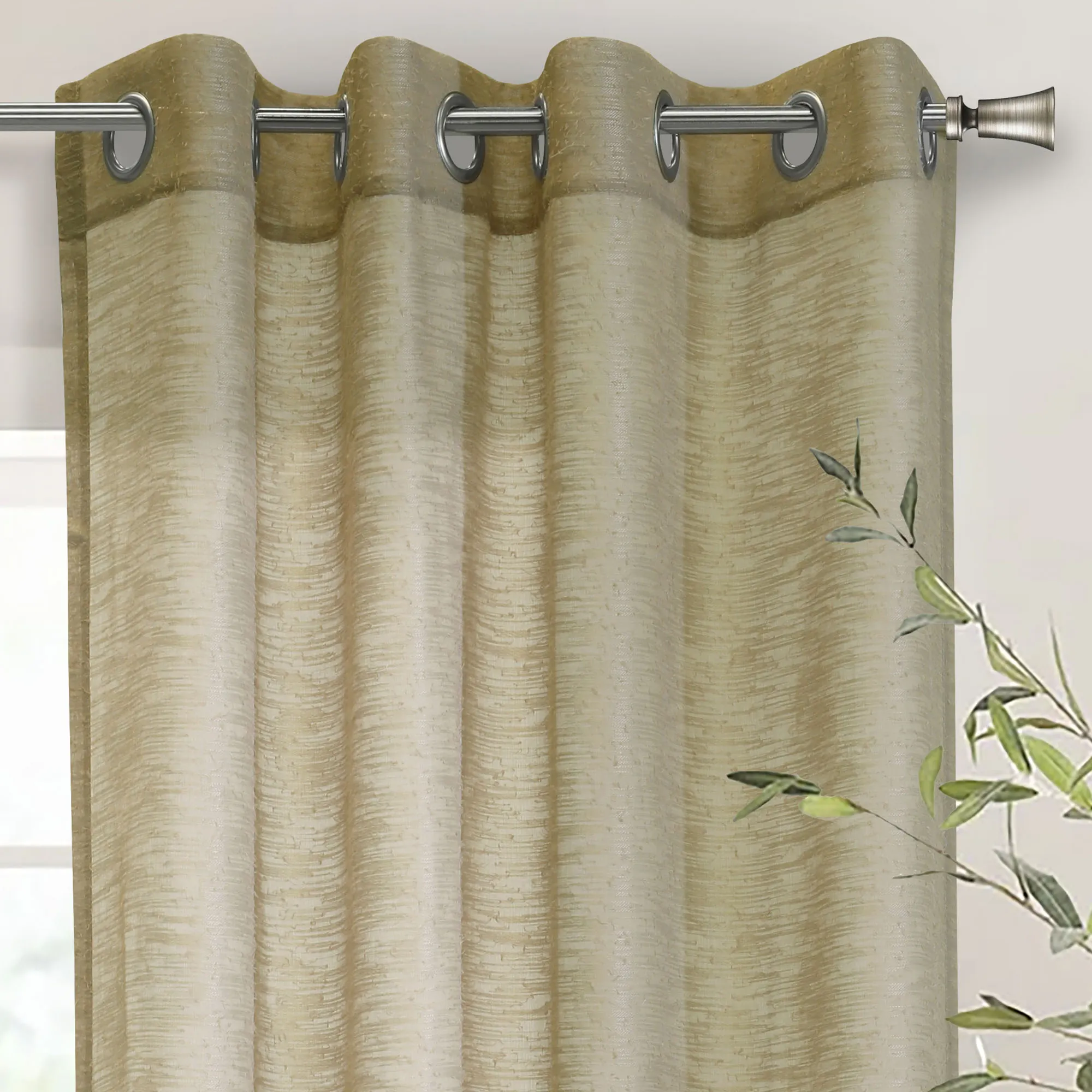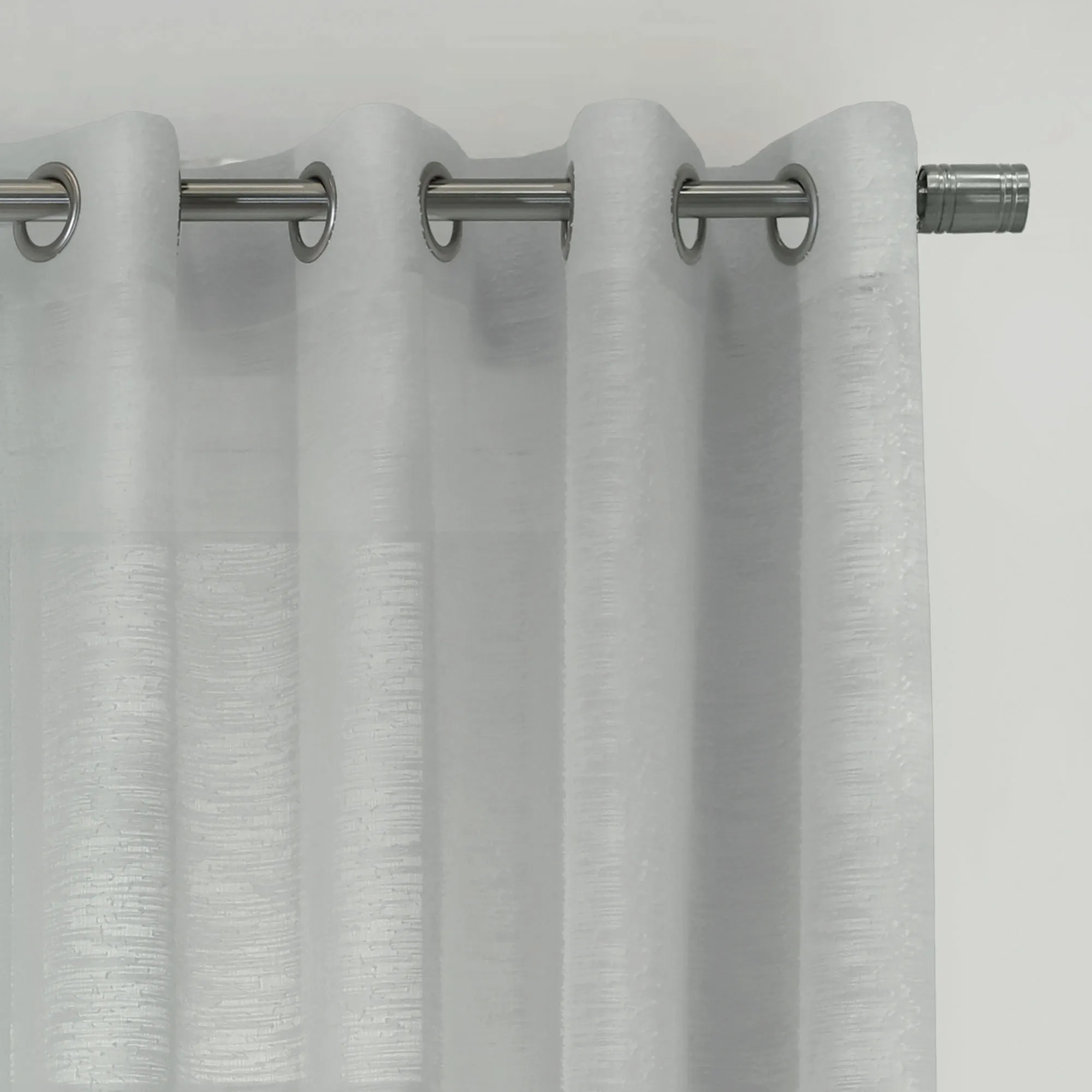 Accent a space with the dreamy appeal of the Elina Curtain Panel. In a solid color, the sheer window panel features a slubbed, boucle-like polyester with an inviting drape that invites natural light into your home. Sold individually, each 52"W panel hangs via 1.5" dia. matte silver metal grommets. Machine washable. Imported.
