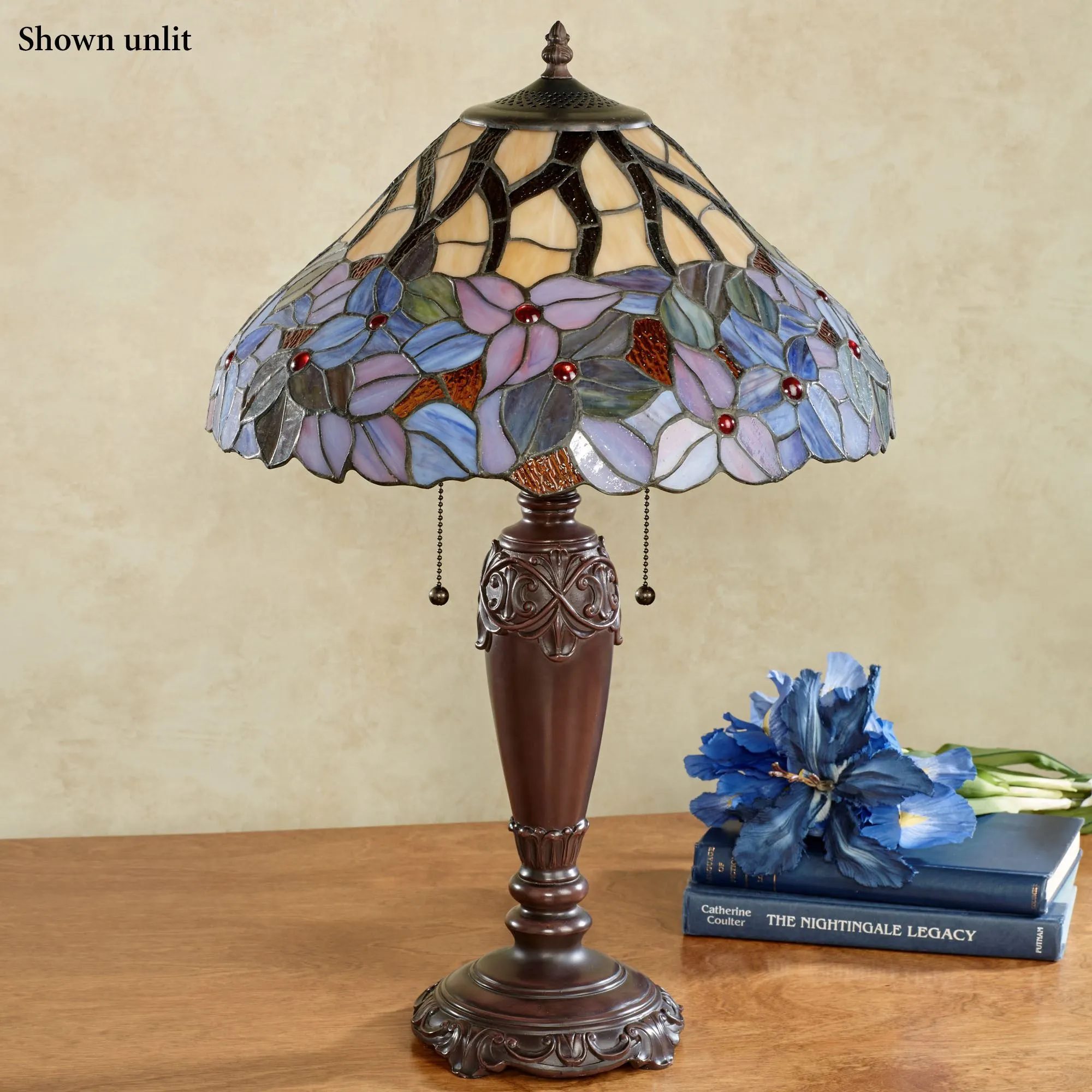 Pretty flowers blossom beautifully on the Elina Stained Glass Table Lamp. Made of resin with an antique brown finish, this handcrafted table lamp has scrolls and fleurs. The hand-cut and hand-soldered, stained art glass shade includes colors of lavender, purple, periwinkle blue, red, and amber. UL listed. Requires two 60W max. bulbs. Lamp has dual pull chains. Measures 16"dia.x23"H, including the 1.25"H finial.