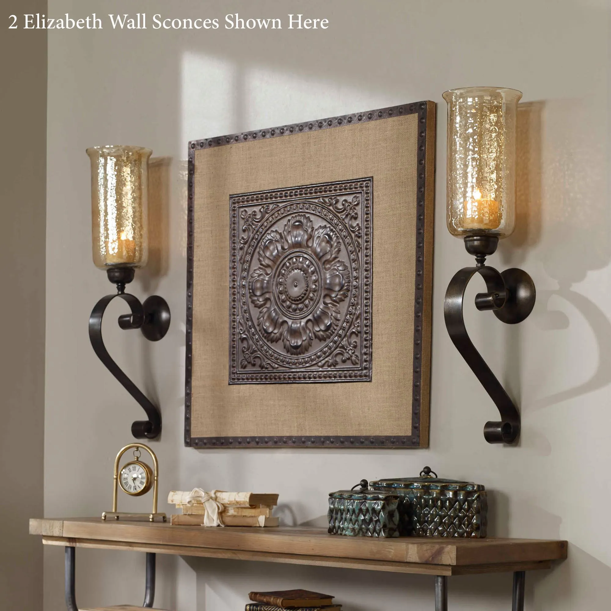 The Elizabeth Hurricane Wall Sconce makes a grand, elegant statement. From Uttermost, the hand-forged metal wall sconce features a curling antique bronze base beneath the large transparent amber glass hurricane. The included ivory candle measures 3"dia.x3"H. Overall, the wall sconce measures 7"Wx8.5"Dx30"H.
