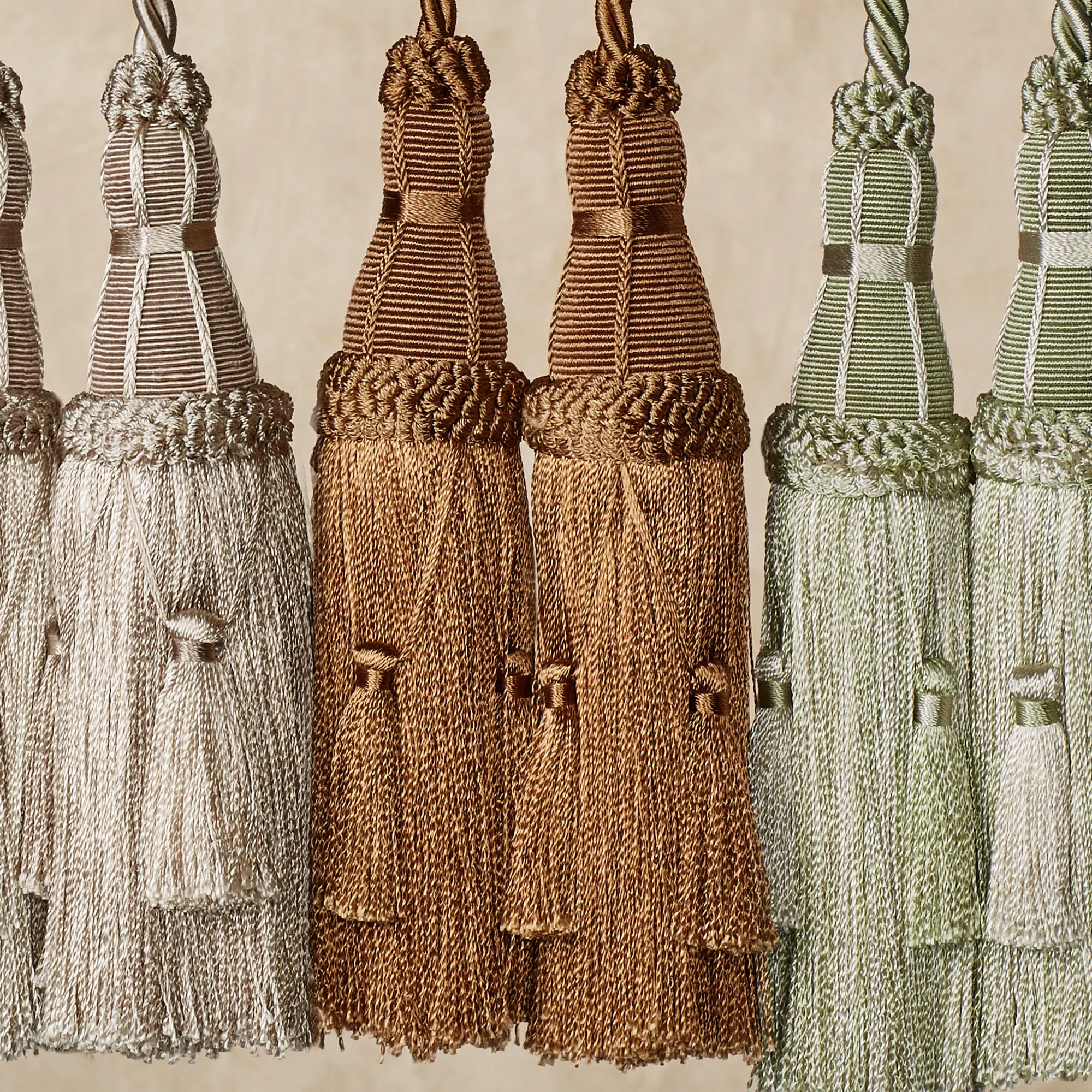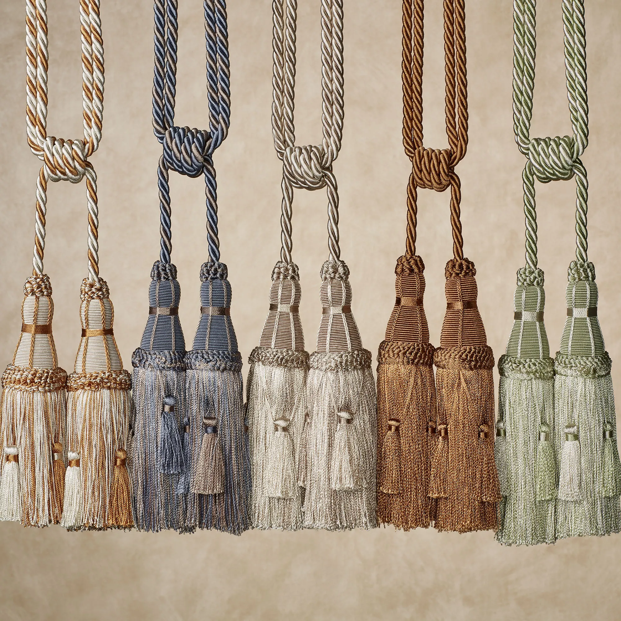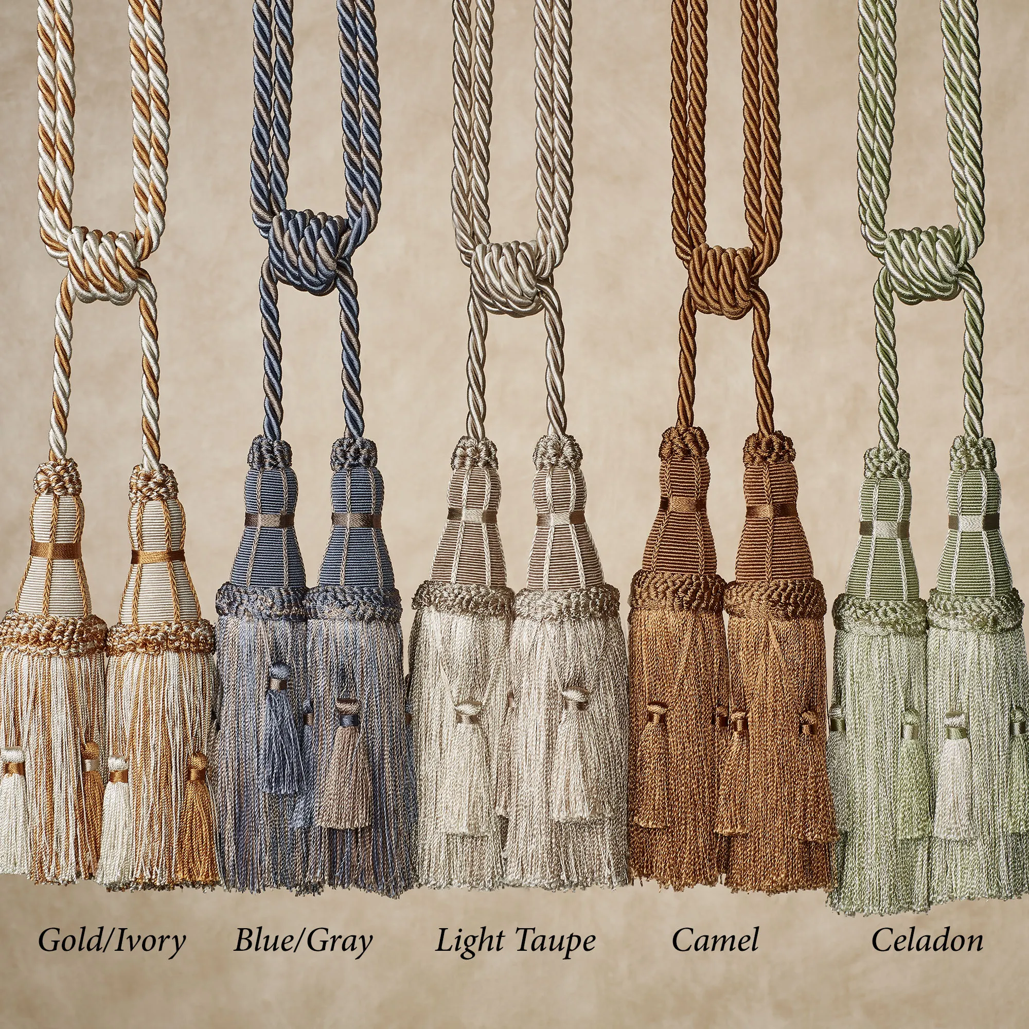 Elegantly enhance your curtain panel, drapery, or tapestry with the Elizabeth Decorative Tassel. The handcrafted, silky rayon accent has two 8"L end tassels accented with mini tassels. The twisted rope cord makes hanging a breeze. Tassel is sold individually. Specify Camel, Celadon with platinum accents, or Gold with Ivory accents. Overall, measures approx. 26"L. Steaming or professional cleaning is recommended. Imported.