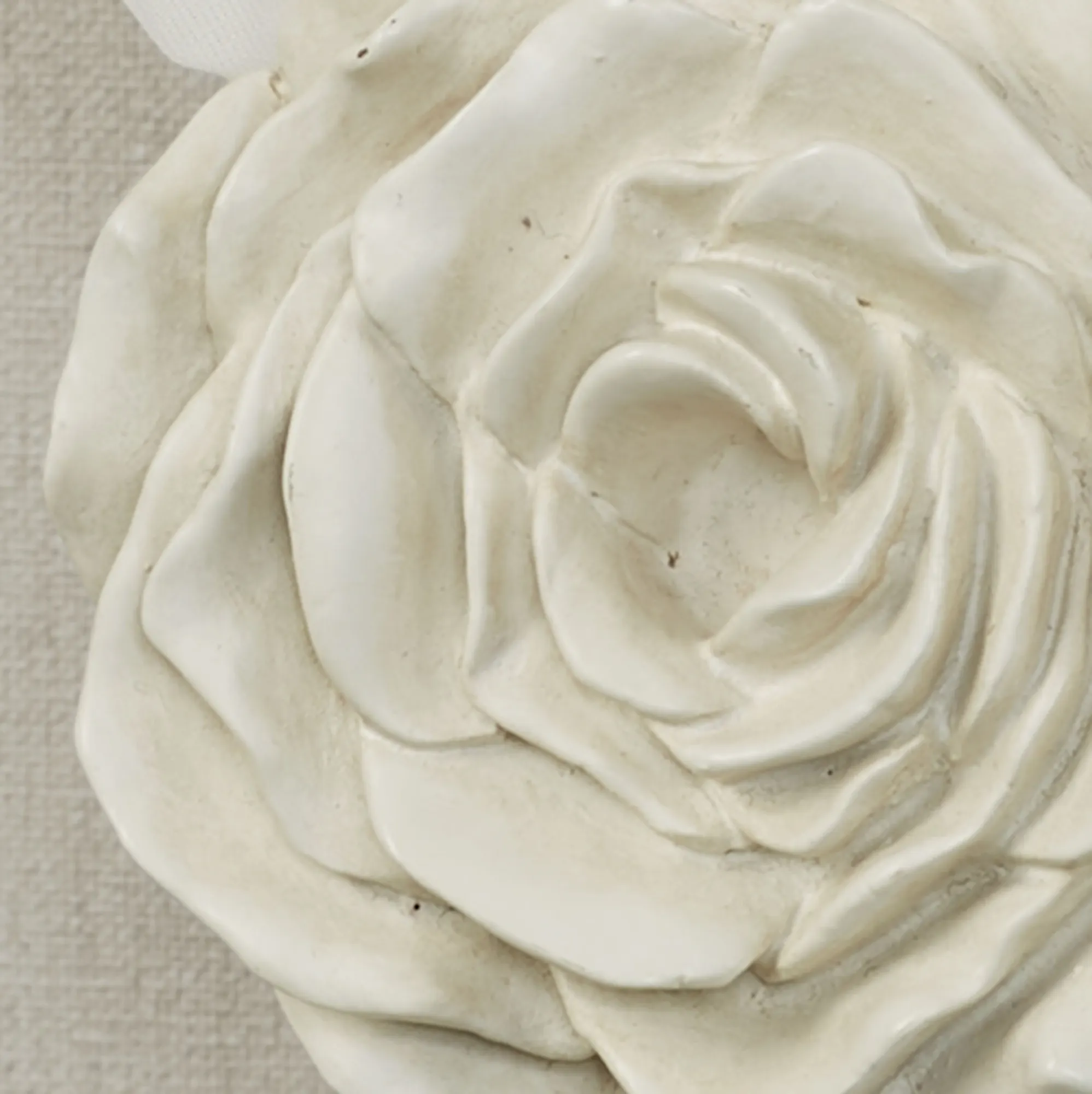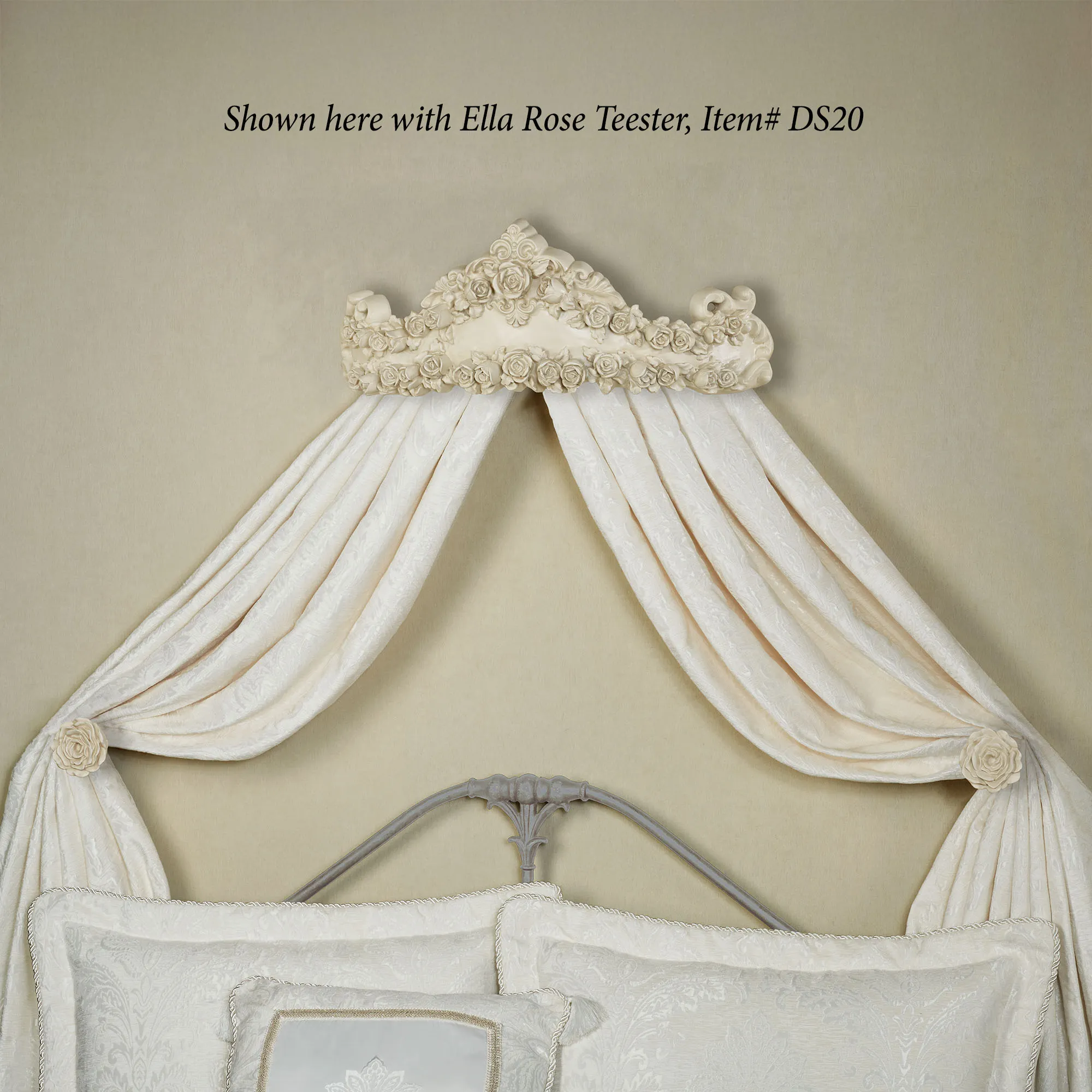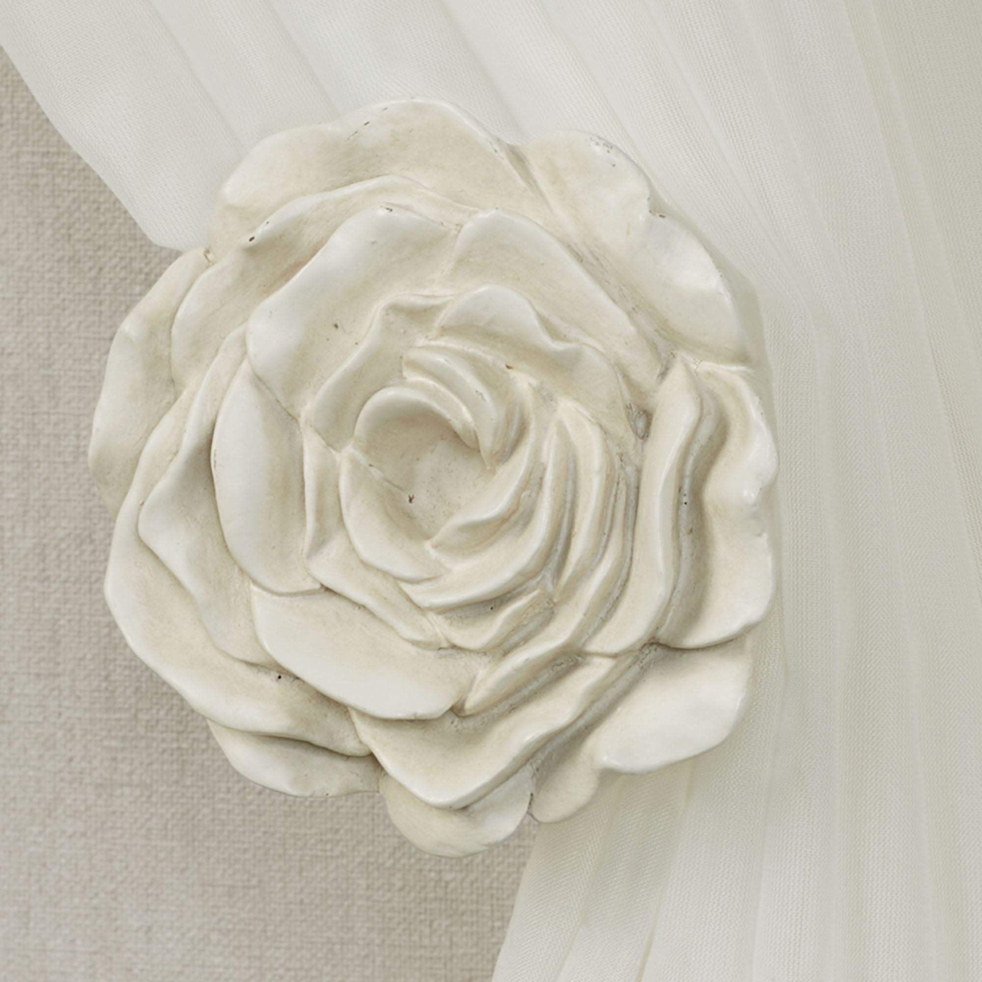 The Ella Rose Antique Ivory Curtain Tieback Pair adds classic allure to your window or teester display. Resembling a beautiful blooming rose, each resin holdback is handpainted in antique ivory and projects 5" to hold your curtain panels or sheers. Overall, each tieback measures 3.5"dia.x6"D.
