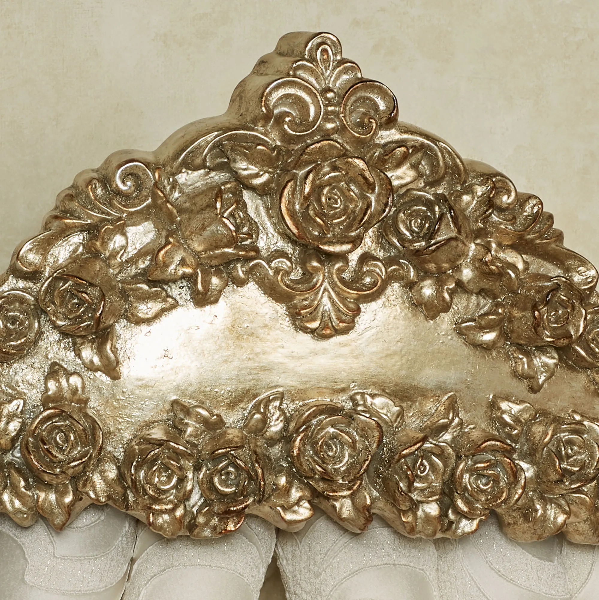 The Ella Rose Satin Gold Wall Teester blossoms with regal grace. With a delightful scalloped crown shape, the resin design has a satin gold finish and features elegant rose motifs in relief. The removable bar will hold your scarves or panels for a grand look. The maximum recommended load weight is 12 lbs. Overall, the wall teester measures 24"Wx9.5"Dx9.5"H.