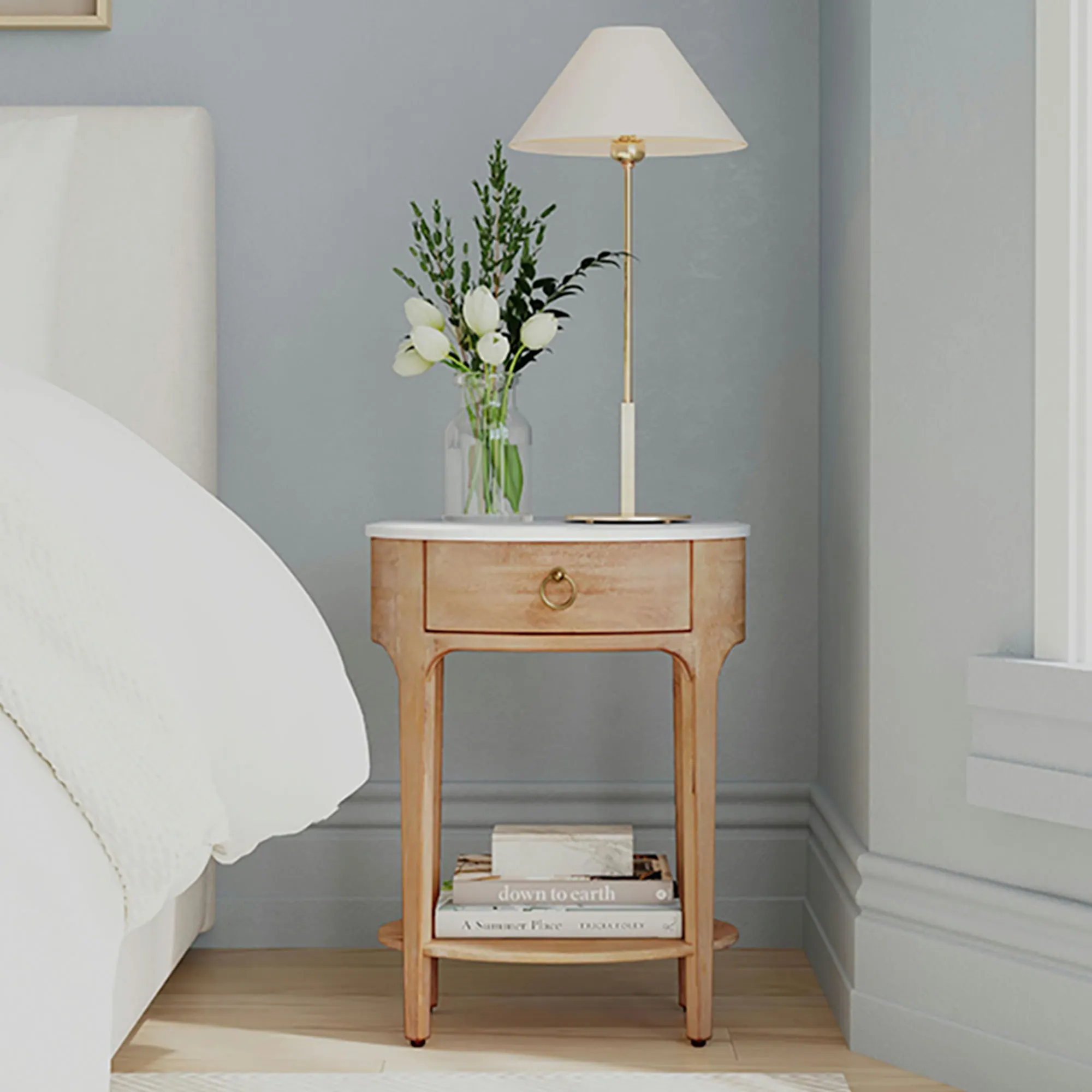 The sleek Ellen Nightstand looks good in any modern setting. This natural-finished wooden nightstand, from Butler Specialty, has an oval shape, a white marble top, and a lower shelf, 17.25"Wx13"D. The drawer, 9.5"Wx9.25"Dx3.25"H, has brass-finished metal hardware. Due to the marble top, slight variations in the veining pattern design and color may occur. The maximum recommended weight is 66 lbs. We recommend the use of coasters on the marble stone top. Measures 18"Wx14"Dx24"H; weighs 22 lbs.