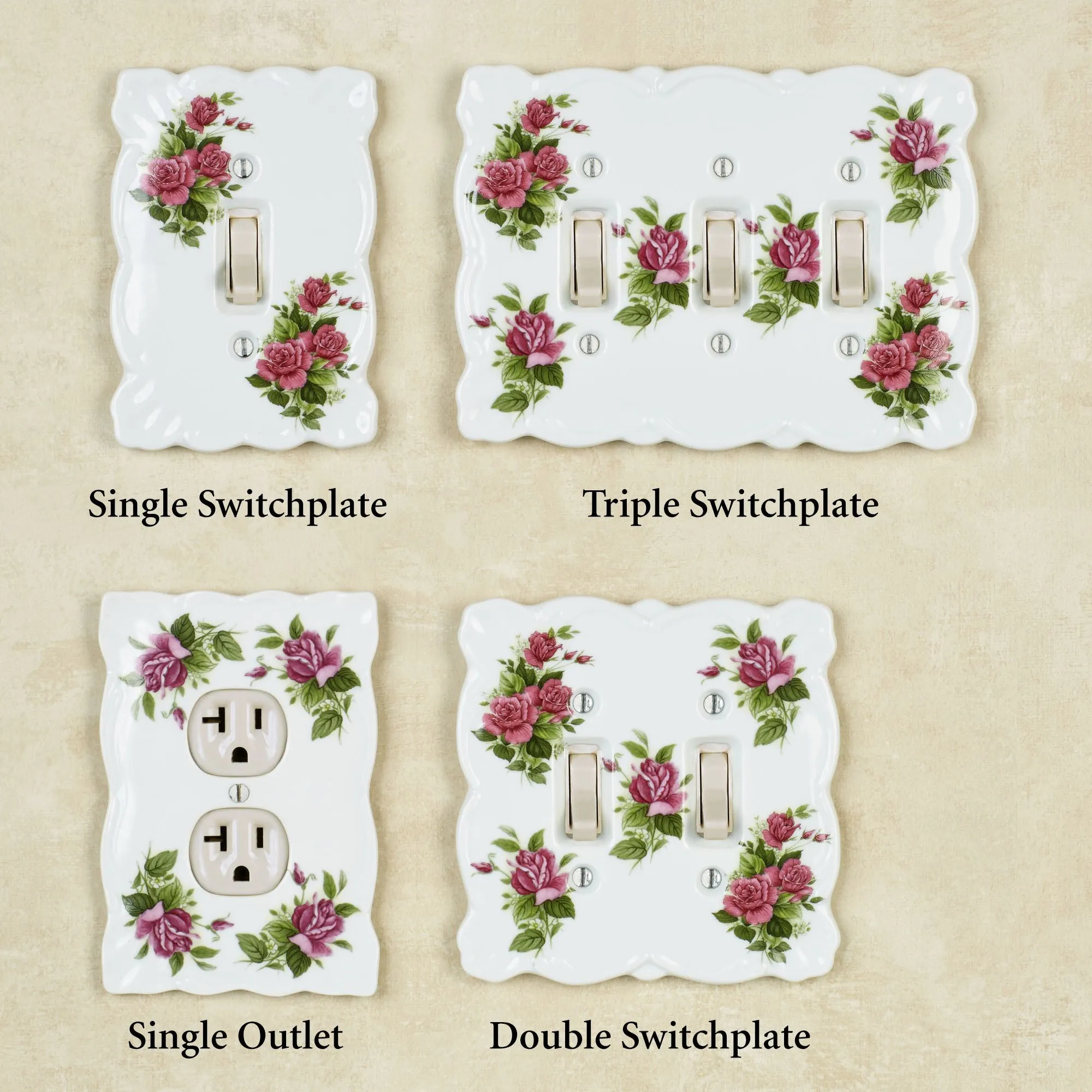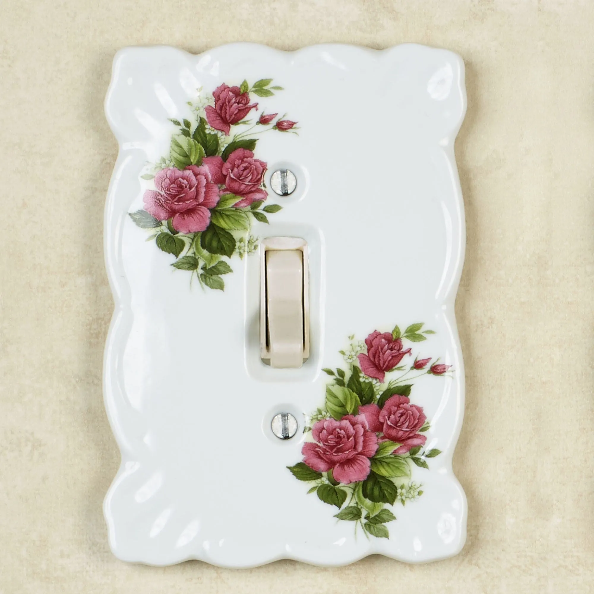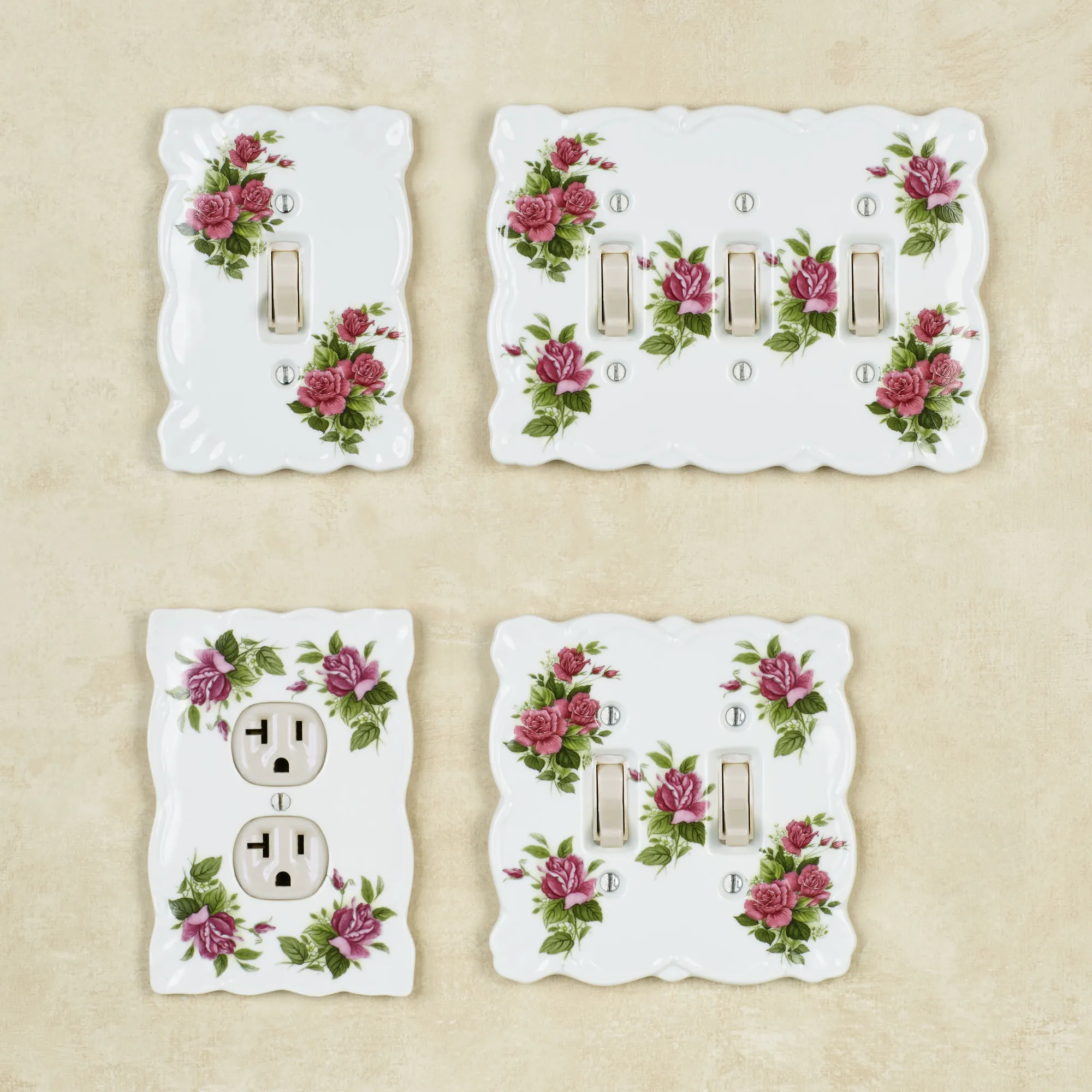 The lovely Ellie Rose Switchplates add a subtle touch of floral elegance to your home. Handcrafted, white porcelain switchplates feature a scalloped perimeter and a face of clusters of roses, rosebuds, and greenery in shades of pink, burgundy, and green with a decal finish. Specify Single Switch, 3.5"x5"; Double Switch, 5"x5"; Triple Switch, 7"x5"; or Single Outlet, 3.5"x5". Do not over-tighten screws.