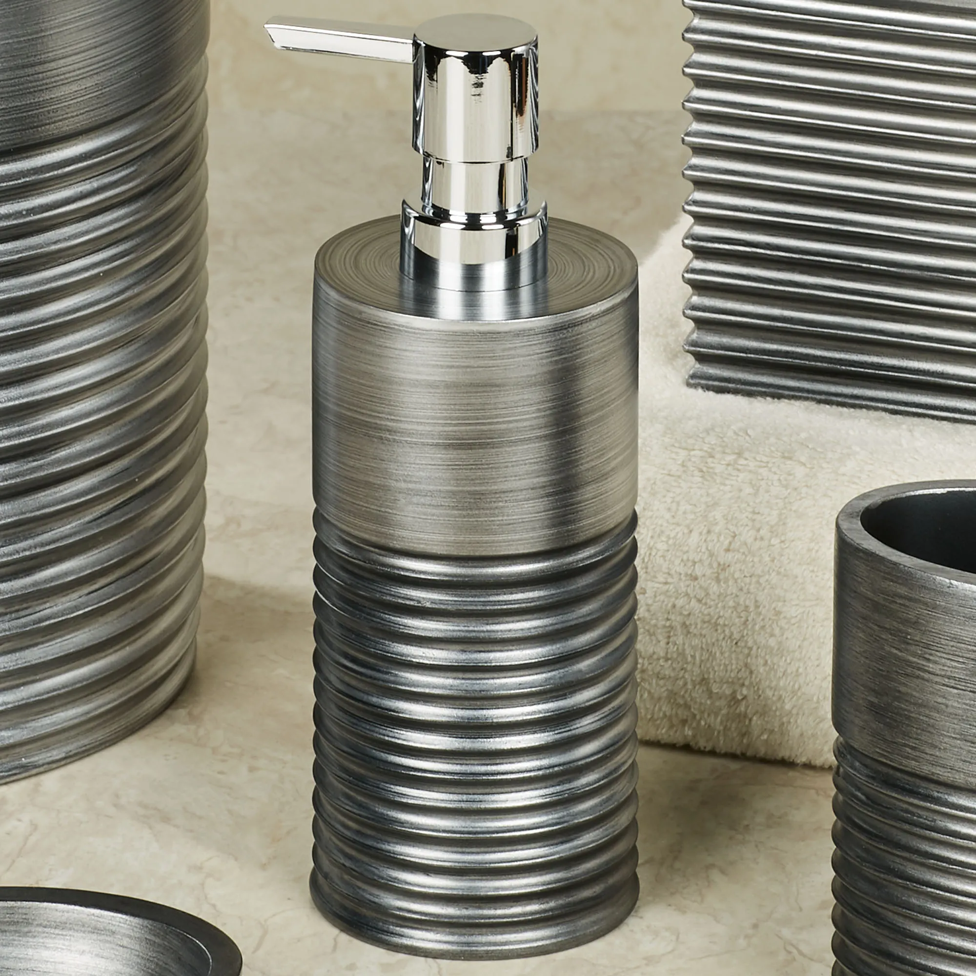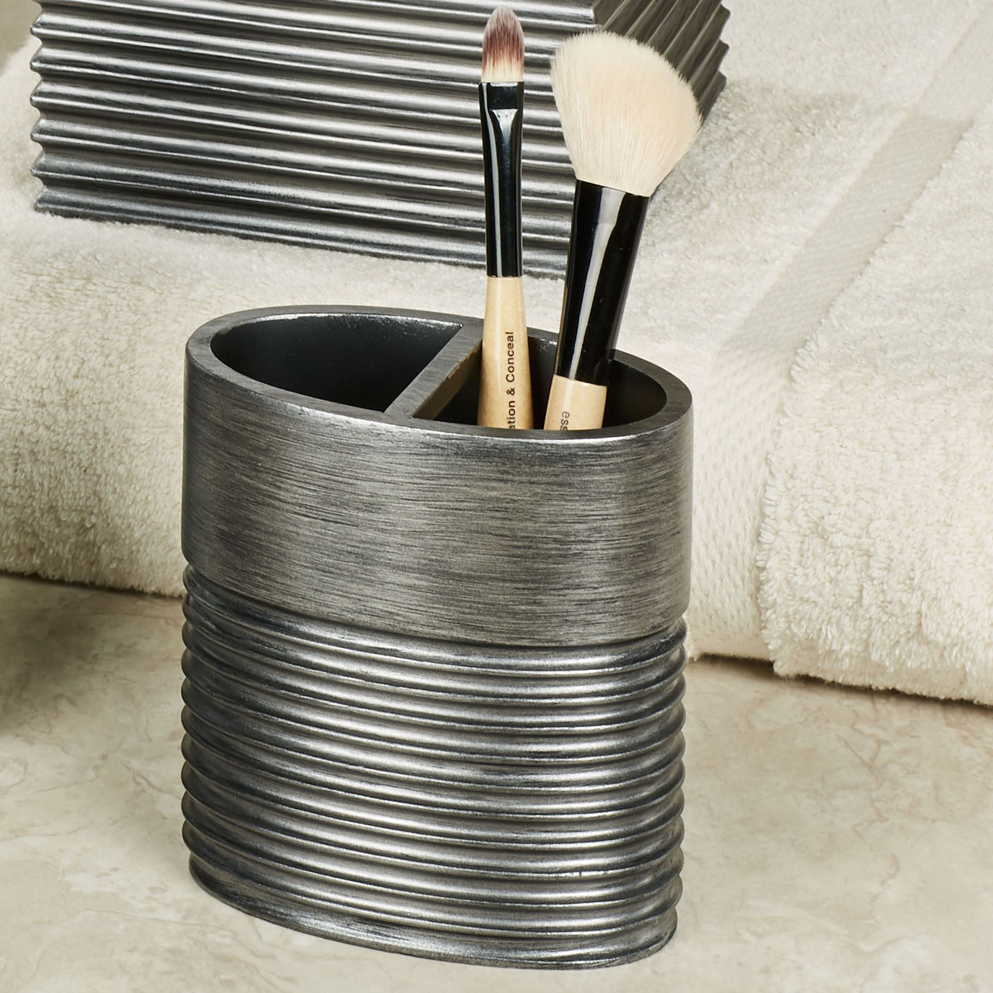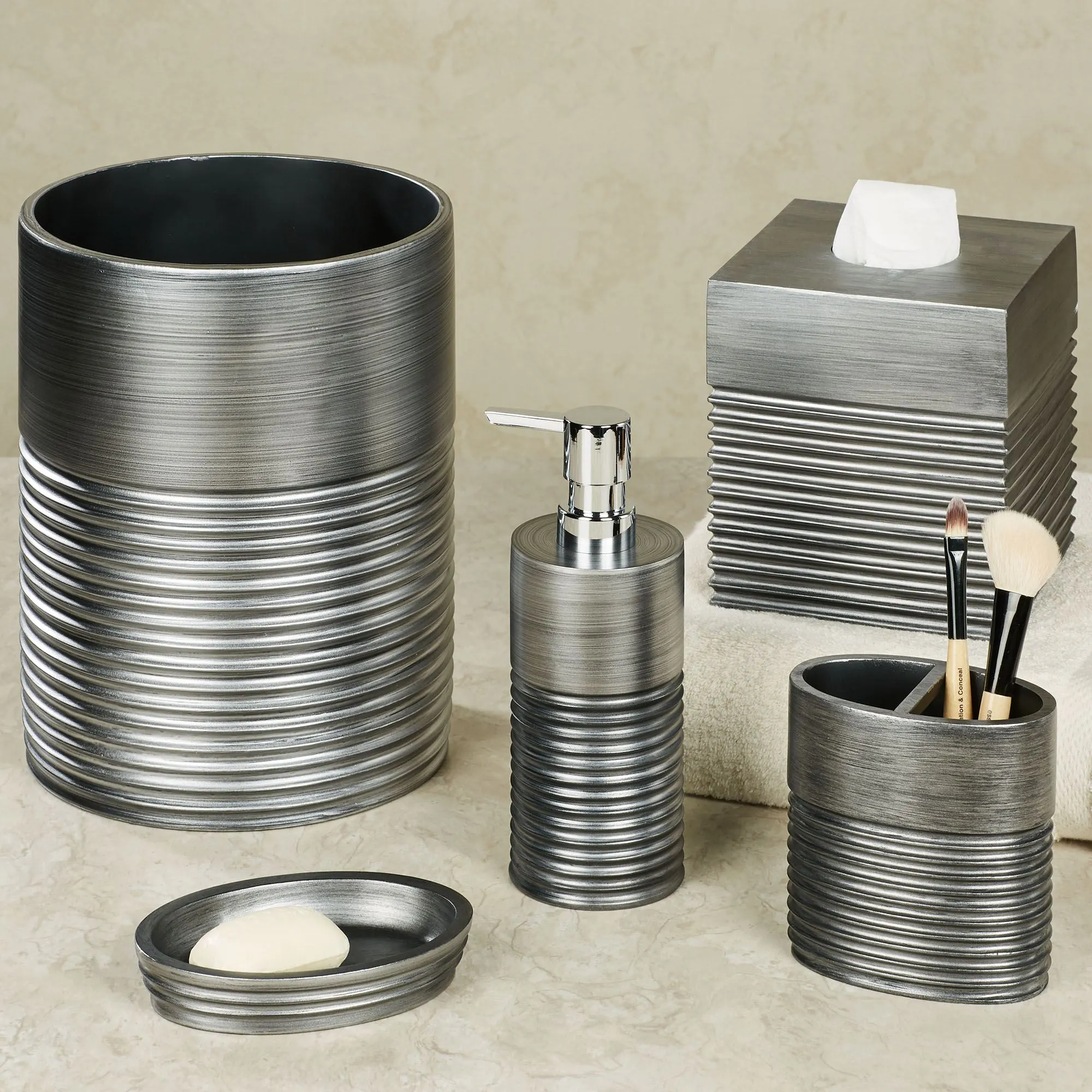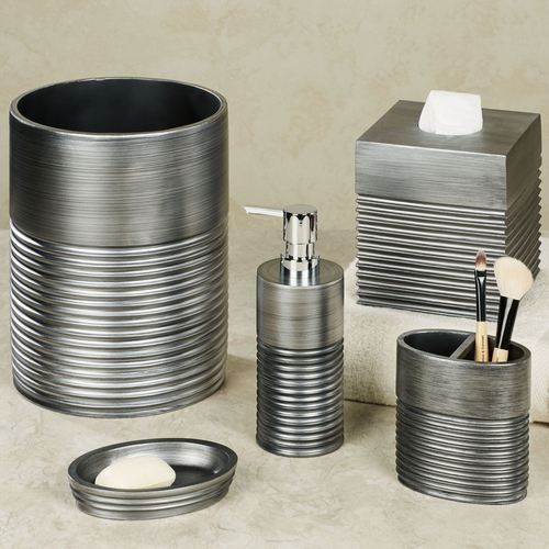 Decorate with the contemporary luxe look of the Ellis Bath Accessories. These handpainted resin accents have ribbed accents and a silver finish. The Brush Holder can hold toothbrushes or makeup brushes. Choose Brush Holder or Soap Dish. Sorry, the rest of the accessories are no longer available.