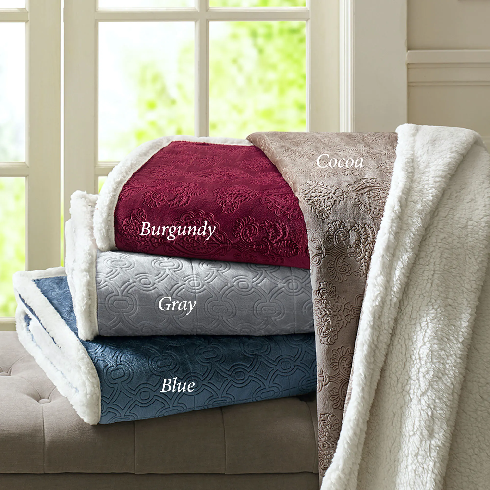 Snuggle up with the cozy comfort of the Elma Plush Throw. From Madison Park, the ultra-soft plush throw blanket features a dimensional embossed micro velour polyester in a rich solid color. Blue and Gray have a stylish geometric chain-link design. Burgundy and Cocoa have timeless damask medallions. The micro berber polyester backing is ivory, covers the bound edges, and creates a supremely soft warmth. Perfect for your couch, chair, or bed, the oversized throw measures 60"x70". Machine washable. Imported.