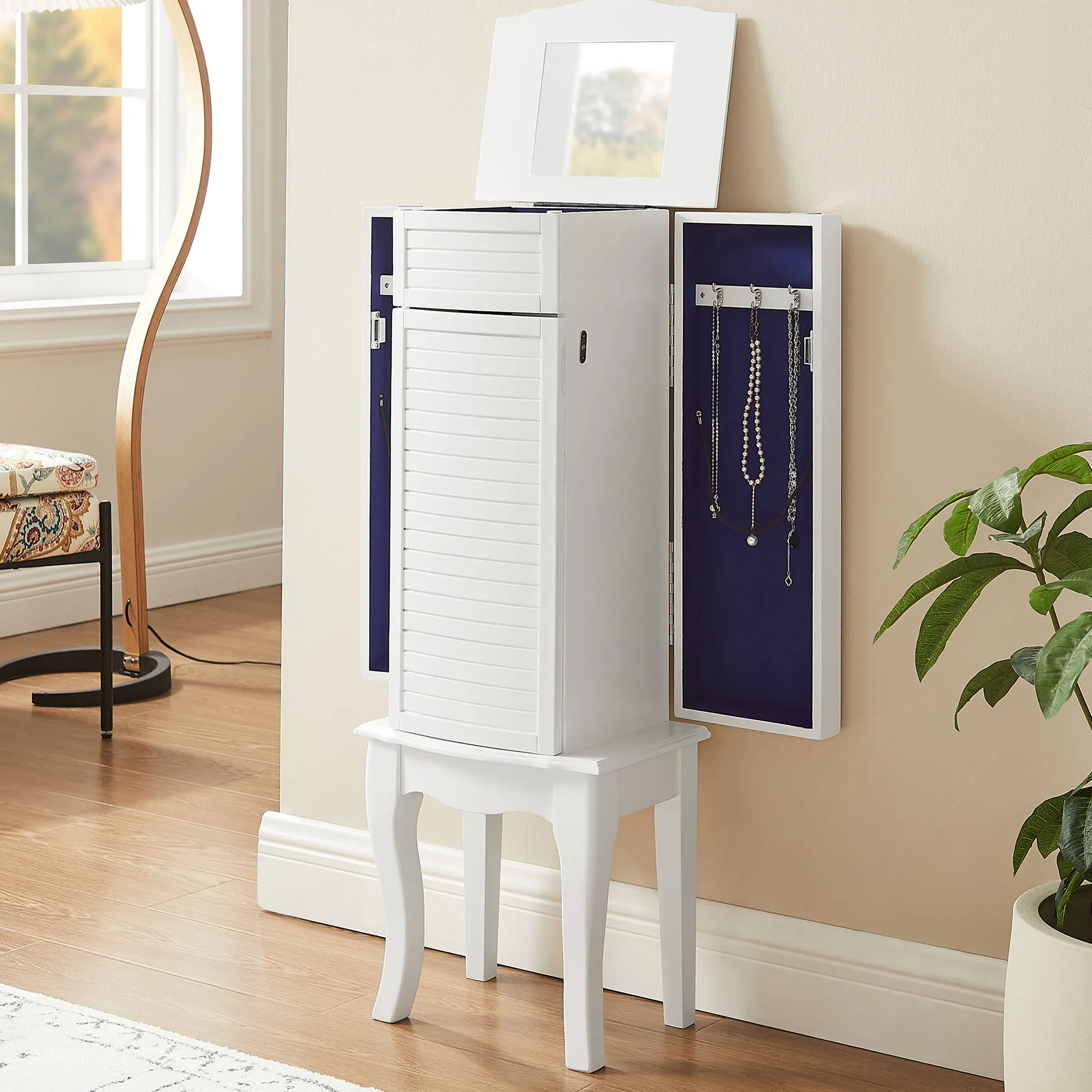 Store your collection within the unassuming charm of the Elna Jewelry Armoire. Lined with deep blue felt interiors, the classic white wooden furnishing features a faux-slatted front that opens to reveal a multitude of storage drawers, while the top and side panels open to provide even more organizational space. With hooks for your long necklaces, each door features storage space. The top securely lifts and locks to reveal a mirror and divided storage space complete with ring compartments. Click on the Sizes tab to view the full measurement details. Overall, the jewelry storage cabinet measures 13"Wx9.5"Dx35.5"H and weighs approx. 27 lbs. Spot clean the fabric.