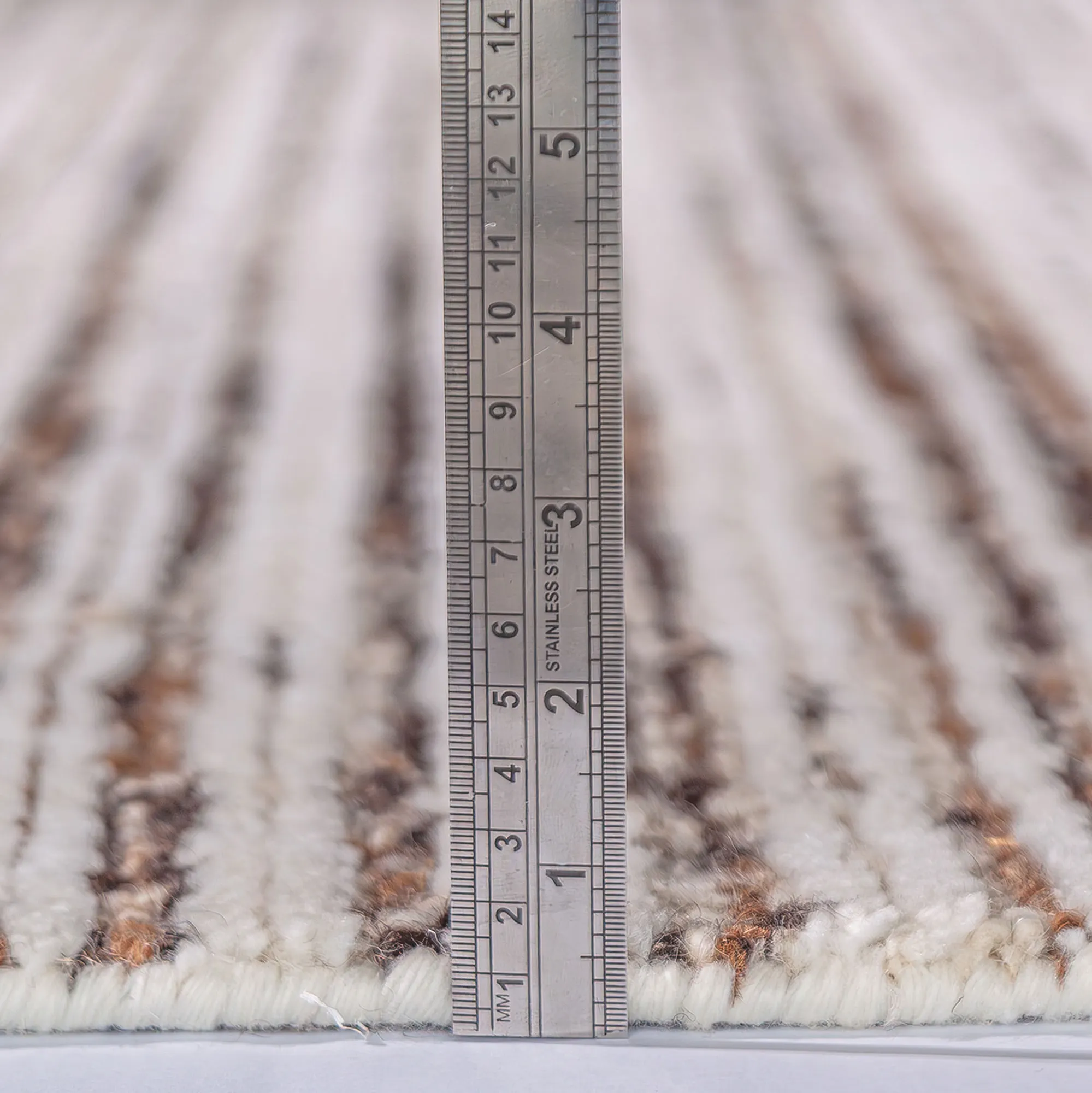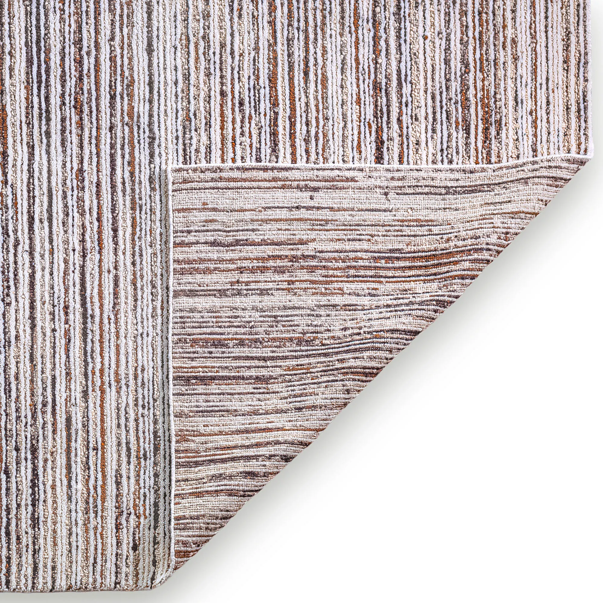 Neutral shades and rich texture pattern the Elwood Rug with an inviting style. Hand-knotted from pure wool, the .5" thick area rug features shades of ivory, cream, taupe, brown, gray, espresso, and black throughout the linear textured stripe designs. Backing is cotton. We recommend professional cleaning by a rug cleaner. Imported.