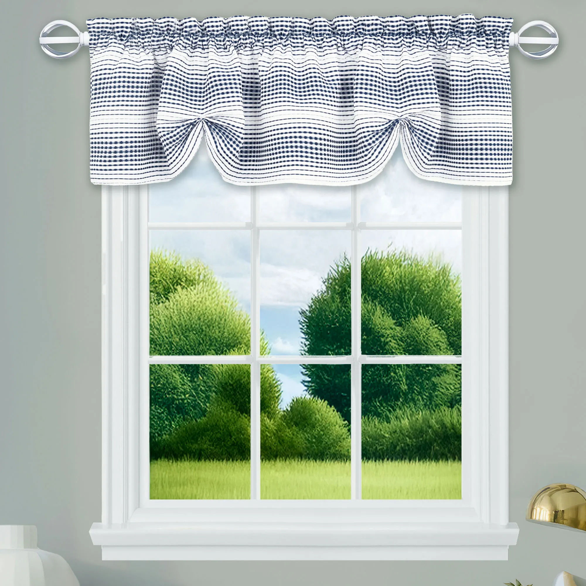 Trim your view with the delightful texture of the Elysian Window Treatment. With a sophisticated ombre look, the jacquard-woven polyester window designs feature gradient stripes in white and solid hues. A dimensional waffle weave adds depth and a traditional touch. Rod pockets measure 1.5". Curtain Pair measures 84"Wx84"L; each panel is 42"W. Shaped Valance has two gathers; measures 58"Wx14"L. Machine washable. Imported. The curtain pair width is the total width of two panels together.