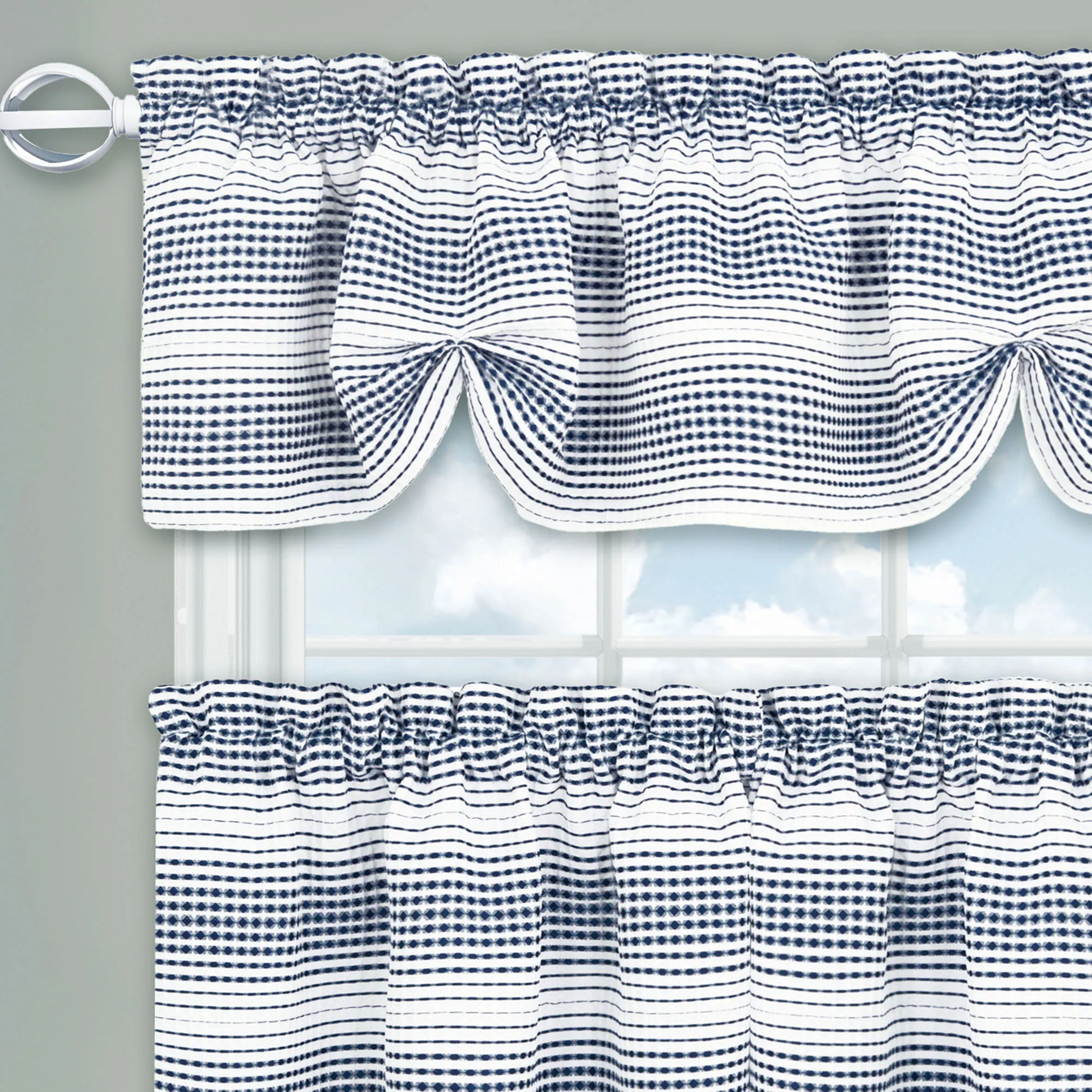 Trim your view with the delightful texture of the Elysian Tier and Valance Set. With a sophisticated ombre look, the jacquard-woven polyester window treatment feature gradient stripes in white and solid hues. A dimensional waffle weave adds depth and a traditional touch. Rod pockets measure 1.5". The tier and valance set includes two tiers and one shaped valance. Overall, the tiers are 58"W. Valance has two gathers; measures 58"Wx14"L. Machine washable. Imported.