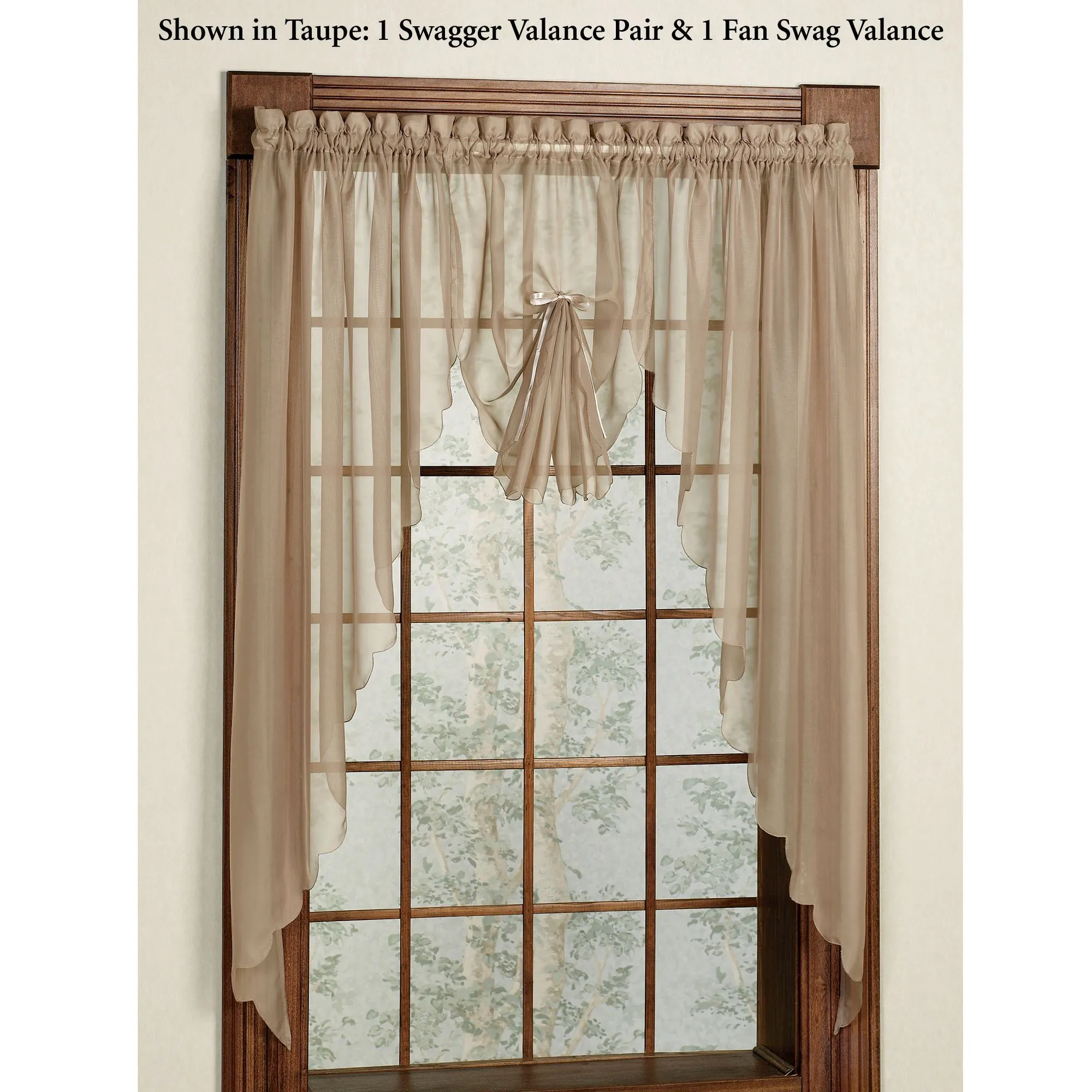 The solid color, polyester voile Emelia Sheer Window Treatment will bring a touch of elegance to your room. Specify Swag Valance Pair, Curtain Panel, or Insert Valance. Panel is available in four lengths. Swagger Valance Pair and Fan Swag Valance are also available. Valances have scalloped edges. Specify White, Black, Burgundy, Camel, Celadon, Light Amethyst, Taupe, or Pearl. 1.5" rod pockets. Machine wash. Imported.